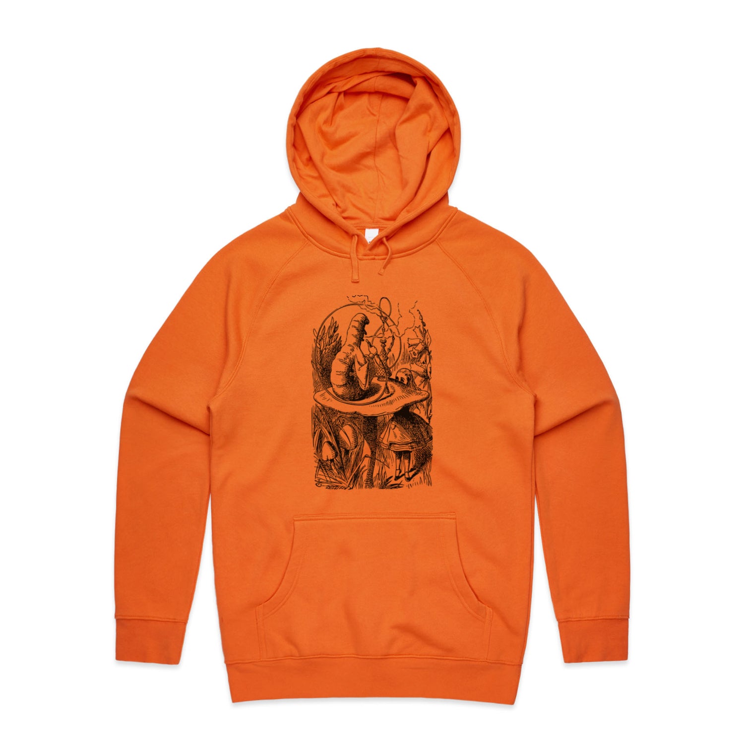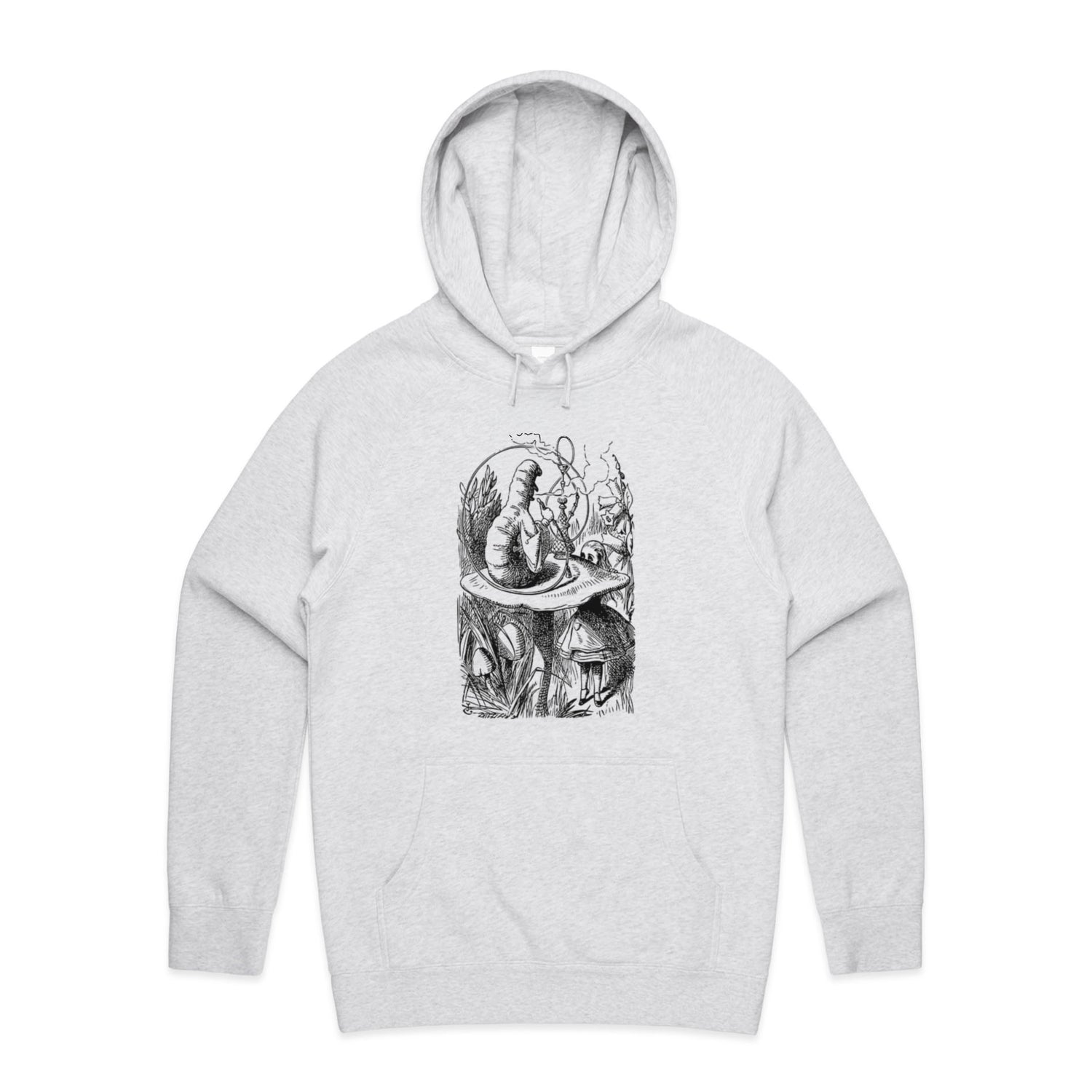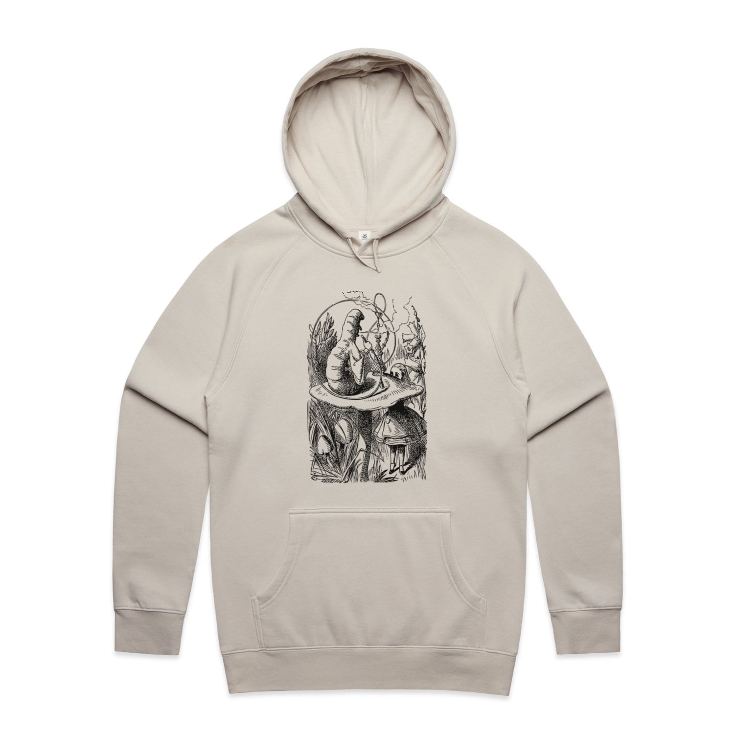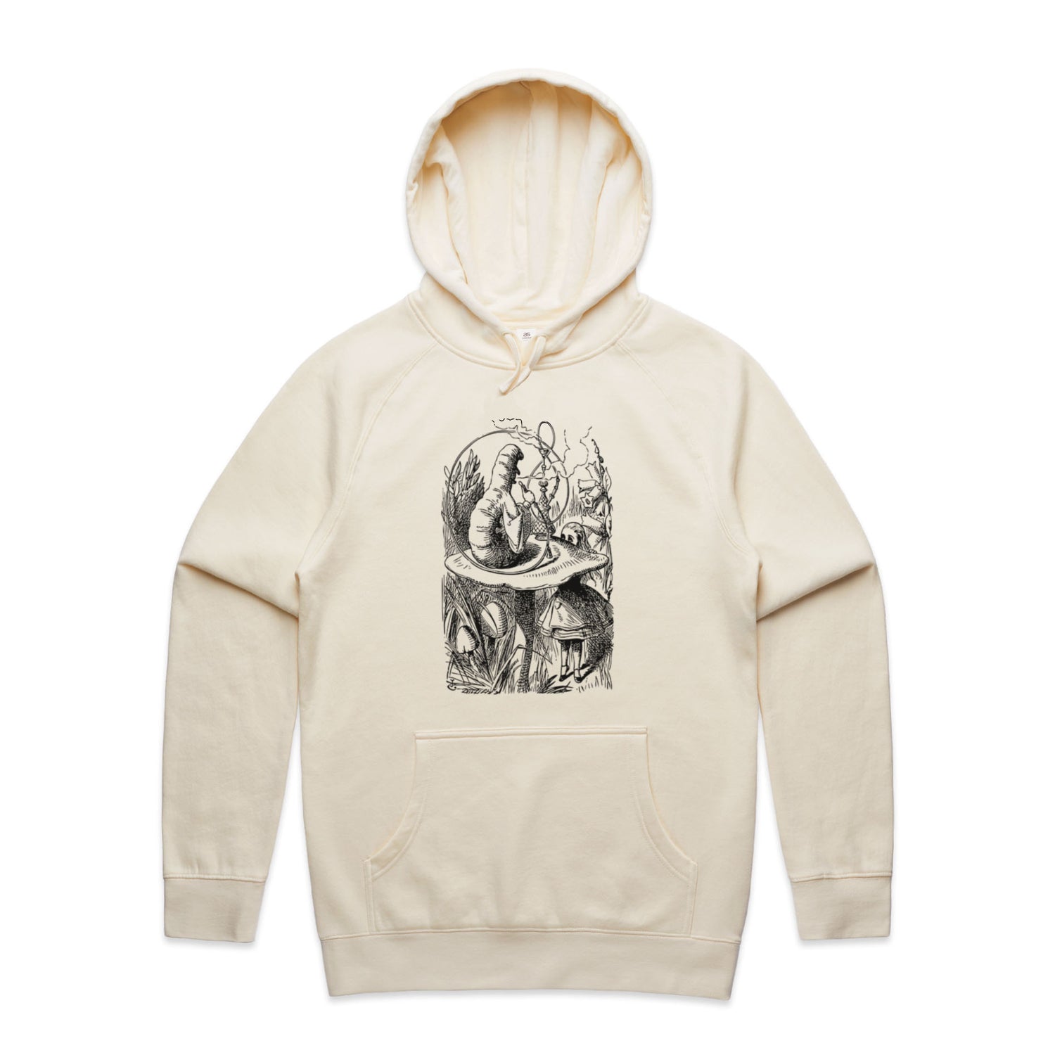 The Hoodies Alice in Wonderland - The Smoking Caterpillar – Men's Hooded Sweatshirt is a high-quality men's hooded sweatshirt, printed with black ink on the trusted AS Colour Supply Hood 5101. With a regular fit and mid-weight feel, it's crafted from a premium blend of 80% cotton and 20% polyester anti-pill fleece, making it a durable and comfortable staple for any wardrobe. The pullover design features raglan sleeves, a lined hood with tonal drawcord, ribbed sleeve cuffs, and a roomy kangaroo pocket — all designed to keep you warm while looking effortlessly sharp.