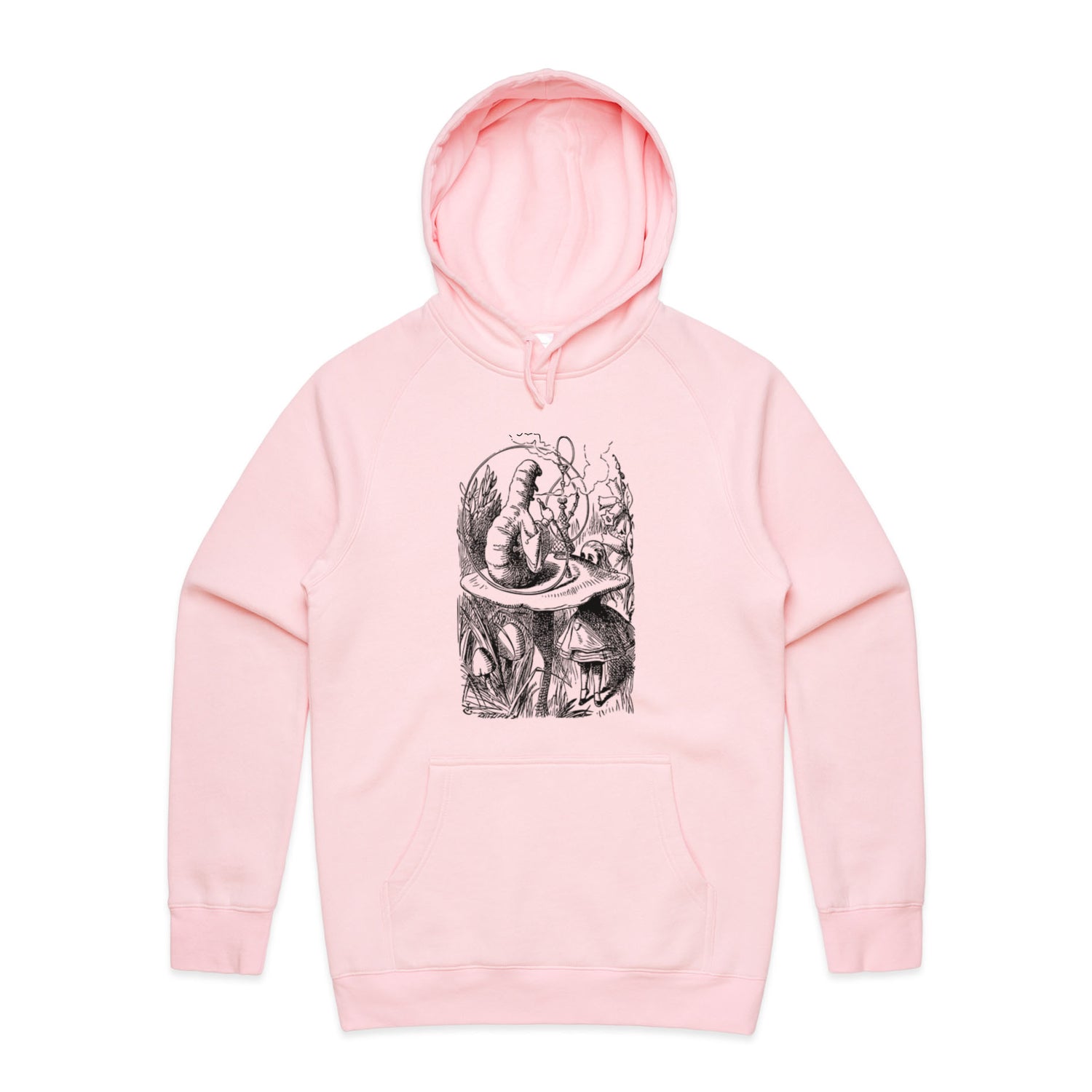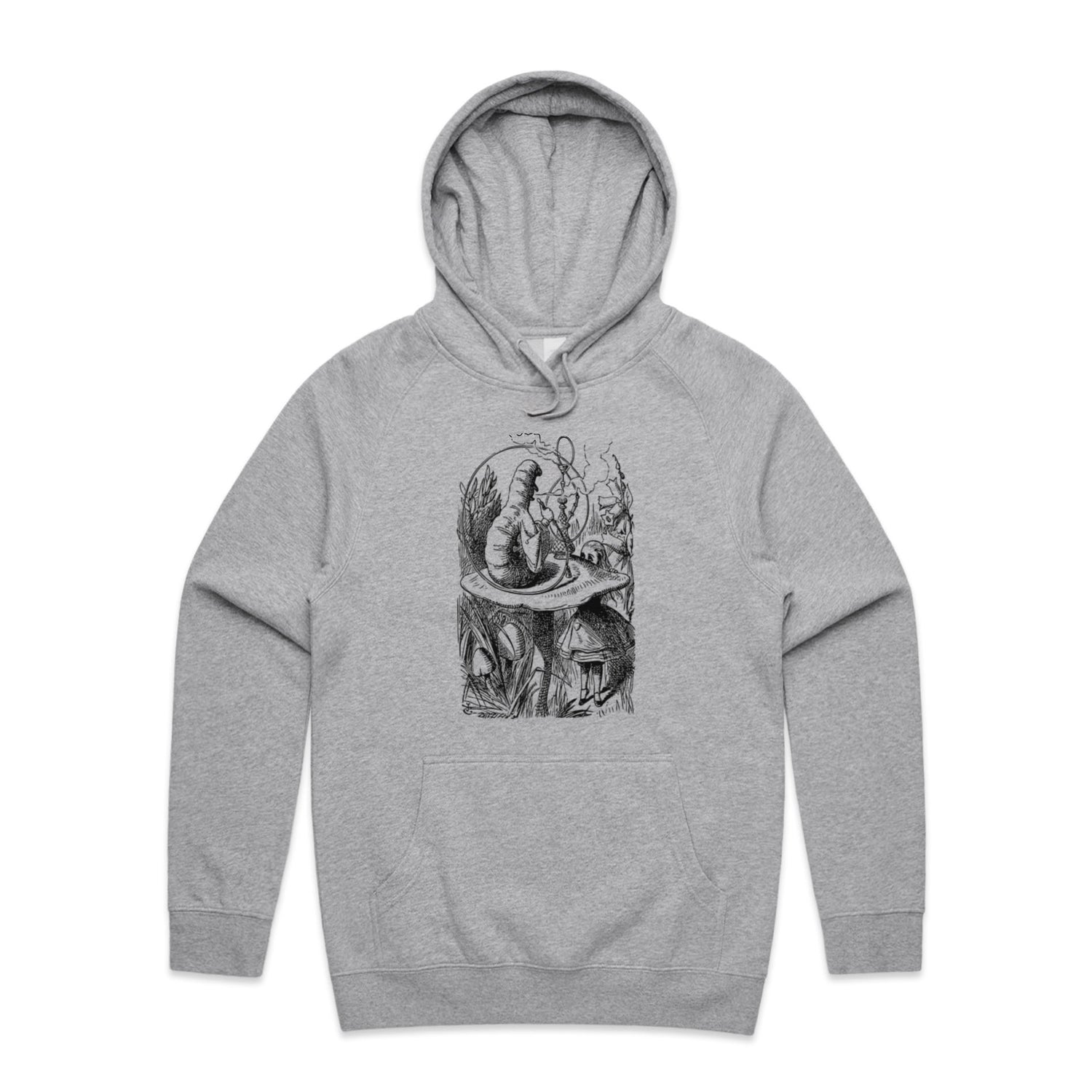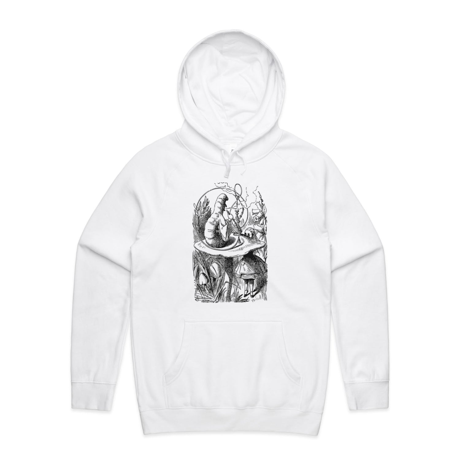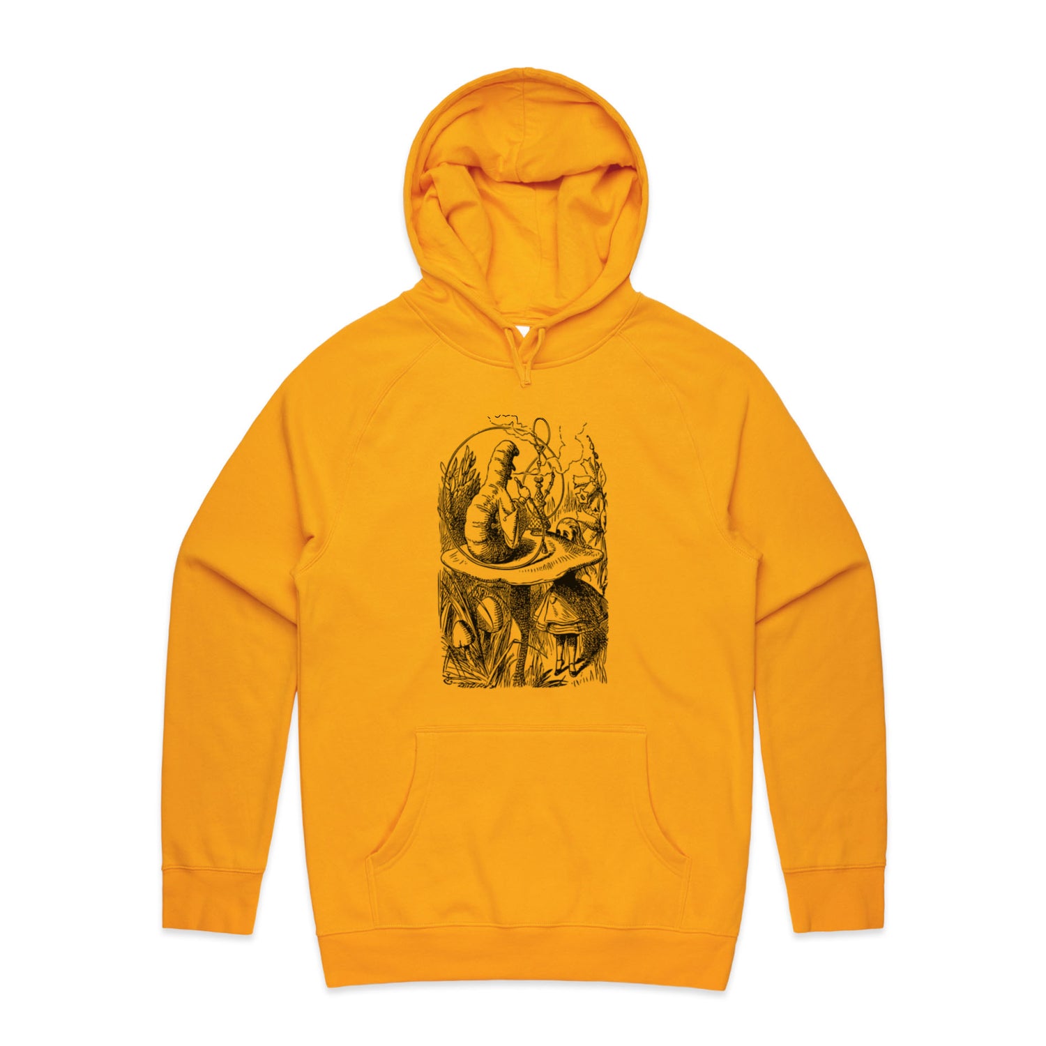 The Hoodies Alice in Wonderland - The Smoking Caterpillar – Men's Hooded Sweatshirt is a high-quality men's hooded sweatshirt, printed with black ink on the trusted AS Colour Supply Hood 5101. With a regular fit and mid-weight feel, it's crafted from a premium blend of 80% cotton and 20% polyester anti-pill fleece, making it a durable and comfortable staple for any wardrobe. The pullover design features raglan sleeves, a lined hood with tonal drawcord, ribbed sleeve cuffs, and a roomy kangaroo pocket — all designed to keep you warm while looking effortlessly sharp.