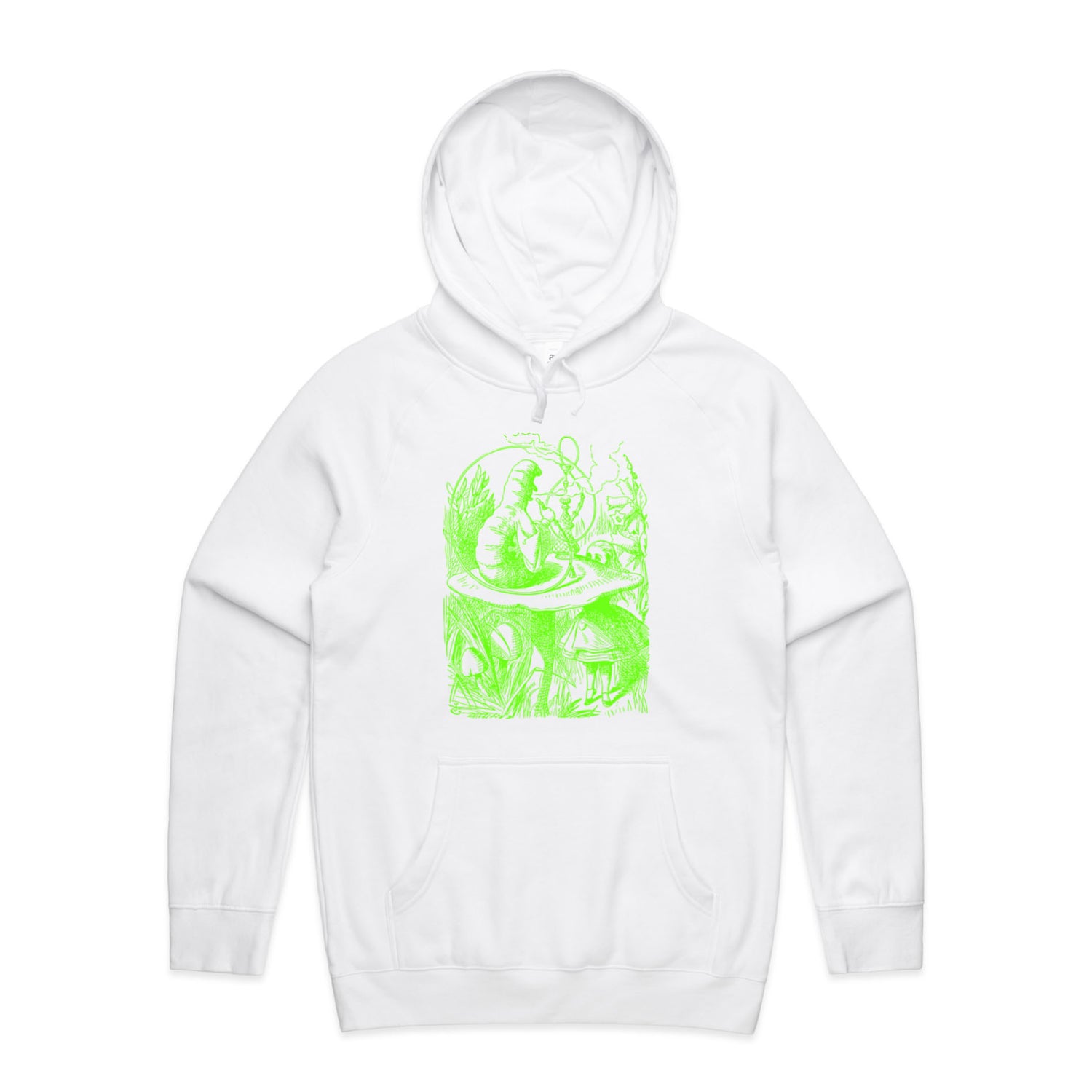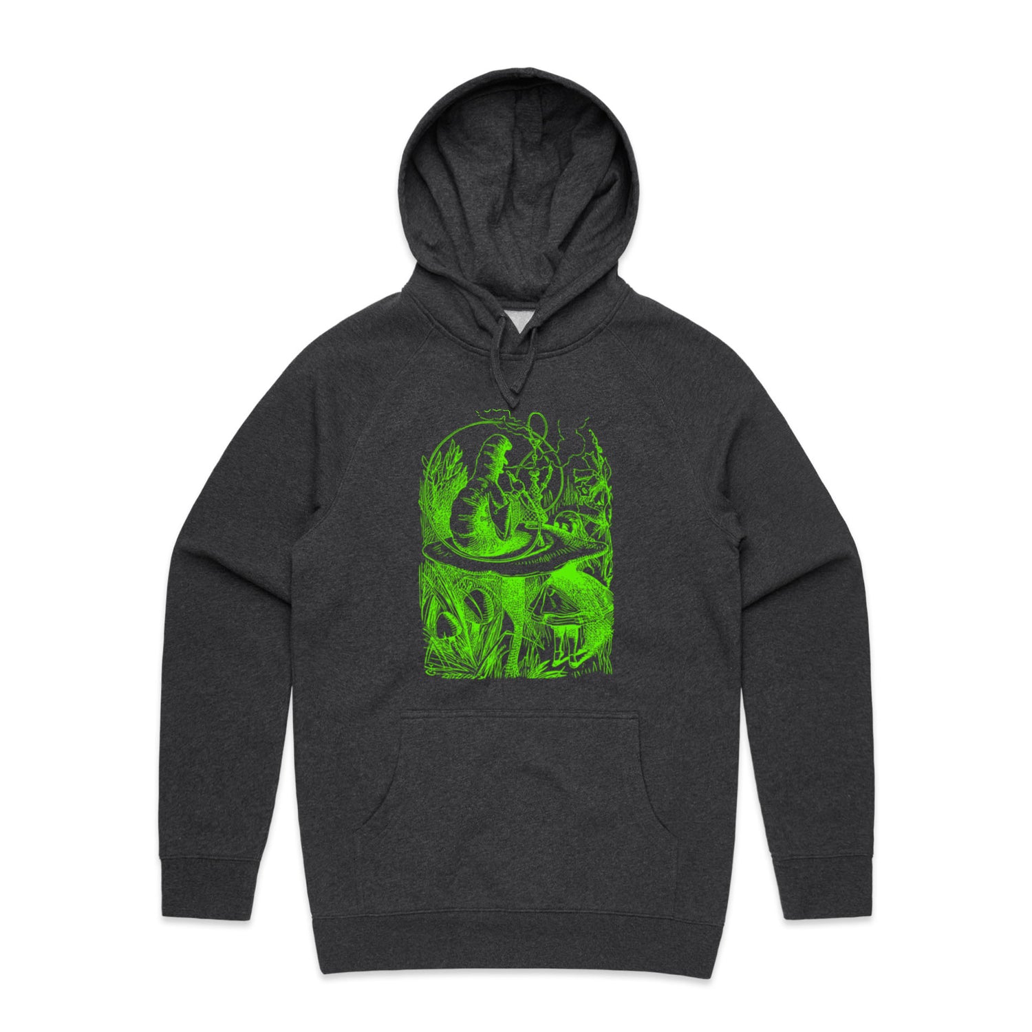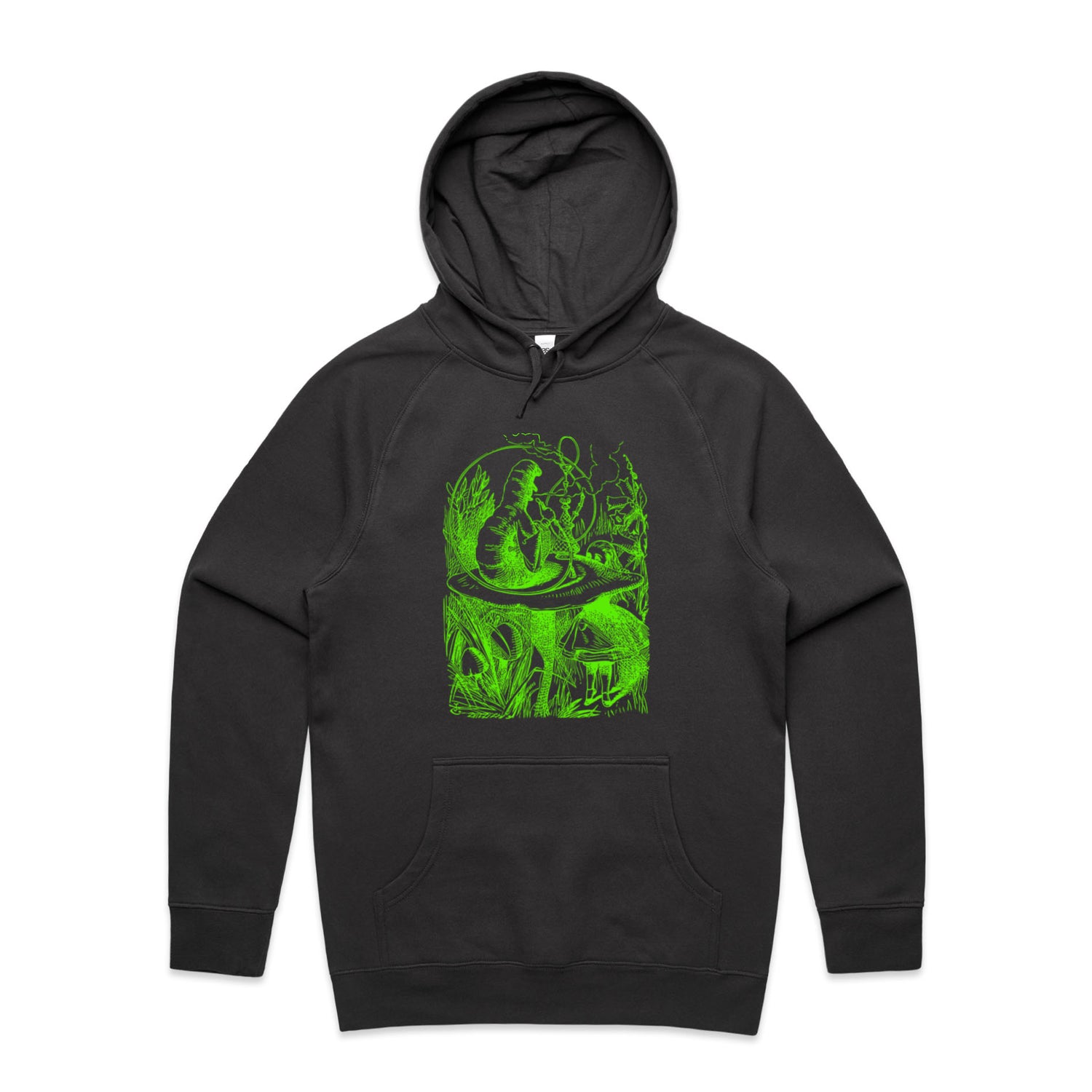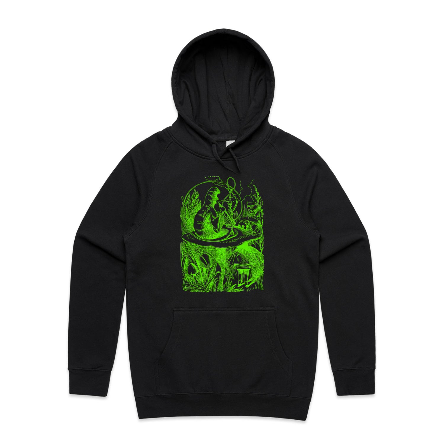 The Hoodies Alice in Wonderland - The Smoking Caterpillar – Men's Hooded Sweatshirt is a high-quality men's hooded sweatshirt, printed with bright green ink on the trusted AS Colour Supply Hood 5101. With a regular fit and mid-weight feel, it's crafted from a premium blend of 80% cotton and 20% polyester anti-pill fleece, making it a durable and comfortable staple for any wardrobe. The pullover design features raglan sleeves, a lined hood with tonal drawcord, ribbed sleeve cuffs, and a roomy kangaroo pocket — all designed to keep you warm while looking effortlessly sharp.