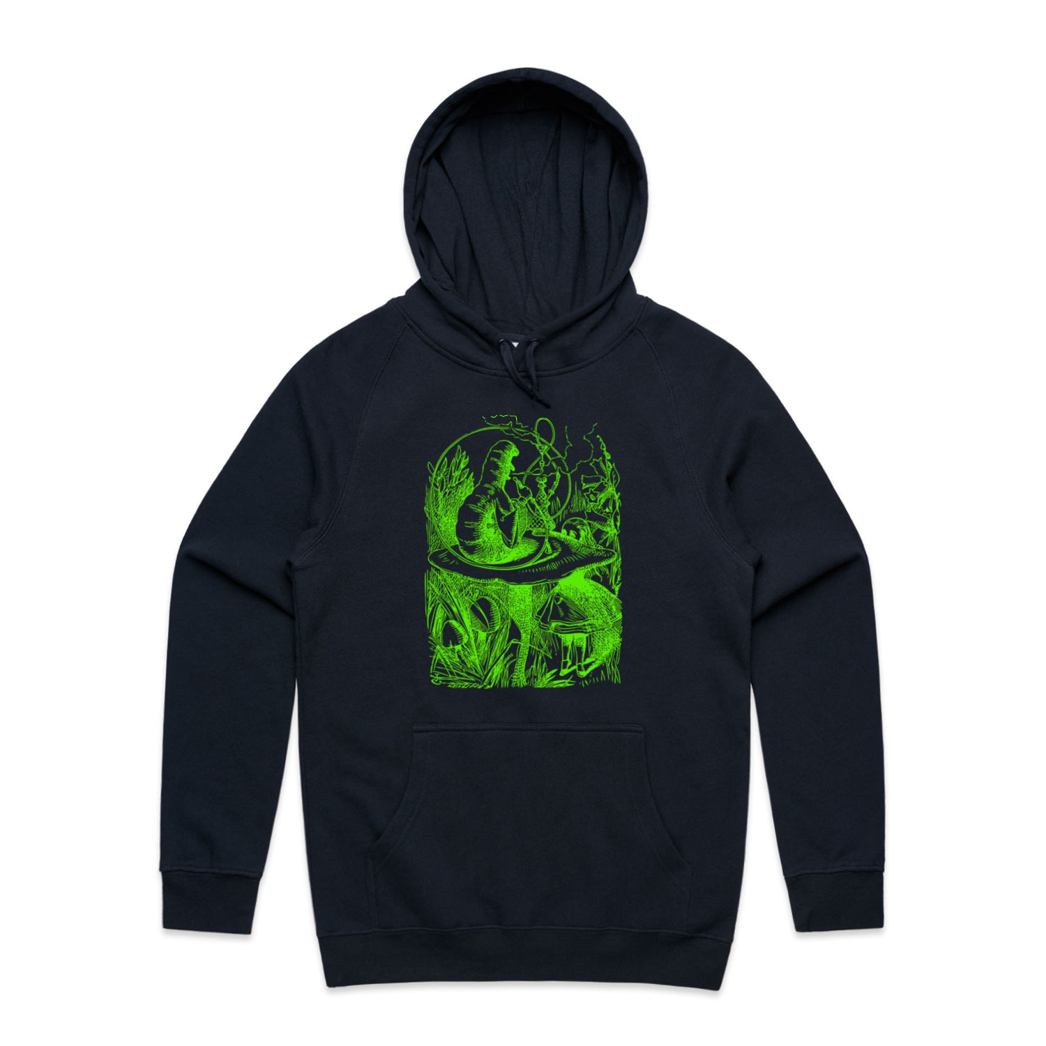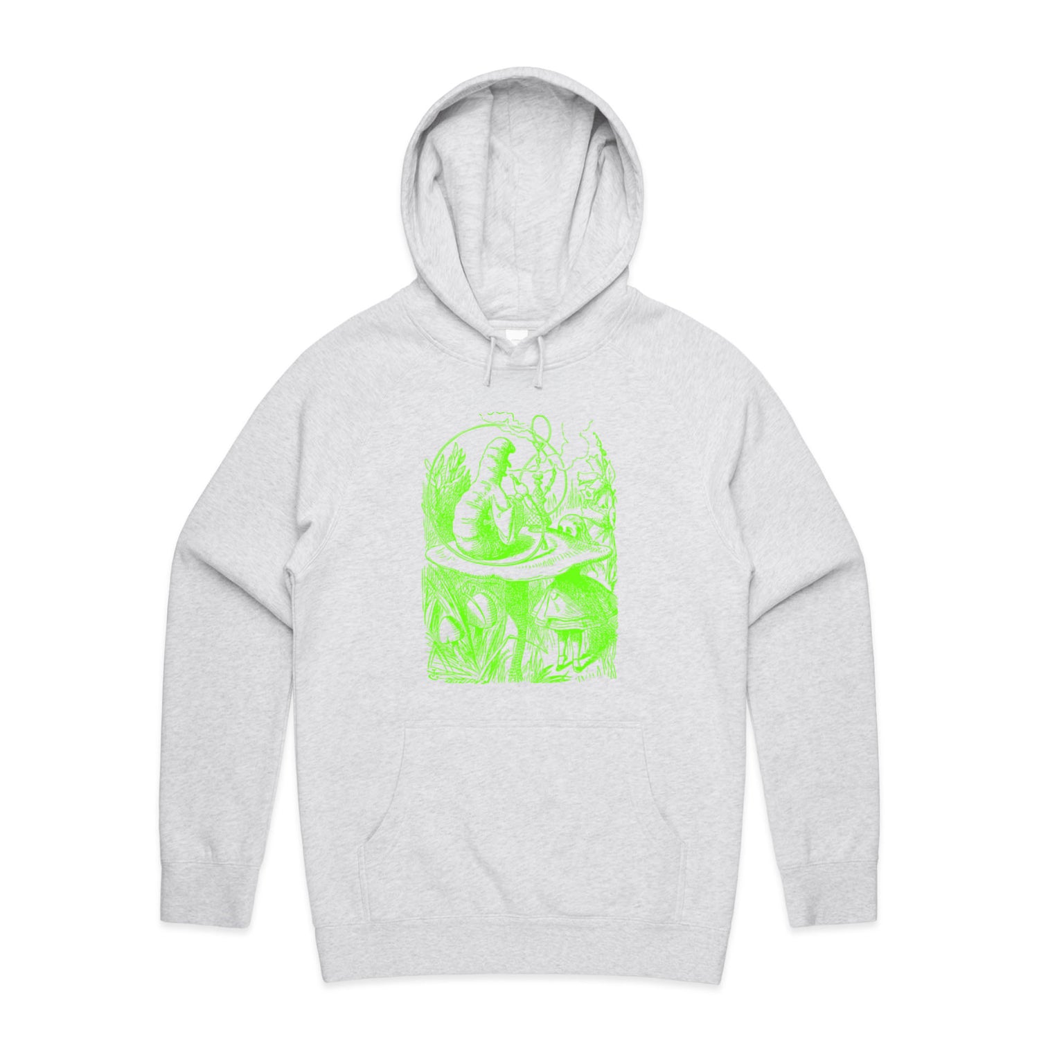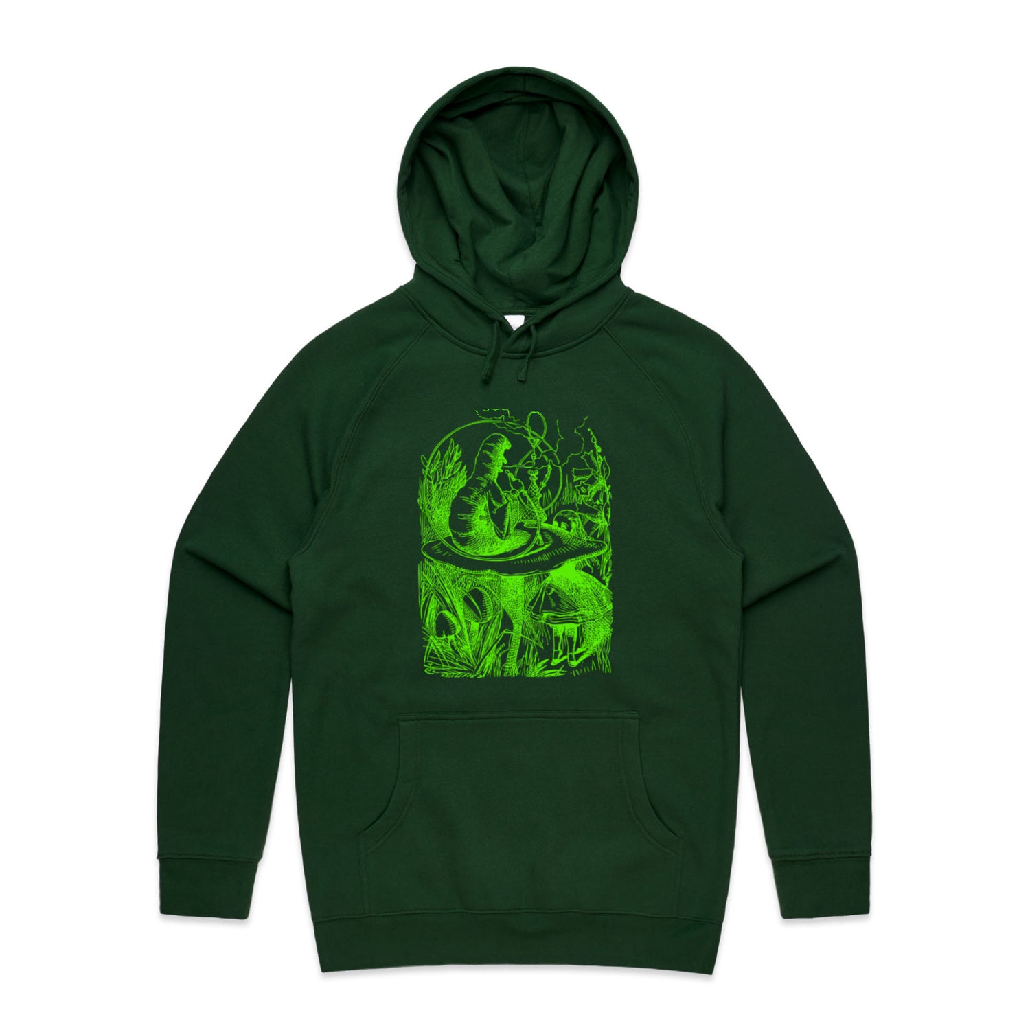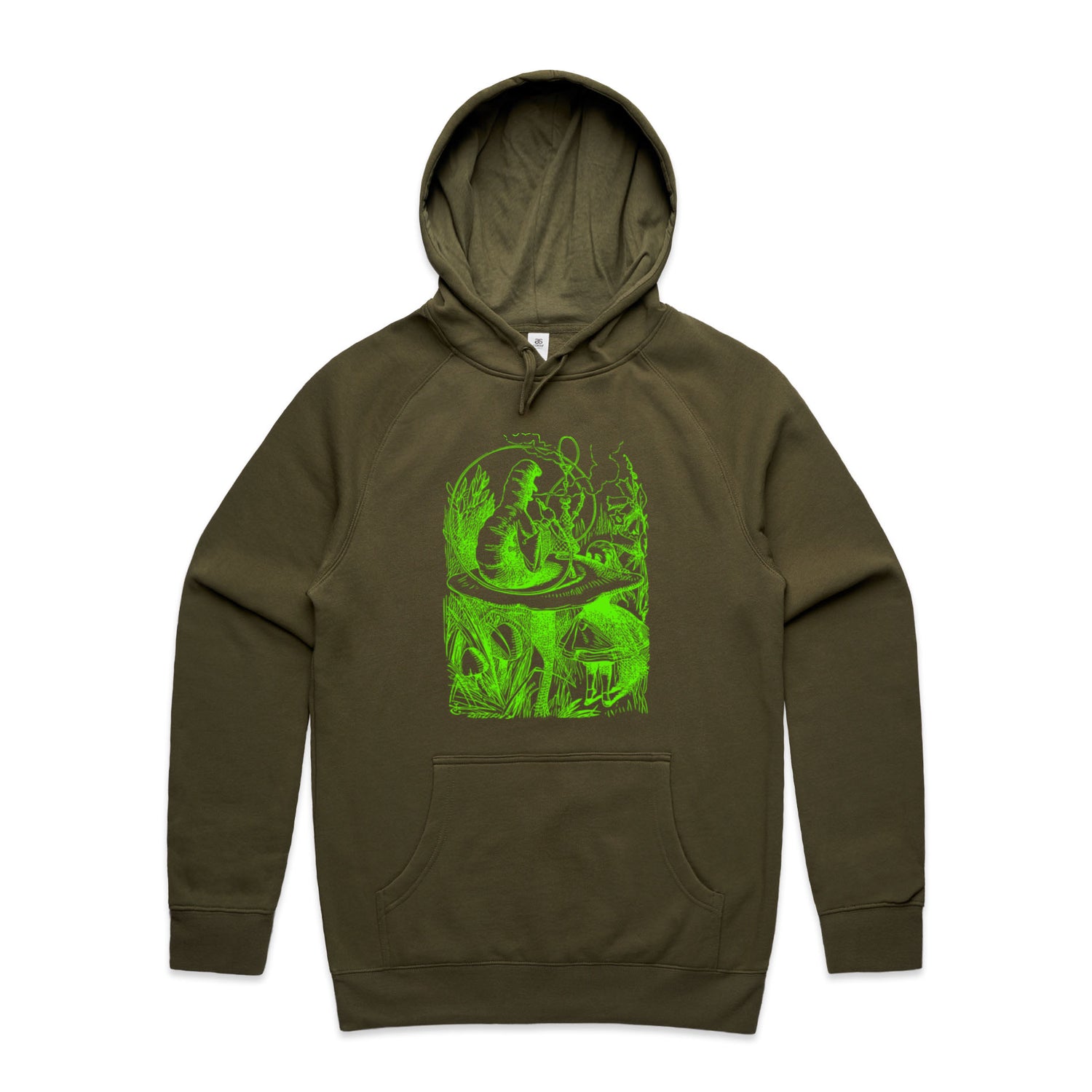 The Hoodies Alice in Wonderland - The Smoking Caterpillar – Men's Hooded Sweatshirt is a high-quality men's hooded sweatshirt, printed with bright green ink on the trusted AS Colour Supply Hood 5101. With a regular fit and mid-weight feel, it's crafted from a premium blend of 80% cotton and 20% polyester anti-pill fleece, making it a durable and comfortable staple for any wardrobe. The pullover design features raglan sleeves, a lined hood with tonal drawcord, ribbed sleeve cuffs, and a roomy kangaroo pocket — all designed to keep you warm while looking effortlessly sharp.