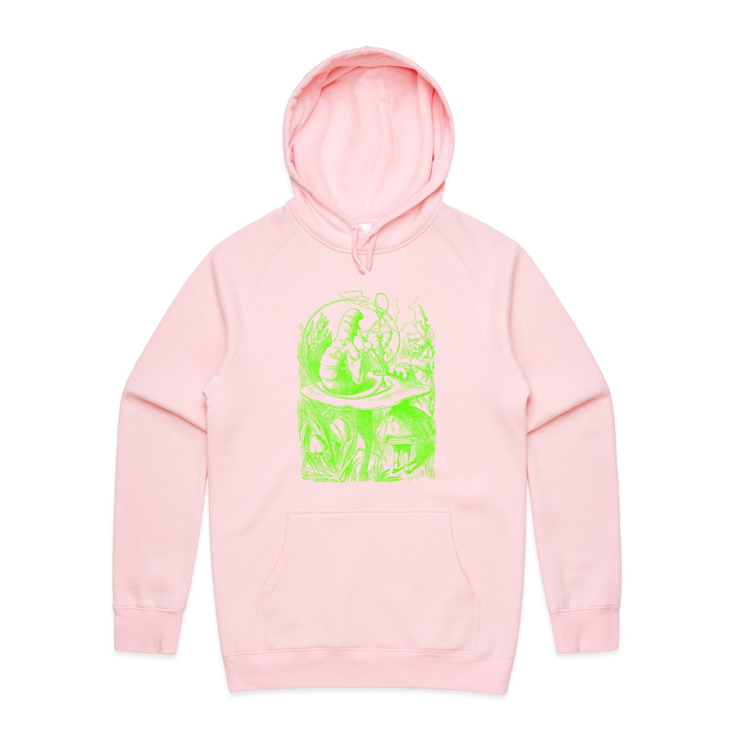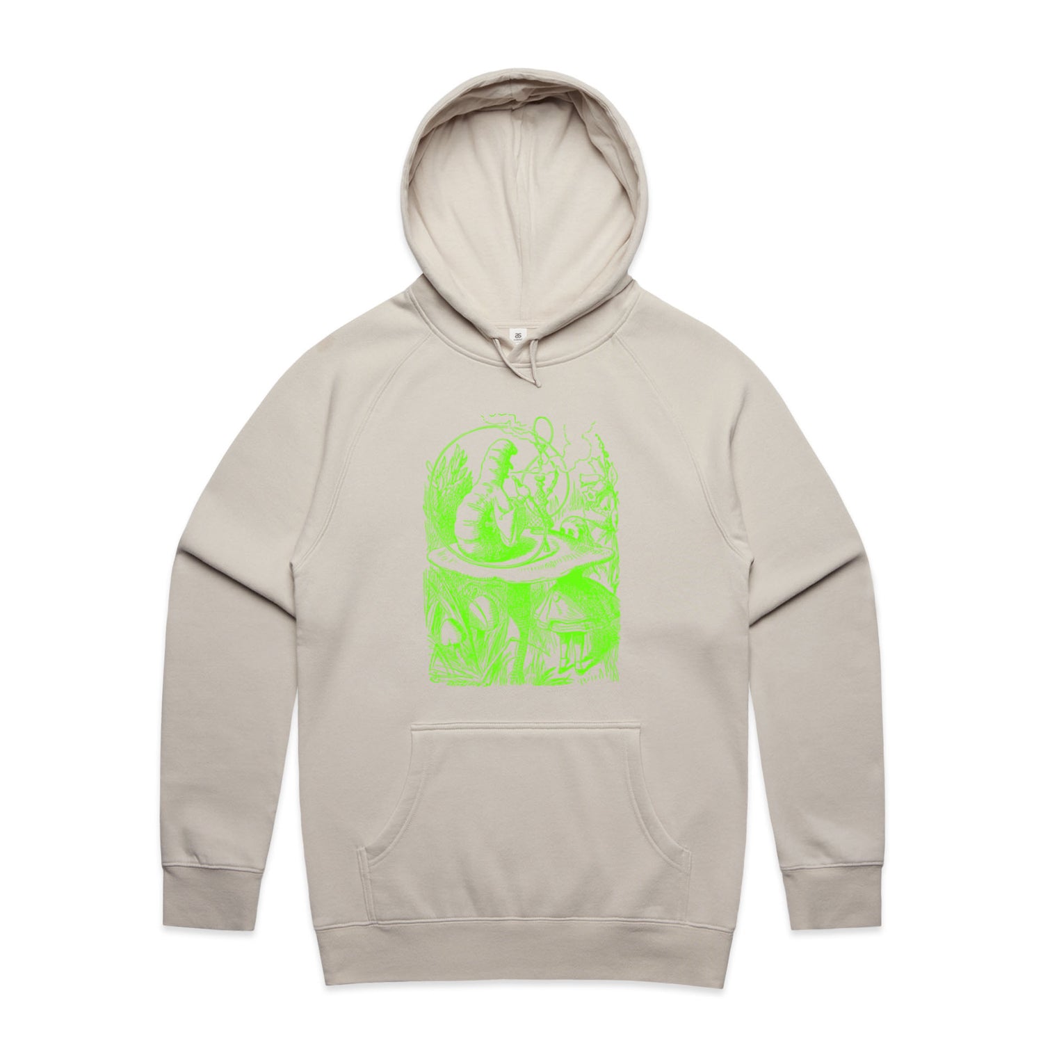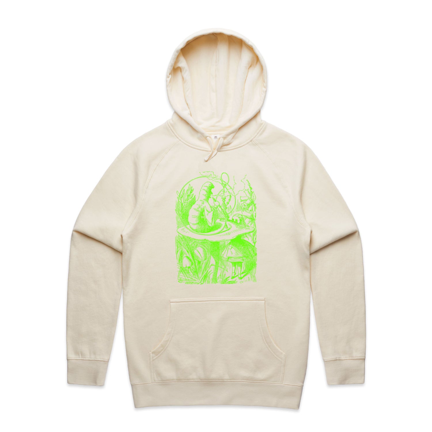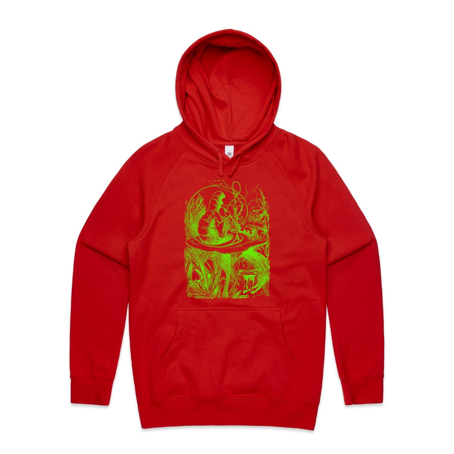 The Hoodies Alice in Wonderland - The Smoking Caterpillar – Men's Hooded Sweatshirt is a high-quality men's hooded sweatshirt, printed with bright green ink on the trusted AS Colour Supply Hood 5101. With a regular fit and mid-weight feel, it's crafted from a premium blend of 80% cotton and 20% polyester anti-pill fleece, making it a durable and comfortable staple for any wardrobe. The pullover design features raglan sleeves, a lined hood with tonal drawcord, ribbed sleeve cuffs, and a roomy kangaroo pocket — all designed to keep you warm while looking effortlessly sharp.