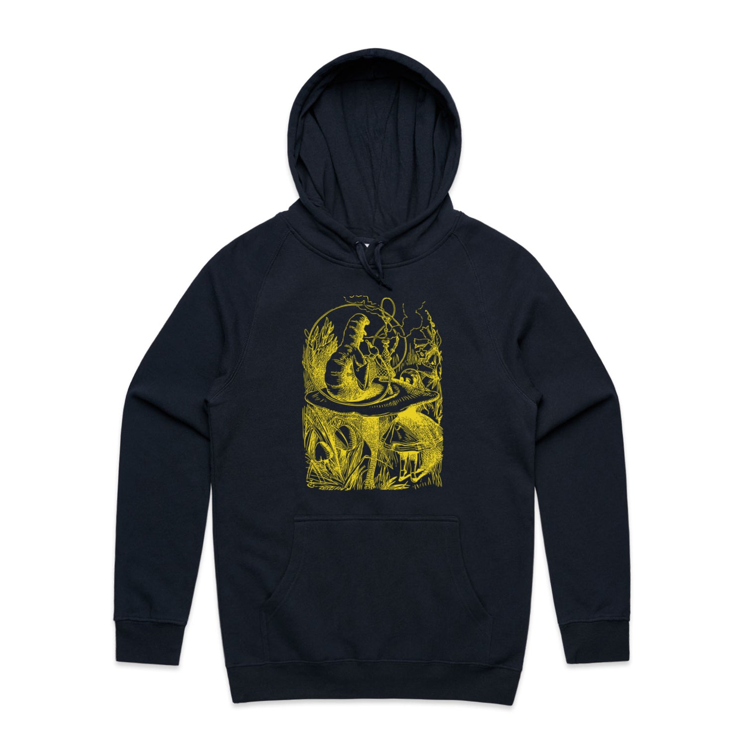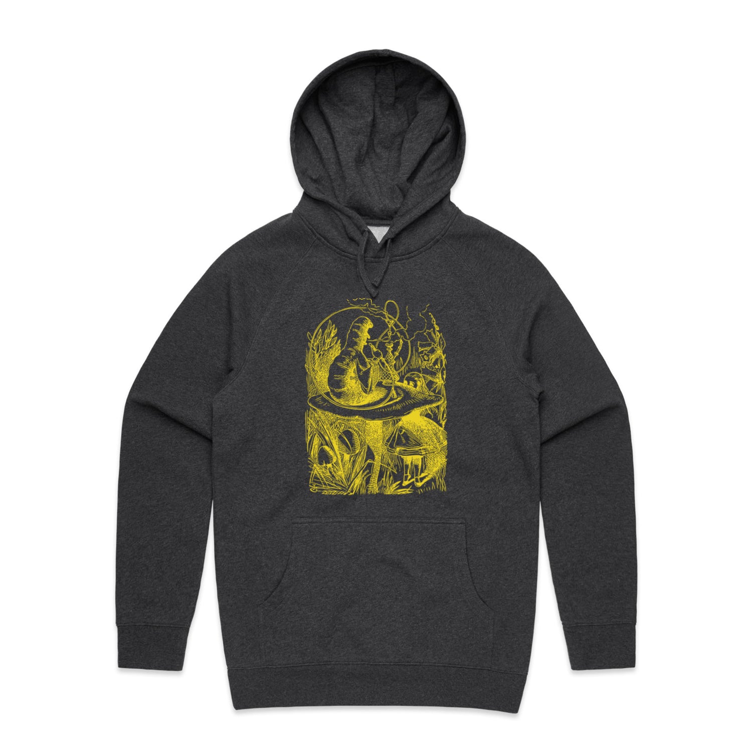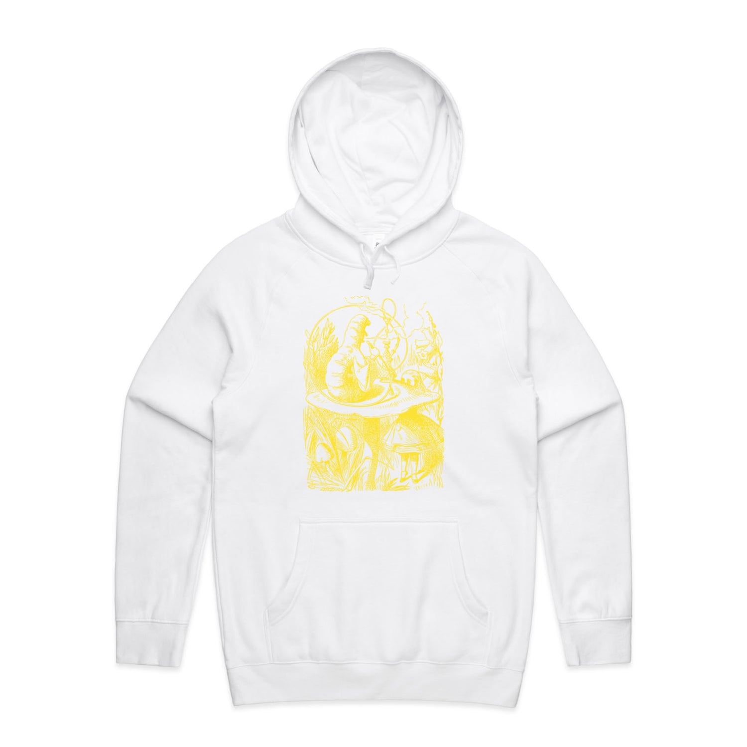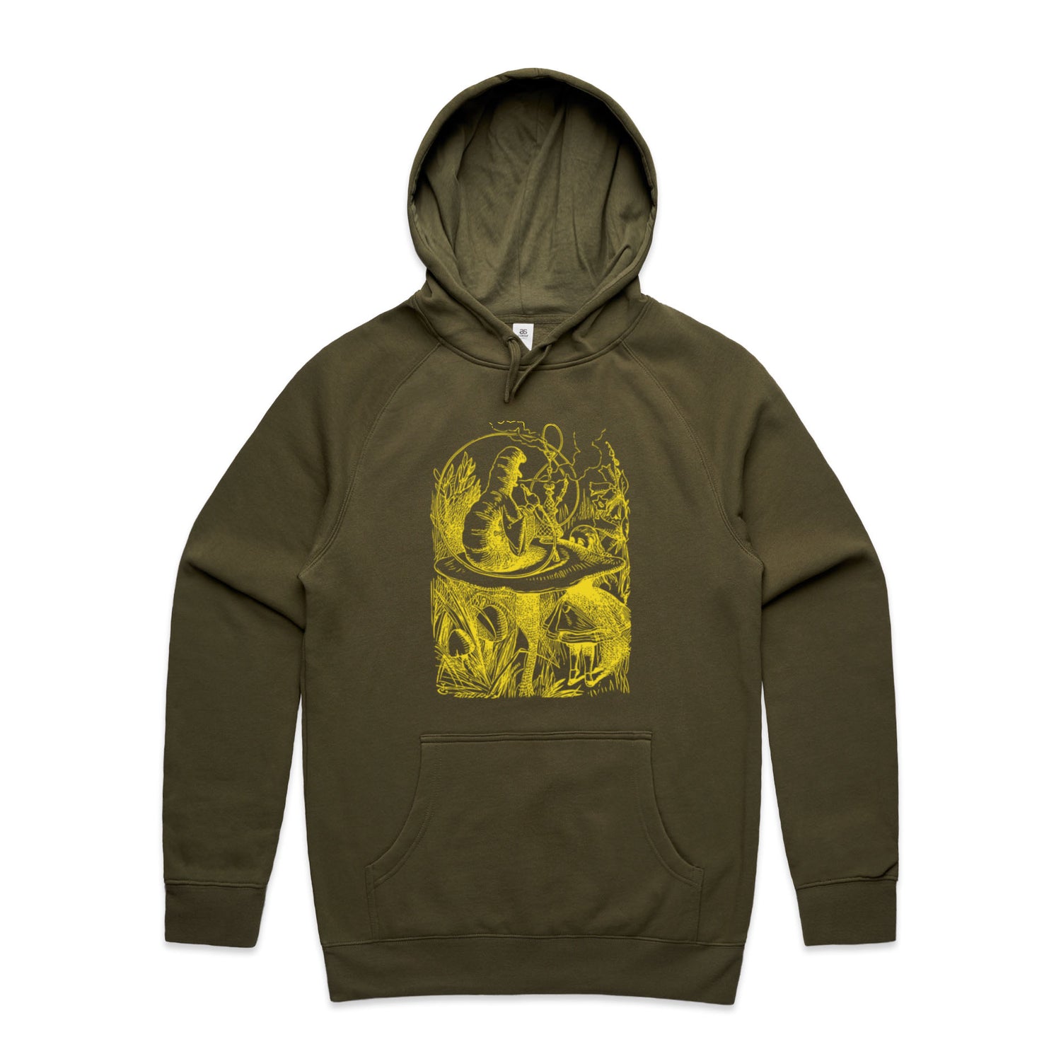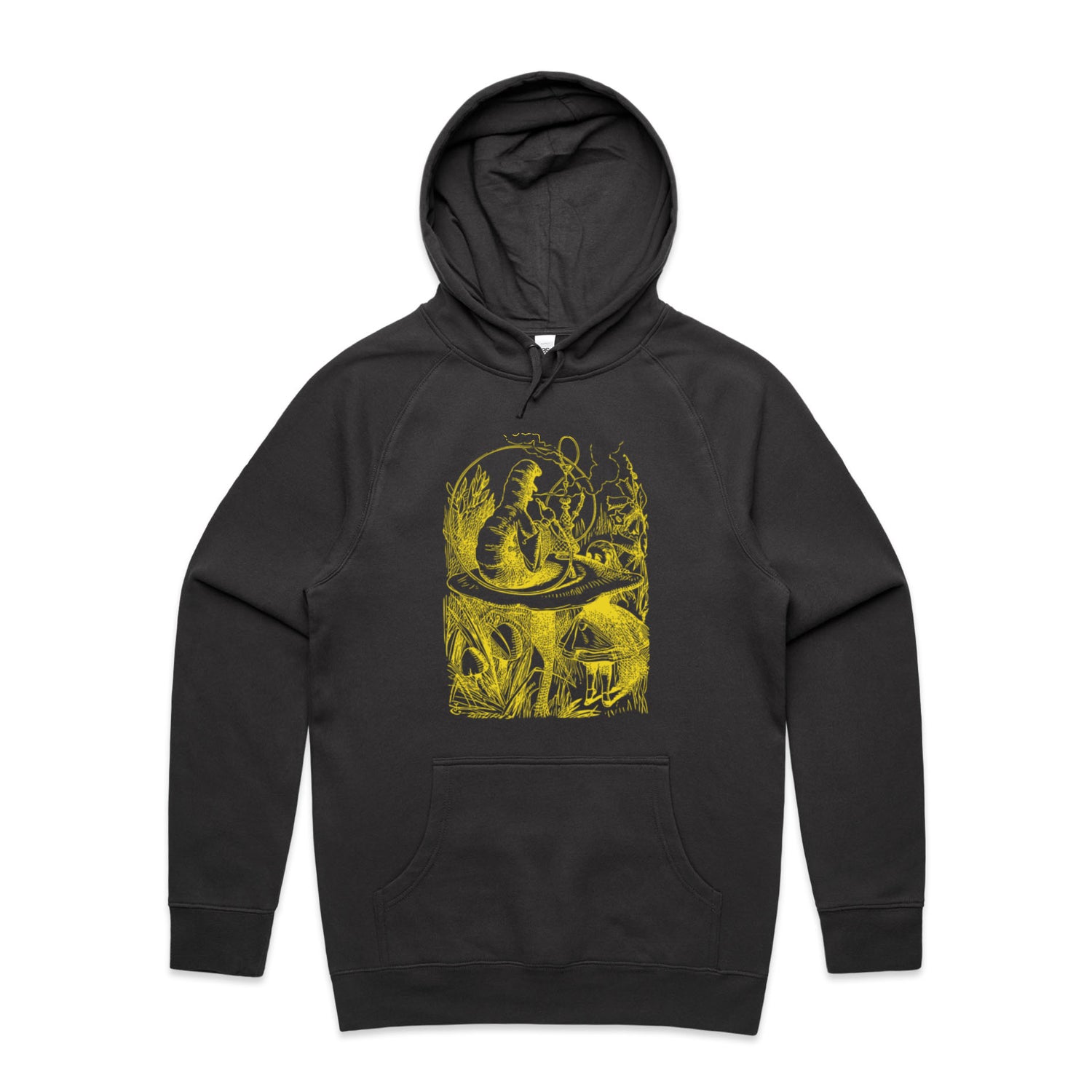 The Hoodies Alice in Wonderland - The Smoking Caterpillar – Men's Hooded Sweatshirt is a high-quality men's hooded sweatshirt, printed with lemon yellow ink on the trusted AS Colour Supply Hood 5101. With a regular fit and mid-weight feel, it's crafted from a premium blend of 80% cotton and 20% polyester anti-pill fleece, making it a durable and comfortable staple for any wardrobe. The pullover design features raglan sleeves, a lined hood with tonal drawcord, ribbed sleeve cuffs, and a roomy kangaroo pocket — all designed to keep you warm while looking effortlessly sharp.