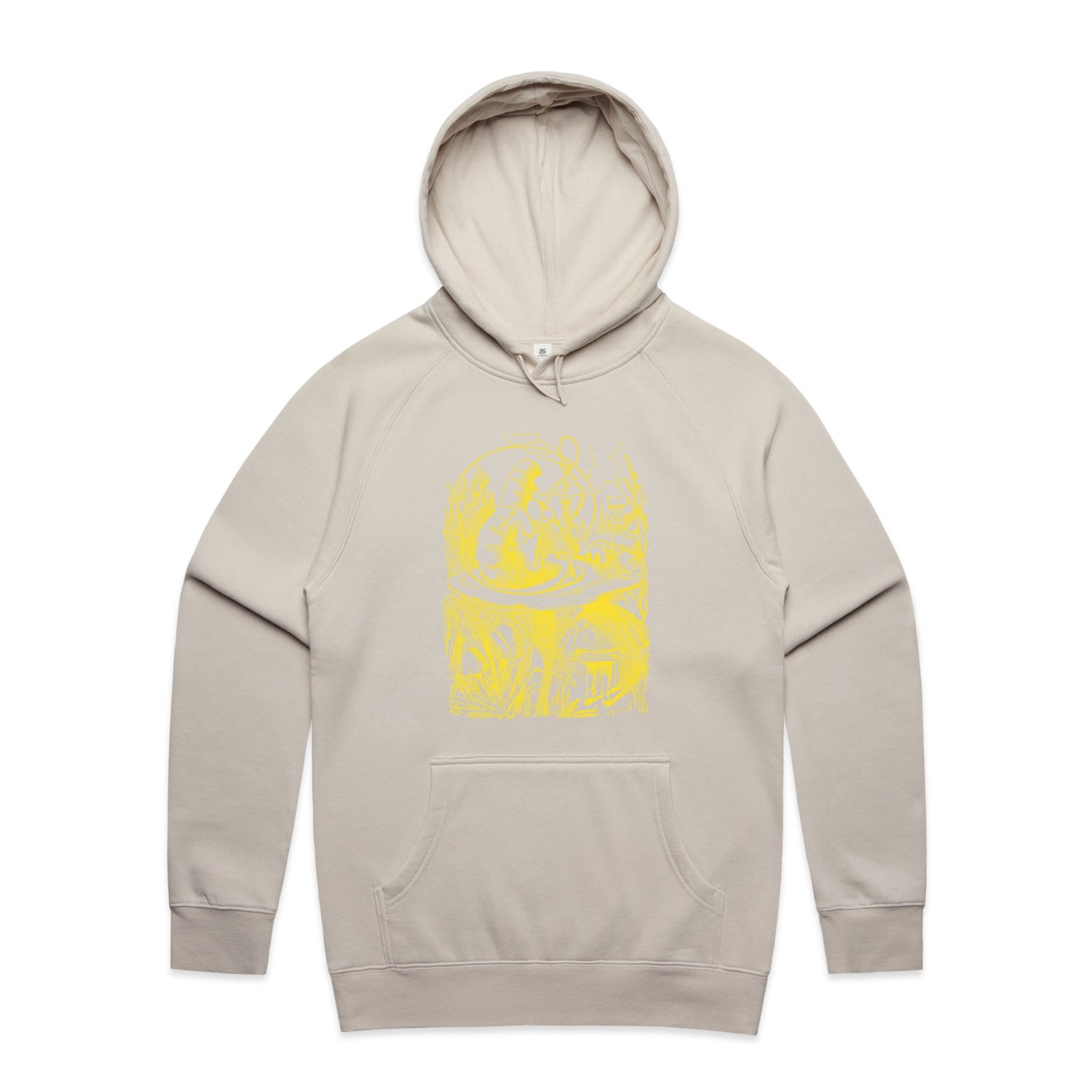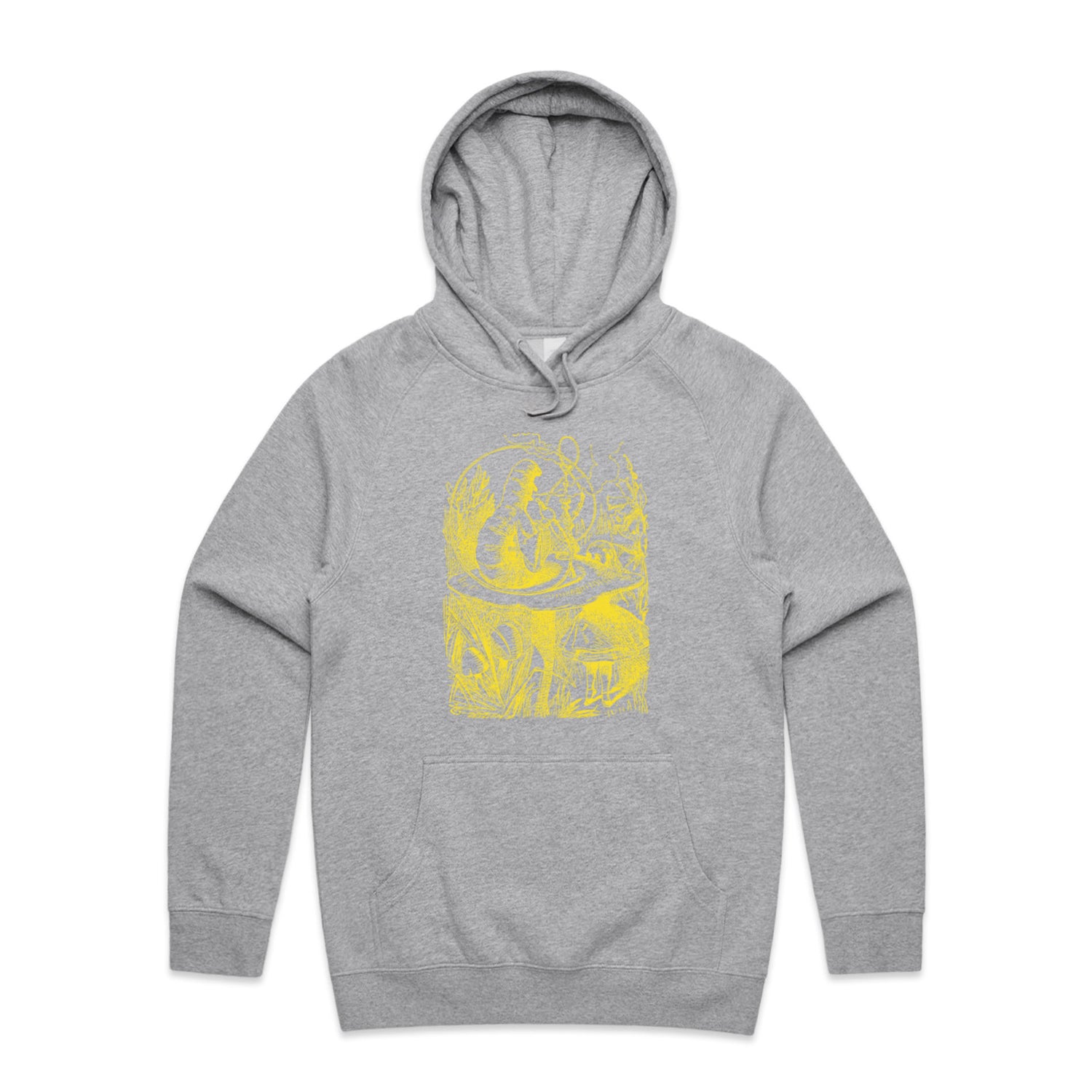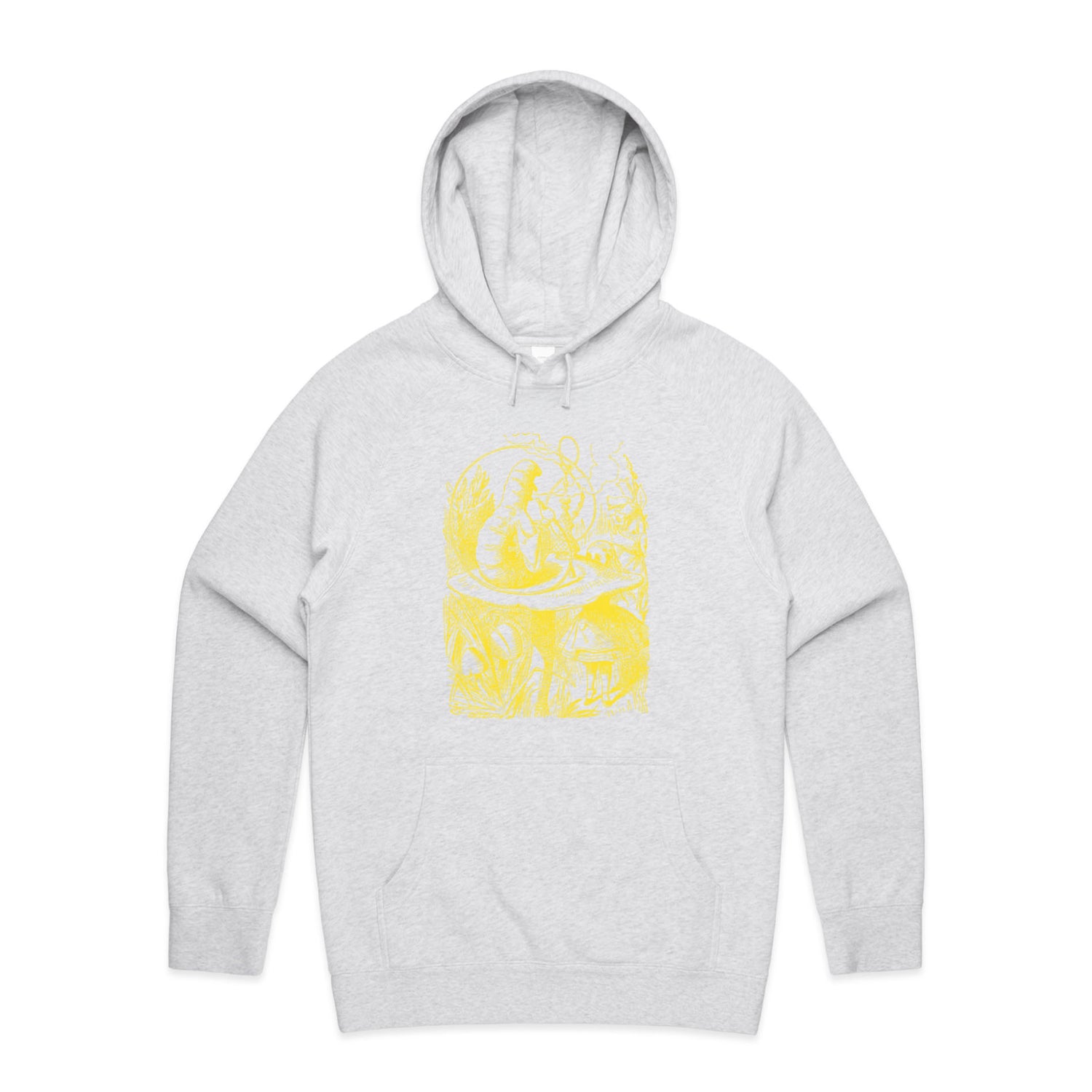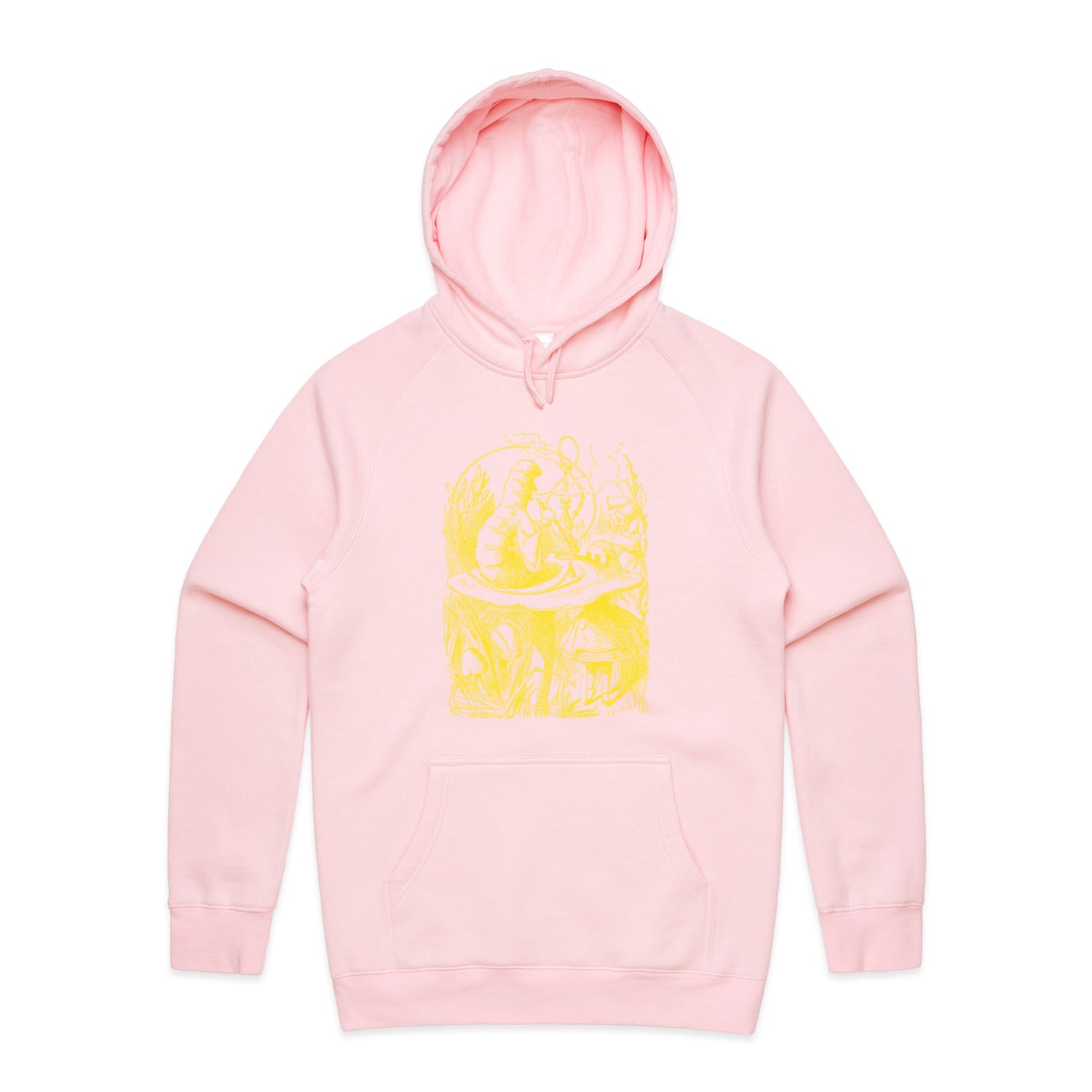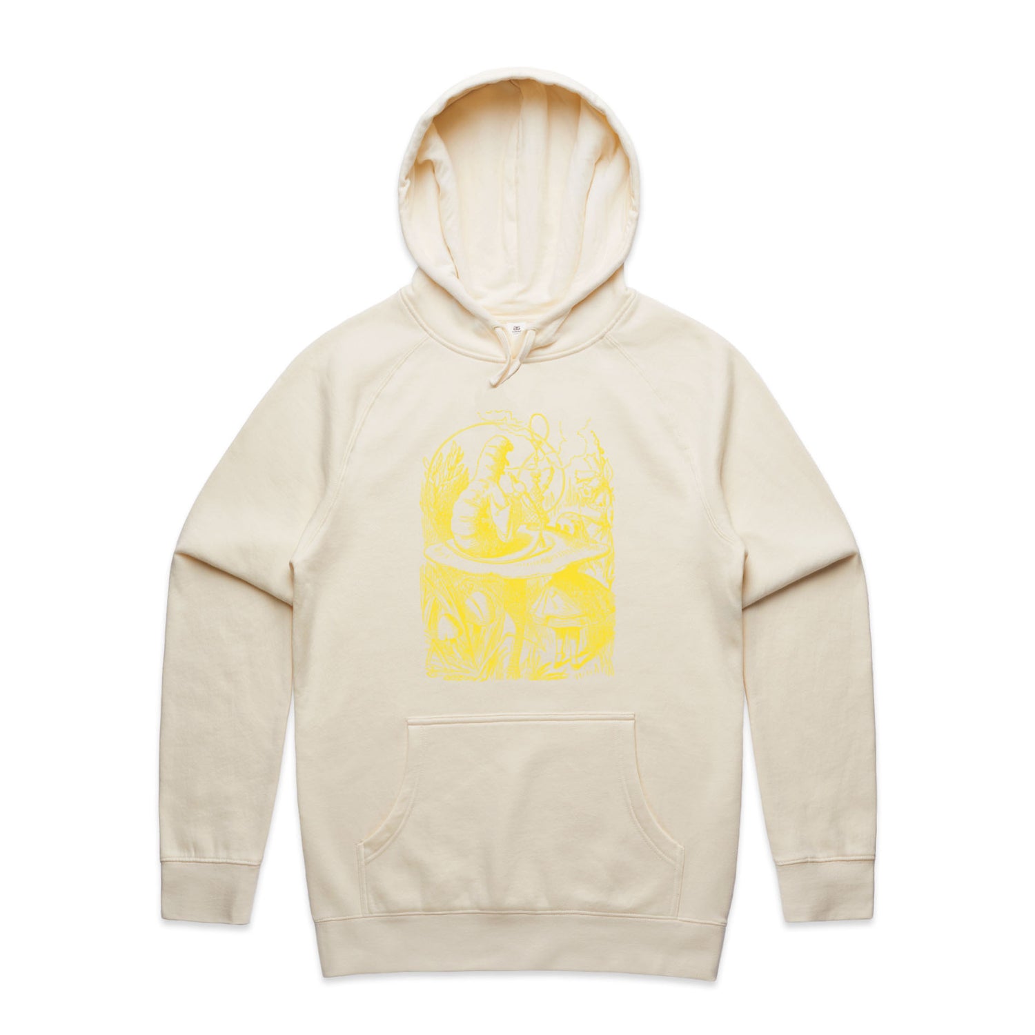 The Hoodies Alice in Wonderland - The Smoking Caterpillar – Men's Hooded Sweatshirt is a high-quality men's hooded sweatshirt, printed with lemon yellow ink on the trusted AS Colour Supply Hood 5101. With a regular fit and mid-weight feel, it's crafted from a premium blend of 80% cotton and 20% polyester anti-pill fleece, making it a durable and comfortable staple for any wardrobe. The pullover design features raglan sleeves, a lined hood with tonal drawcord, ribbed sleeve cuffs, and a roomy kangaroo pocket — all designed to keep you warm while looking effortlessly sharp.