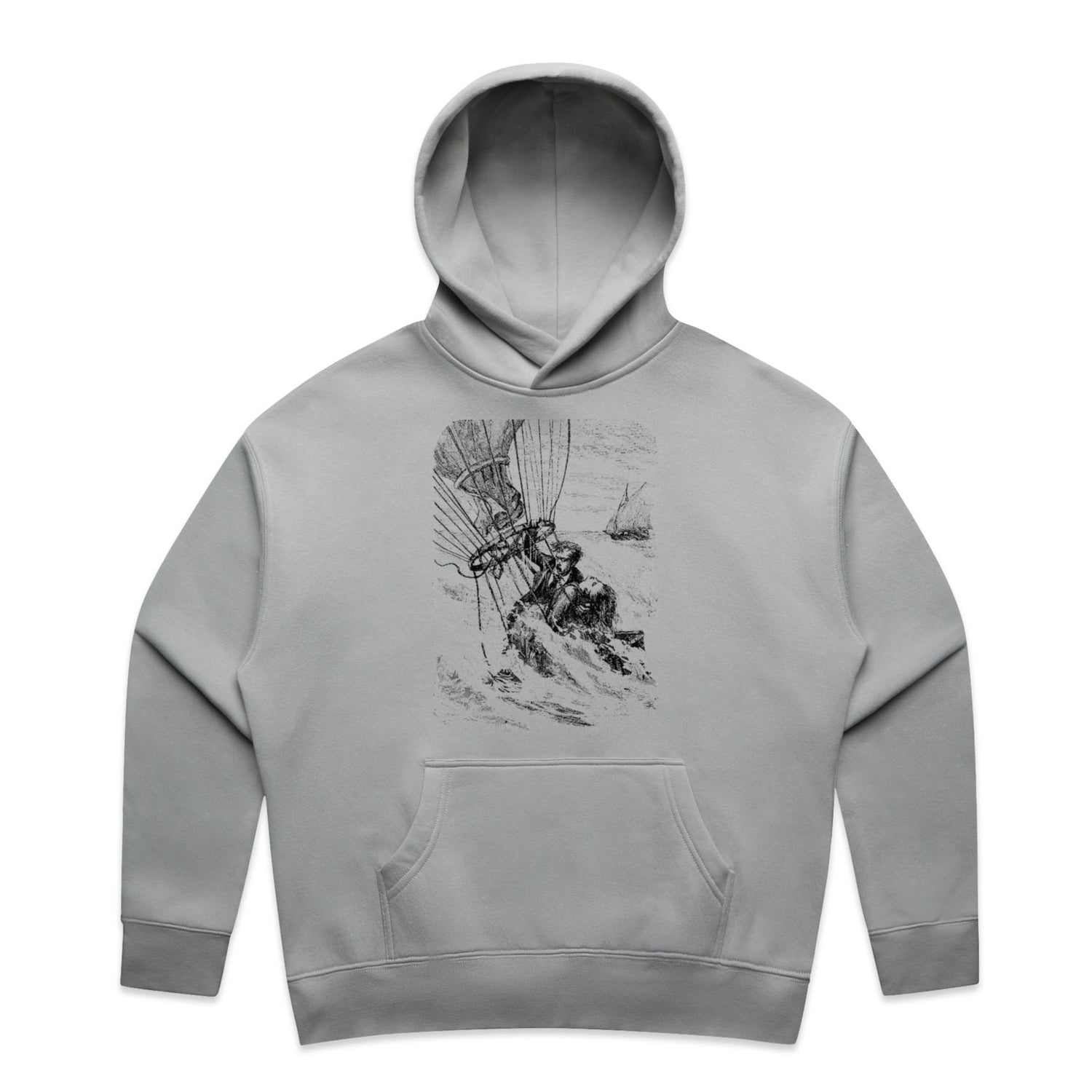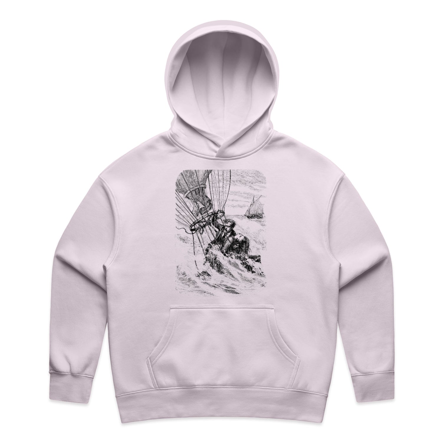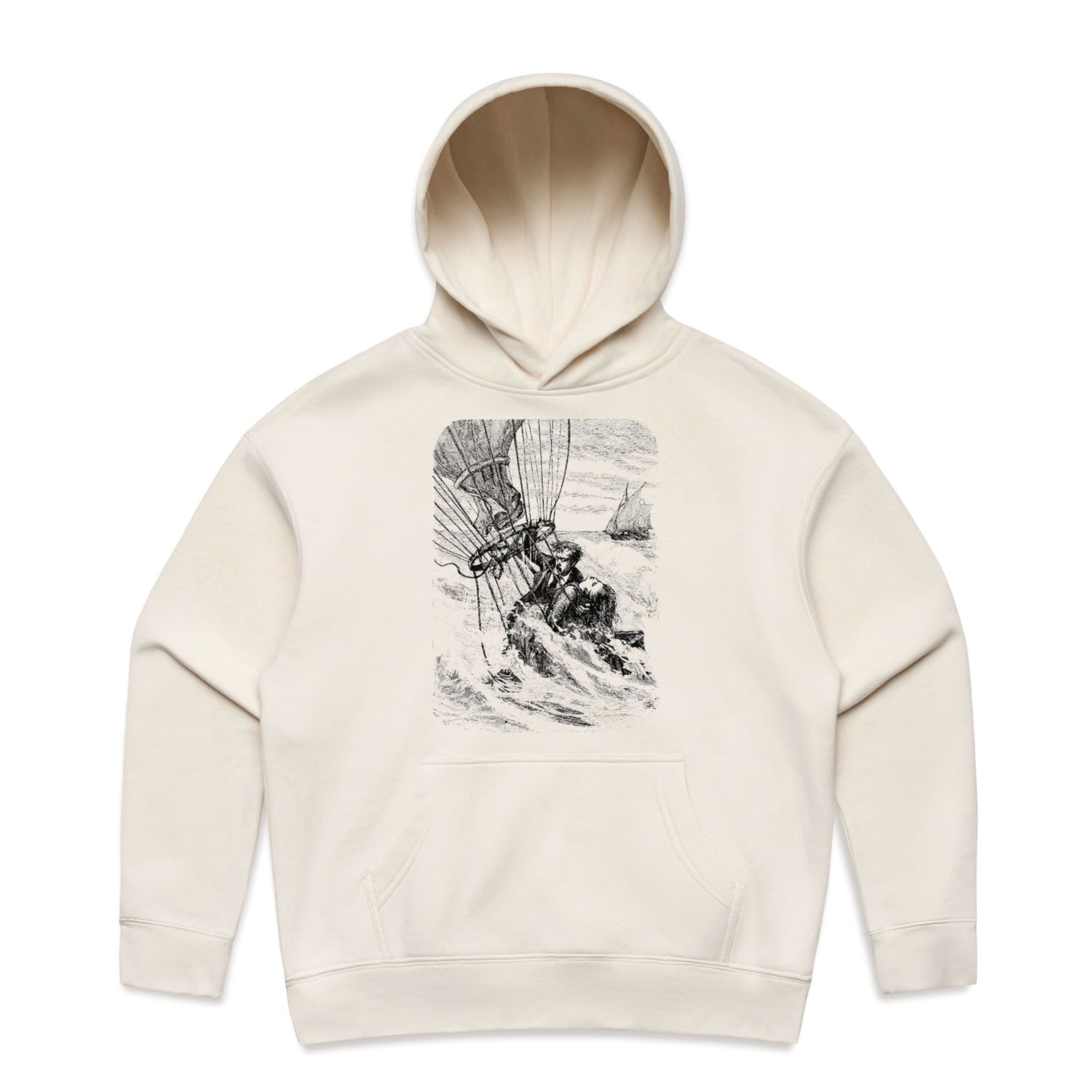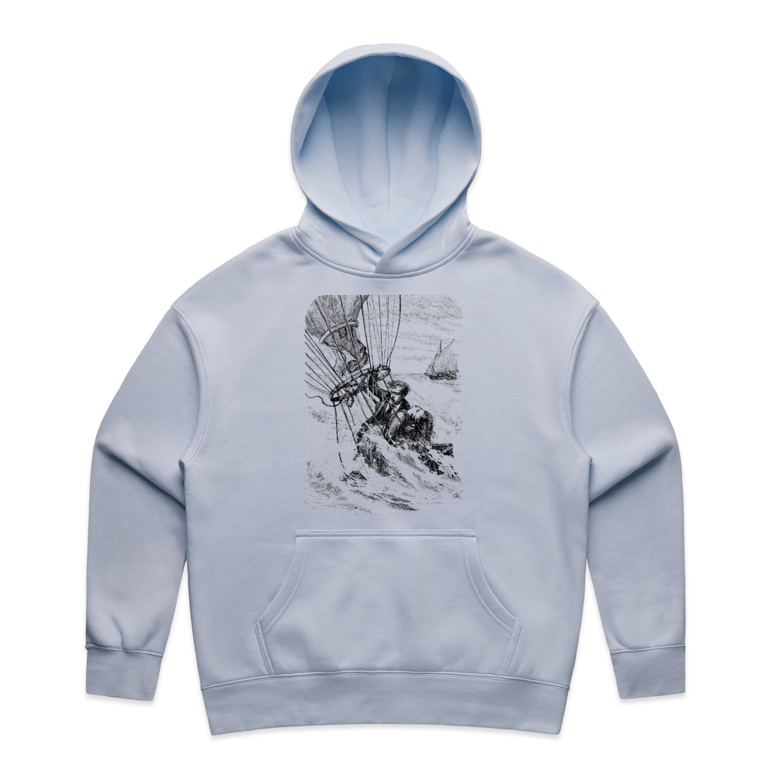 Dive into a wave of whimsy with TheHoodie's Balloon Crash at Sea women’s hooded sweatshirt. This isn’t just any hoodie; it’s an artwork you can wear, with a splash of mysterious black ink that’s as deep as the ocean and as dramatic as a hot air balloon’s flight gone freestyle at sea.