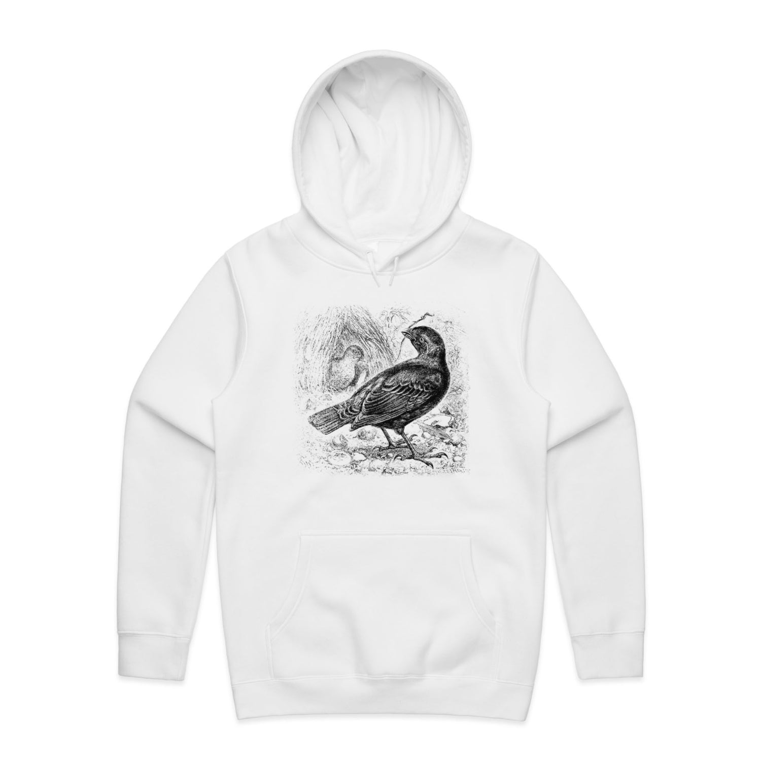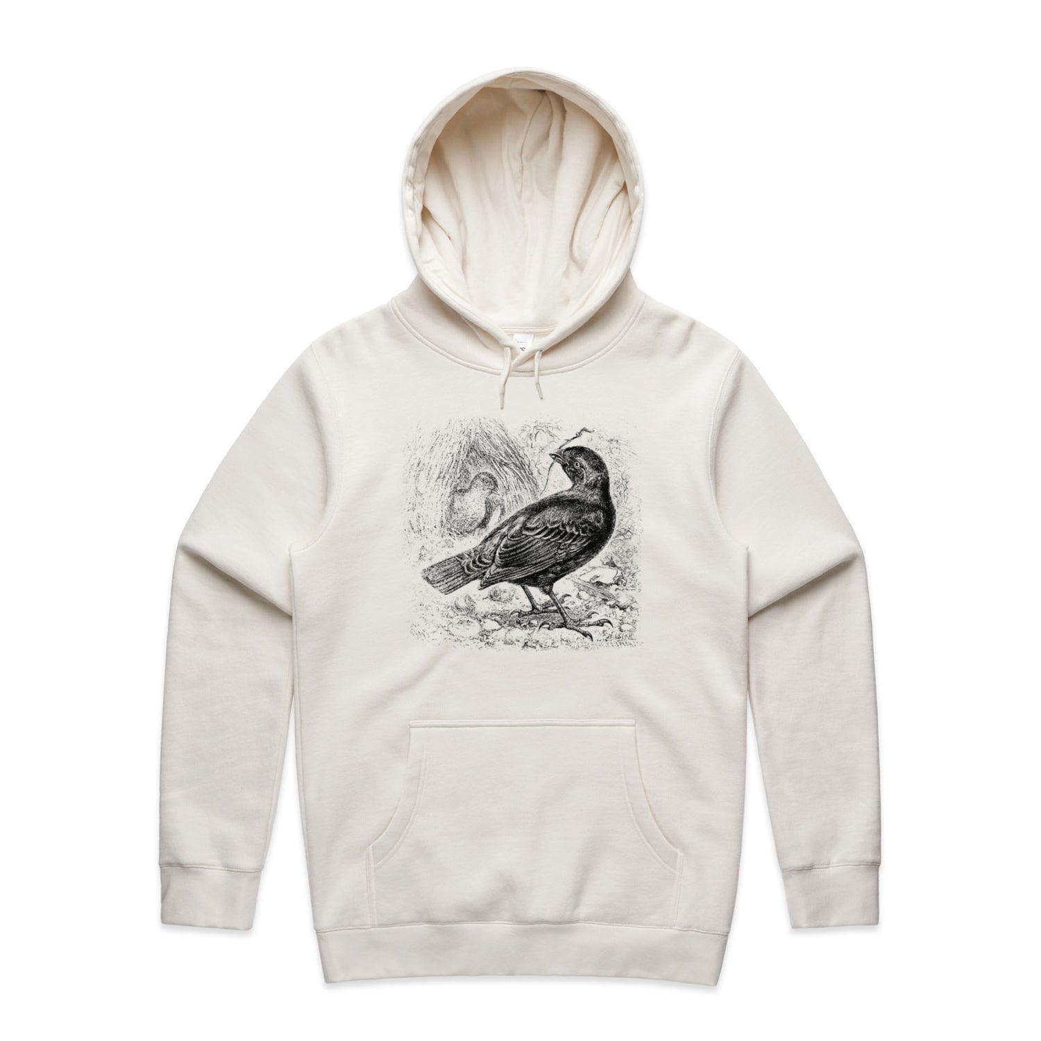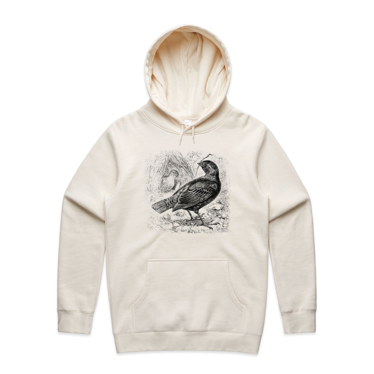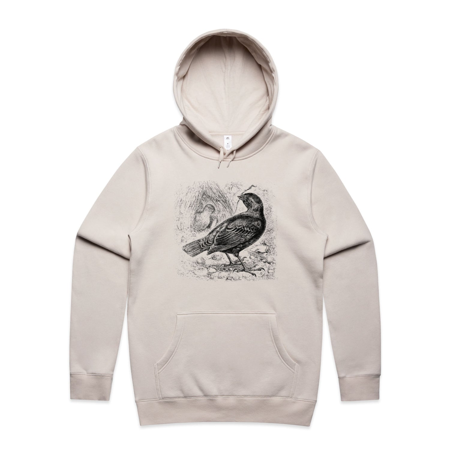 Featuring a stunning black ink bird print, it’s got that cheeky flair to make heads turn. With a lined hood for extra warmth and a kangaroo pocket ready to stash your essentials, it's more than just a hoodie – it’s your trusty, stylish companion. Crafted with a blend of cotton and recycled polyester, it's comfy, eco-conscious, and just waiting for epic adventures with you.