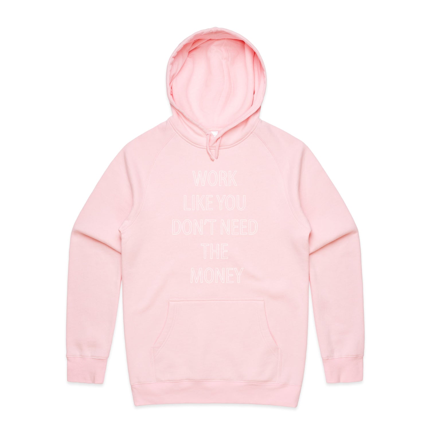 The Hoodies Work Like You Don't Need the Money – Men's Hooded Sweatshirt is a high-quality men's hooded sweatshirt, printed with white ink on the trusted AS Colour Supply Hood 5101. With a regular fit and mid-weight feel, it's crafted from a premium blend of 80% cotton and 20% polyester anti-pill fleece, making it a durable and comfortable staple for any wardrobe. The pullover design features raglan sleeves, a lined hood with tonal drawcord, ribbed sleeve cuffs, and a roomy kangaroo pocket — all designed to keep you warm while looking effortlessly sharp.