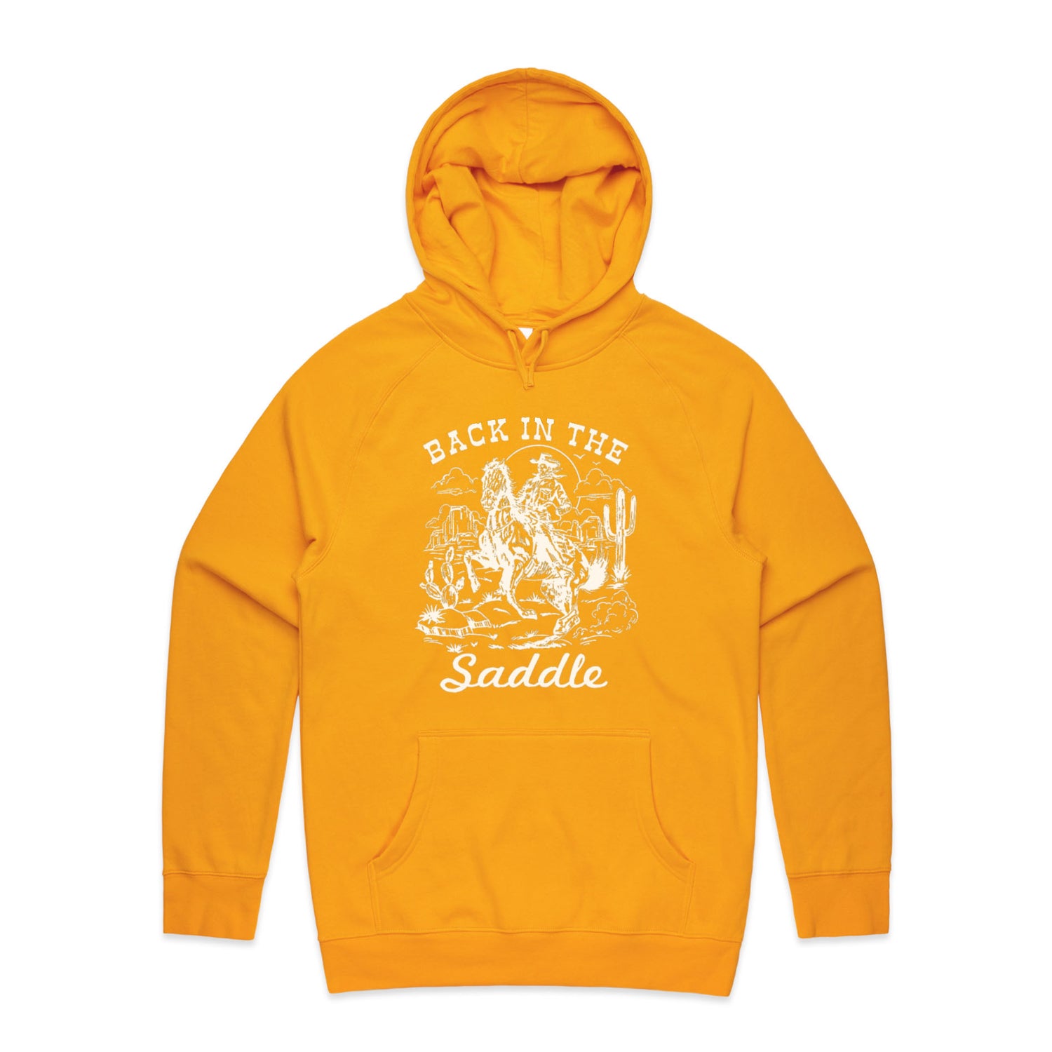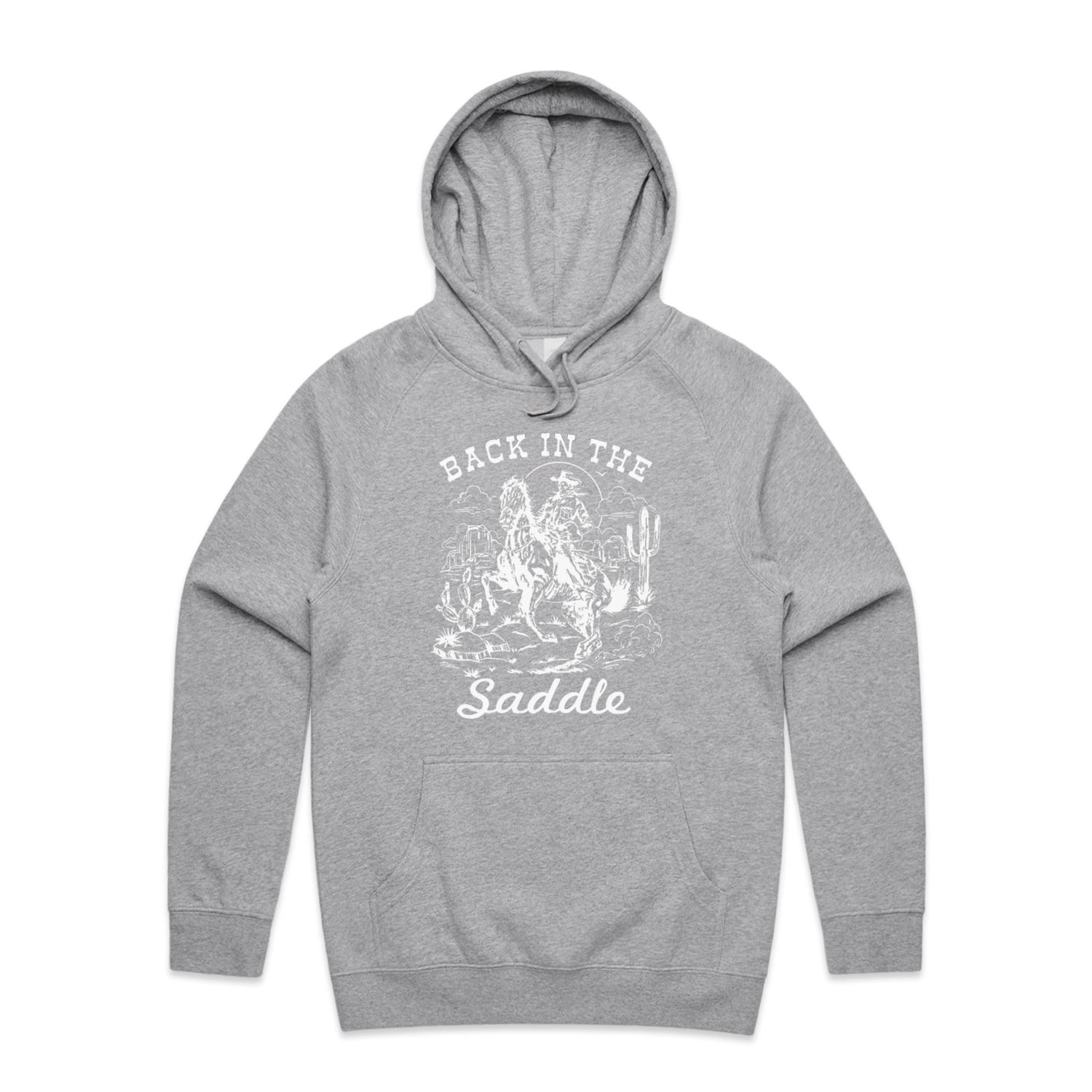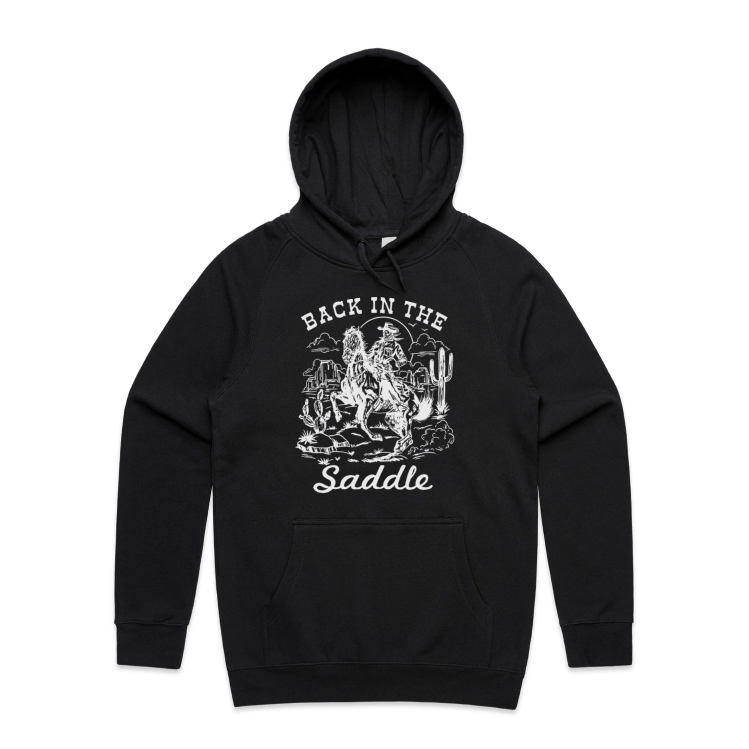 The Hoodies Back in the Saddle – Men's Hooded Sweatshirt is a high-quality men's hooded sweatshirt, printed with white ink on the trusted AS Colour Supply Hood 5101. With a regular fit and mid-weight feel, it's crafted from a premium blend of 80% cotton and 20% polyester anti-pill fleece, making it a durable and comfortable staple for any wardrobe. The pullover design features raglan sleeves, a lined hood with tonal drawcord, ribbed sleeve cuffs, and a roomy kangaroo pocket — all designed to keep you warm while looking effortlessly sharp.