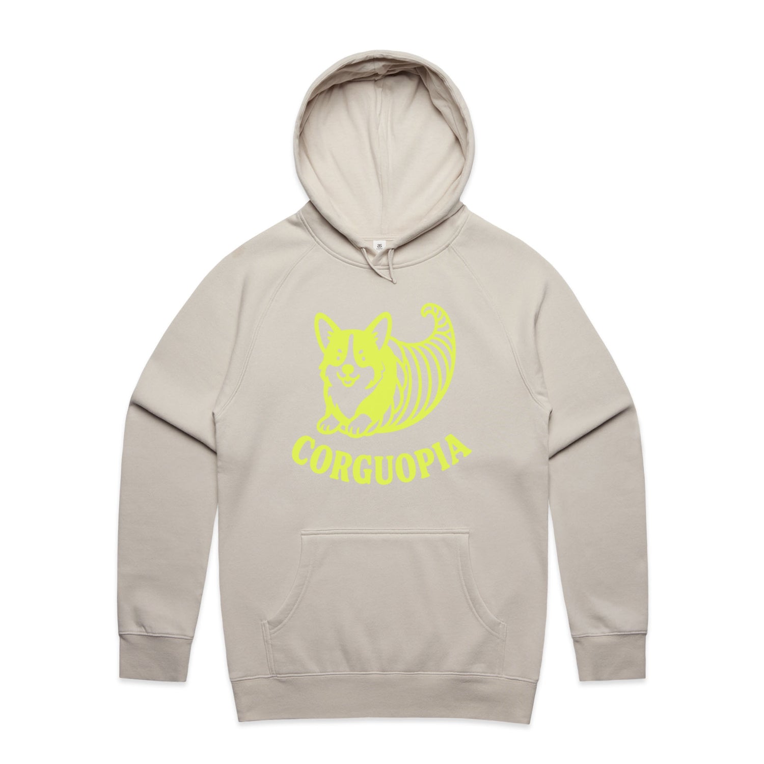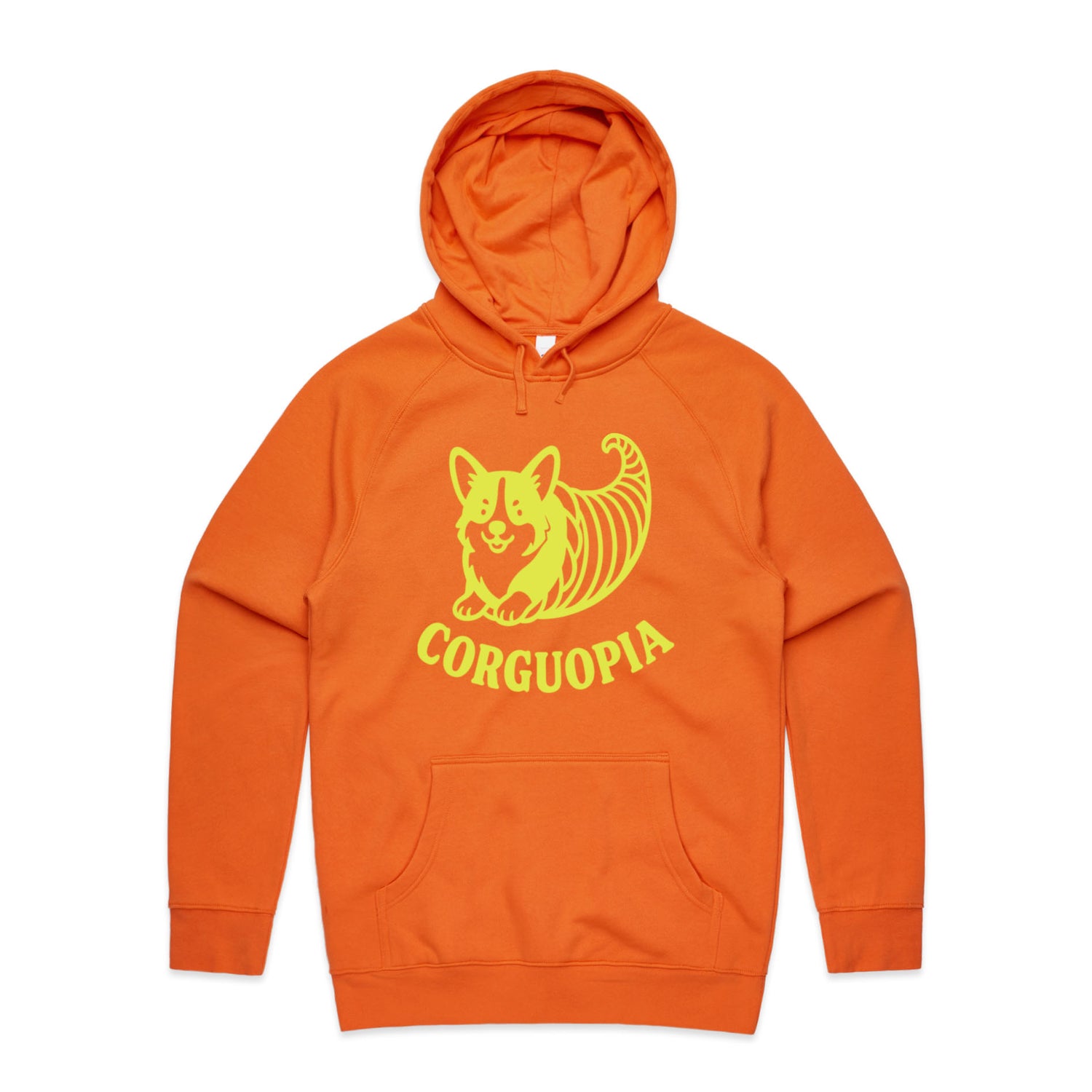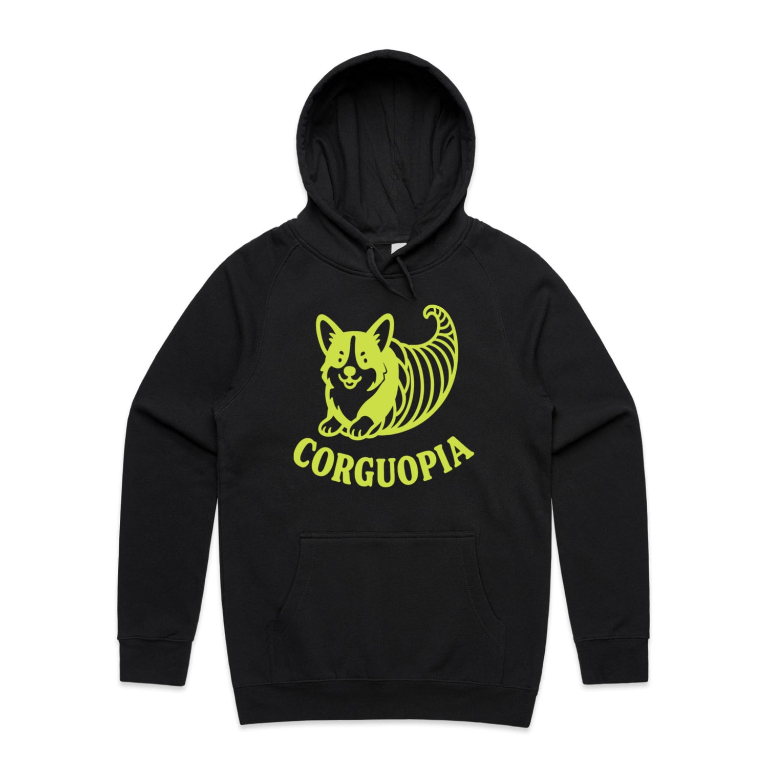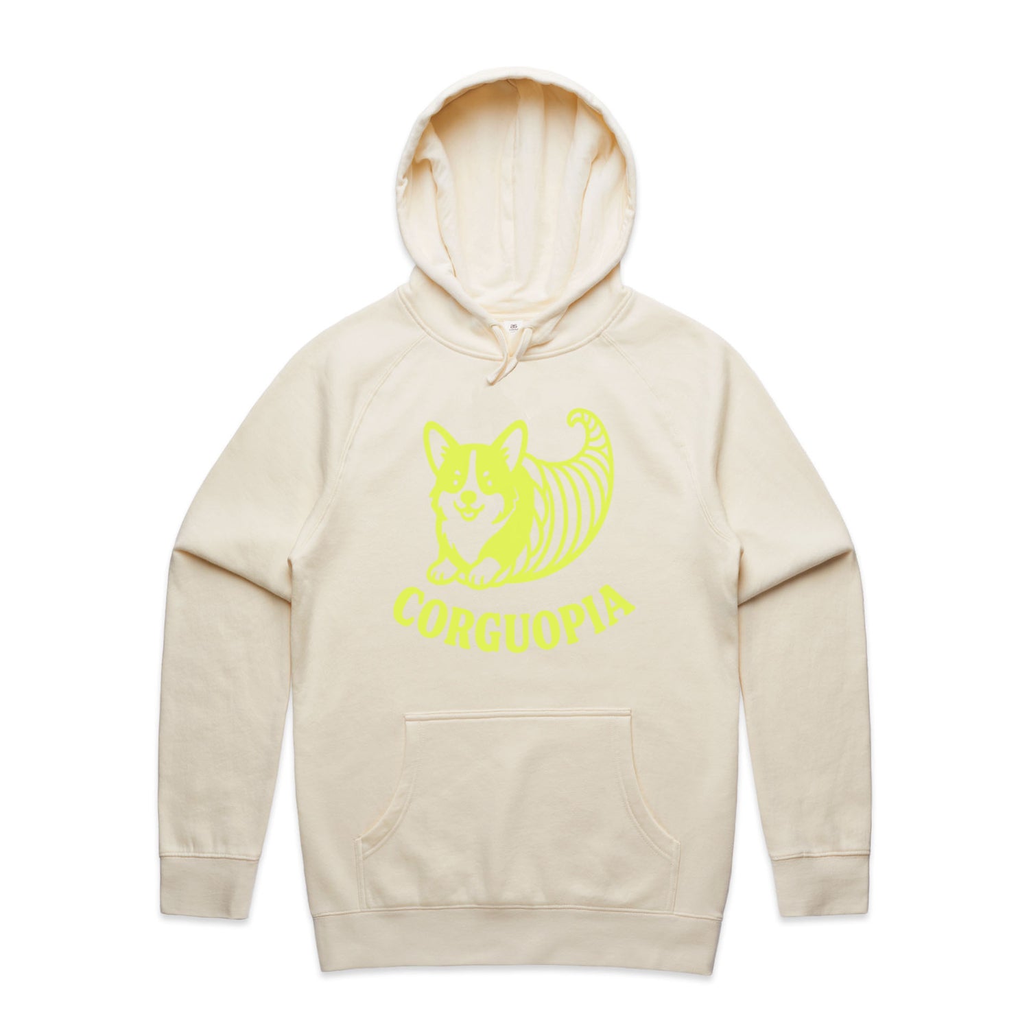 The Hoodies Corgi in Cornucopia – Men's Hooded Sweatshirt is a high-quality men's hooded sweatshirt, printed with fluoro yellow ink on the trusted AS Colour Supply Hood 5101. With a regular fit and mid-weight feel, it's crafted from a premium blend of 80% cotton and 20% polyester anti-pill fleece, making it a durable and comfortable staple for any wardrobe. The pullover design features raglan sleeves, a lined hood with tonal drawcord, ribbed sleeve cuffs, and a roomy kangaroo pocket — all designed to keep you warm while looking effortlessly sharp.