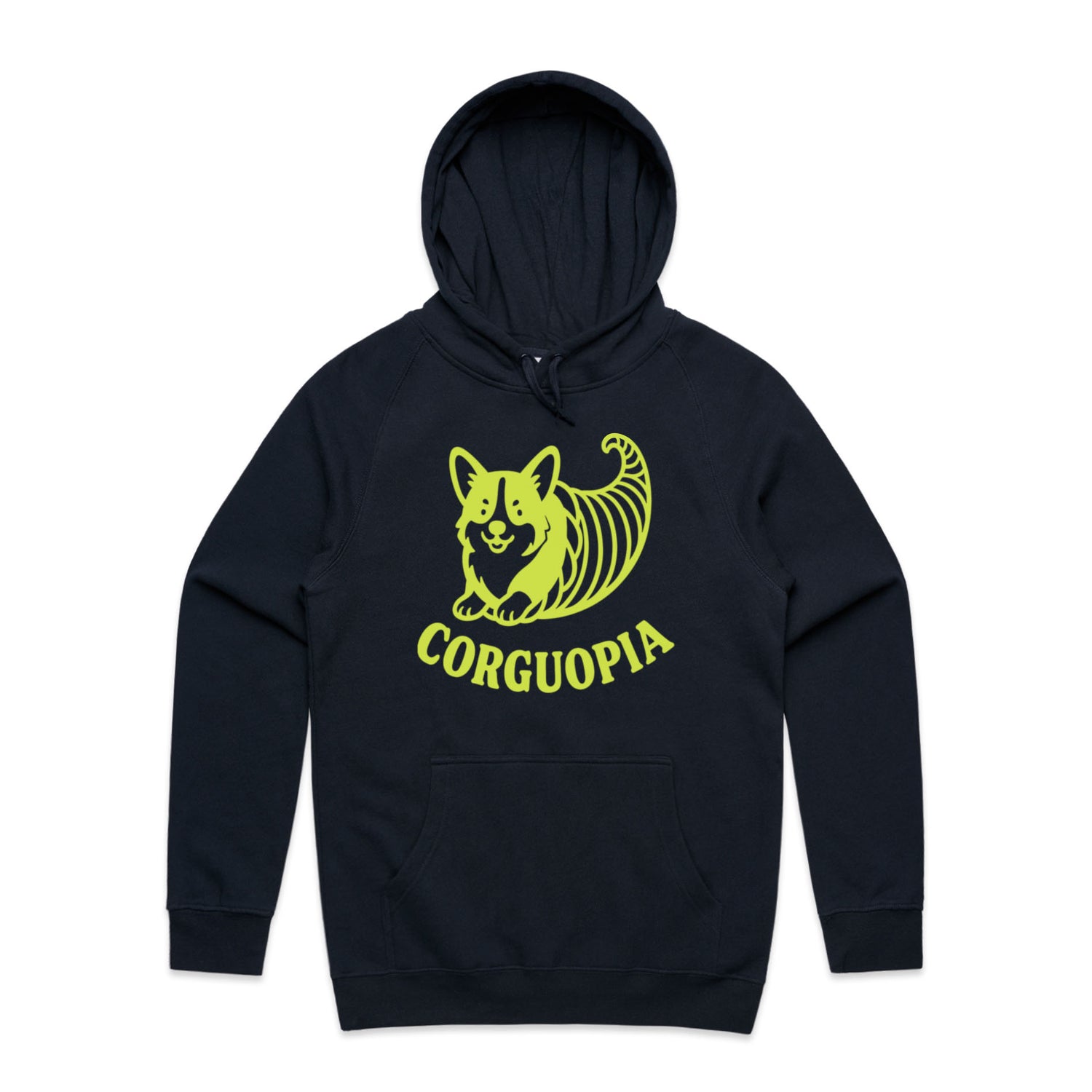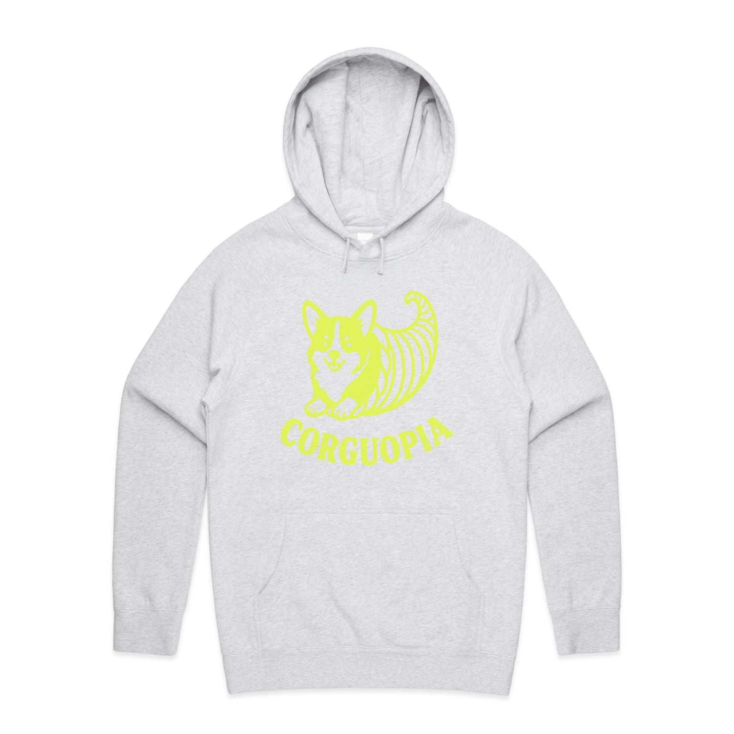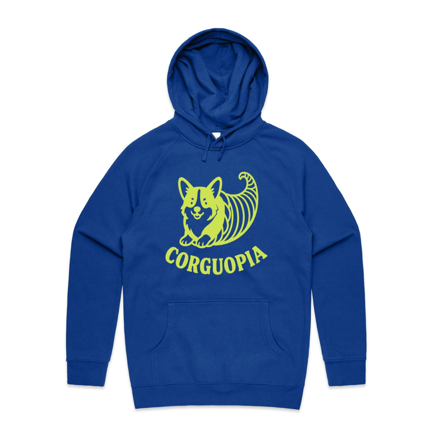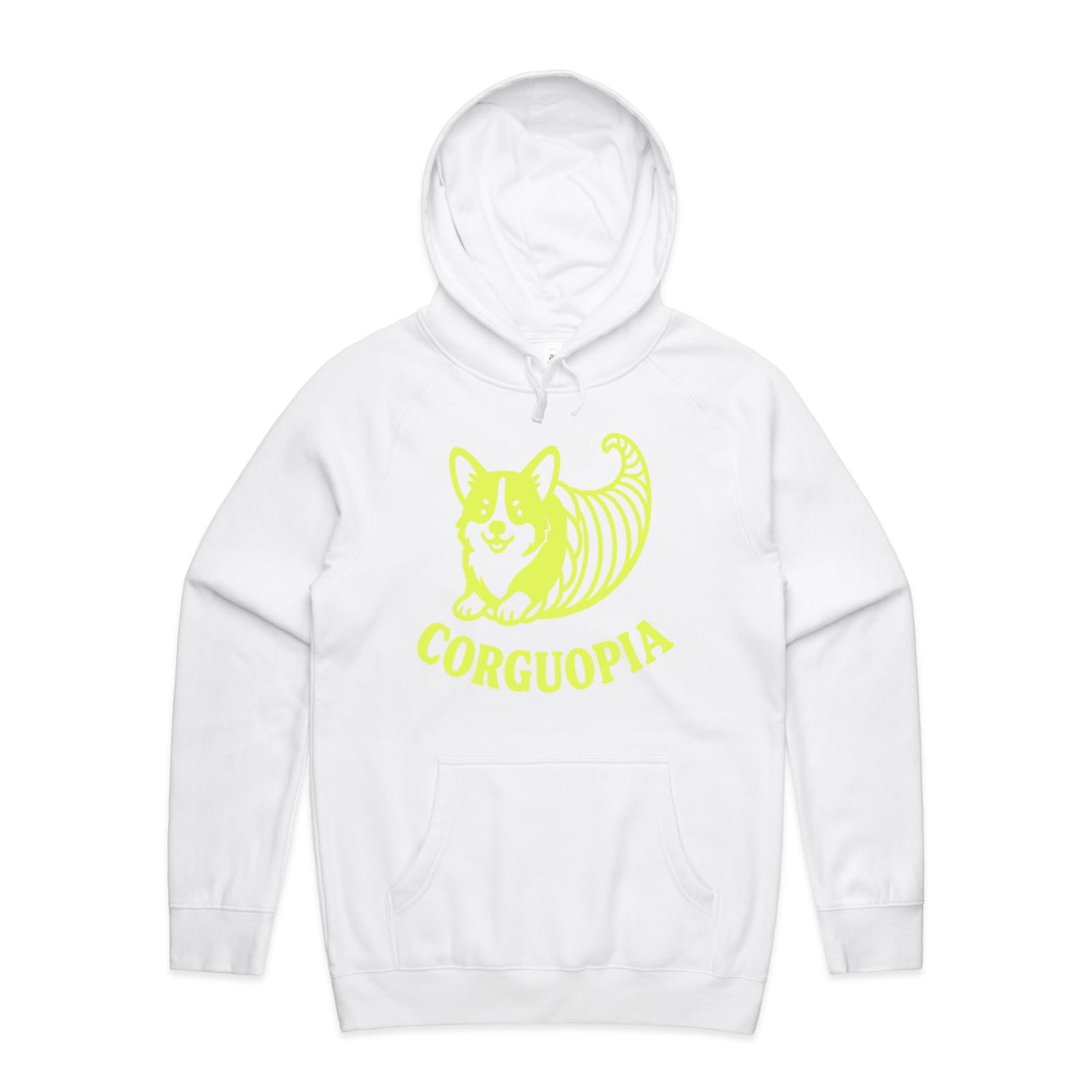 The Hoodies Corgi in Cornucopia – Men's Hooded Sweatshirt is a high-quality men's hooded sweatshirt, printed with fluoro yellow ink on the trusted AS Colour Supply Hood 5101. With a regular fit and mid-weight feel, it's crafted from a premium blend of 80% cotton and 20% polyester anti-pill fleece, making it a durable and comfortable staple for any wardrobe. The pullover design features raglan sleeves, a lined hood with tonal drawcord, ribbed sleeve cuffs, and a roomy kangaroo pocket — all designed to keep you warm while looking effortlessly sharp.