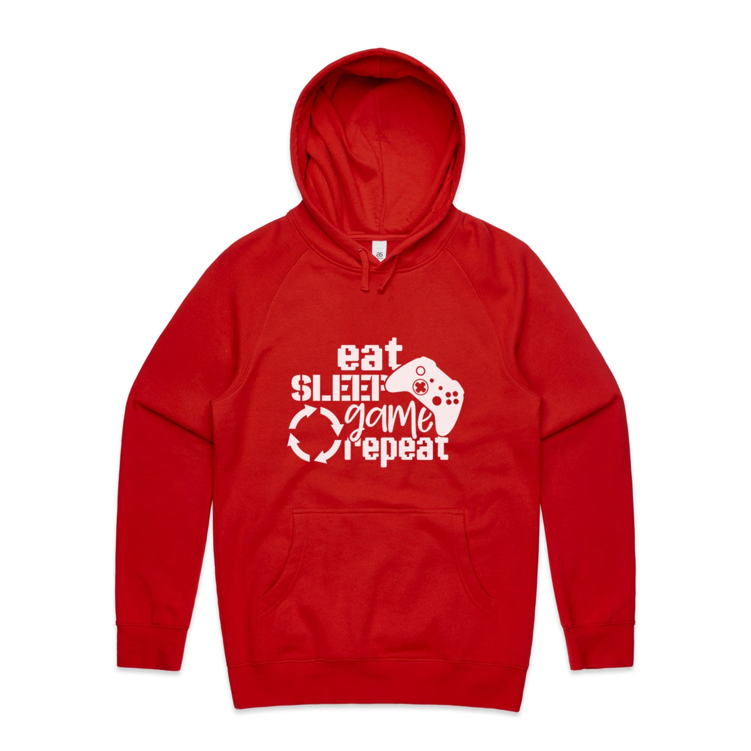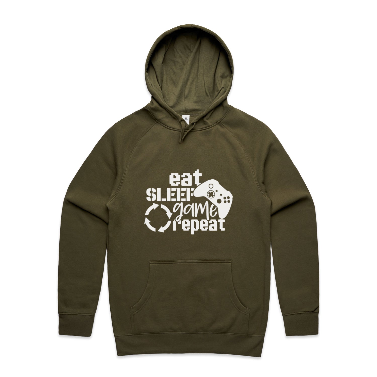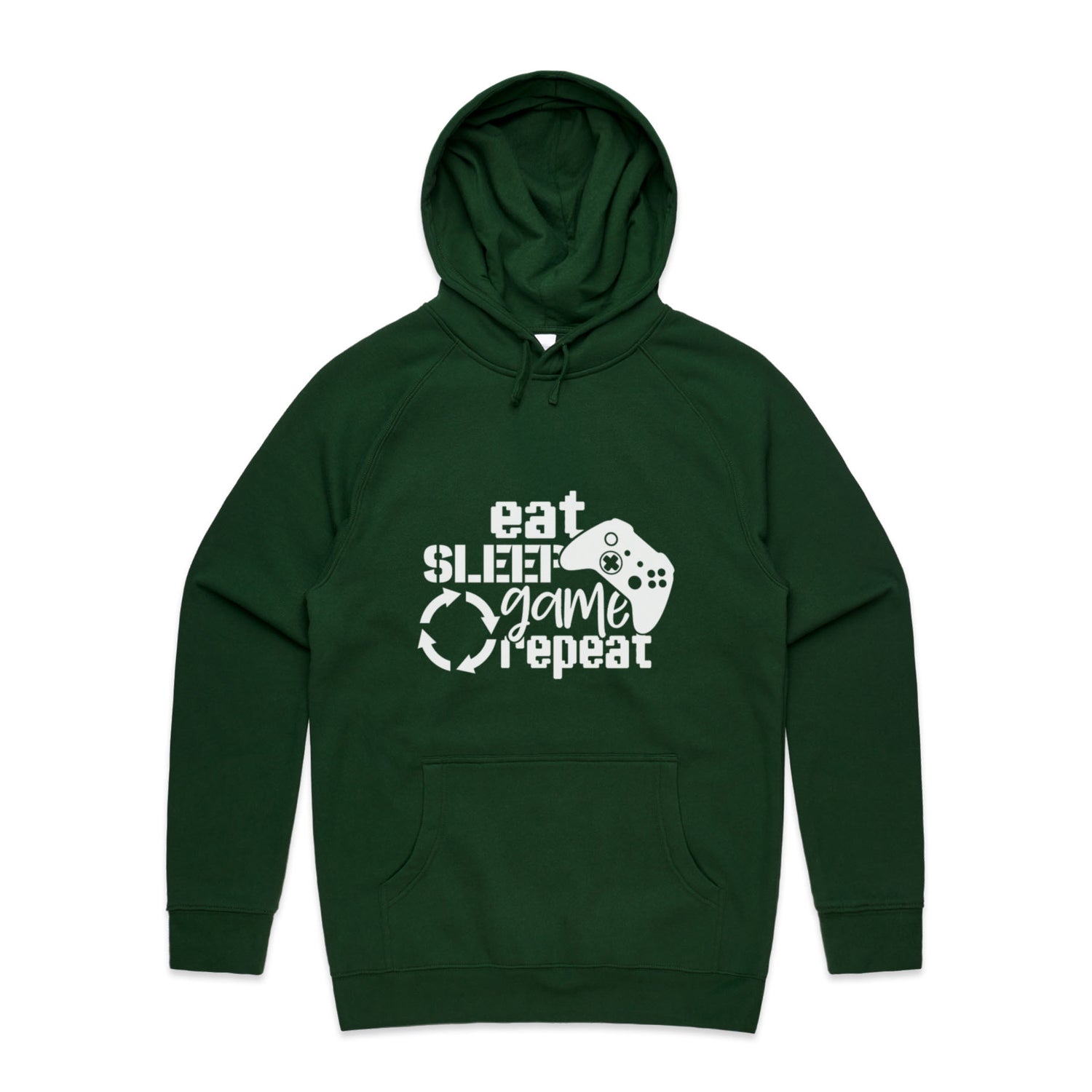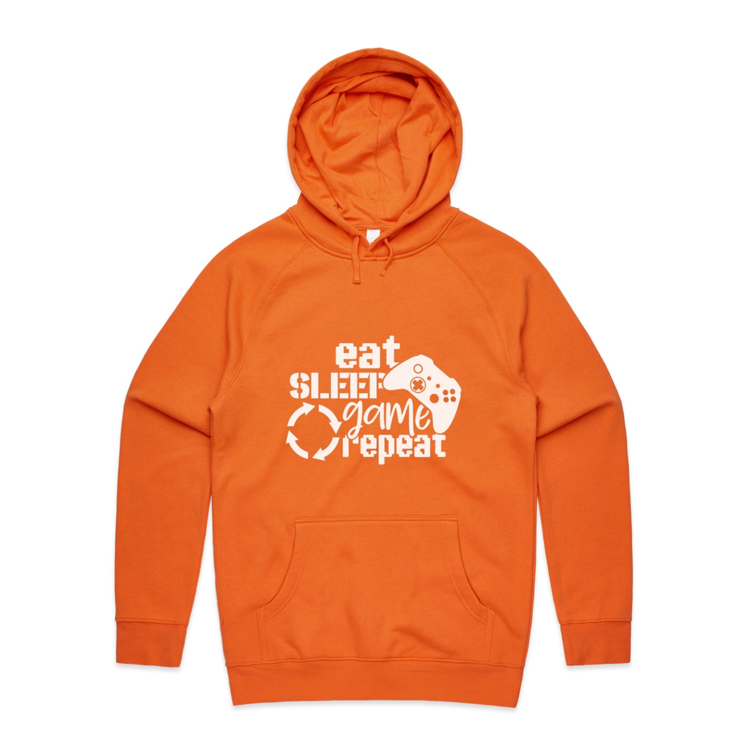 The Hoodies Eat Sleep Game Cycle – Men's Hooded Sweatshirt is a high-quality men's hooded sweatshirt, printed with white ink on the trusted AS Colour Supply Hood 5101. With a regular fit and mid-weight feel, it's crafted from a premium blend of 80% cotton and 20% polyester anti-pill fleece, making it a durable and comfortable staple for any wardrobe. The pullover design features raglan sleeves, a lined hood with tonal drawcord, ribbed sleeve cuffs, and a roomy kangaroo pocket — all designed to keep you warm while looking effortlessly sharp.