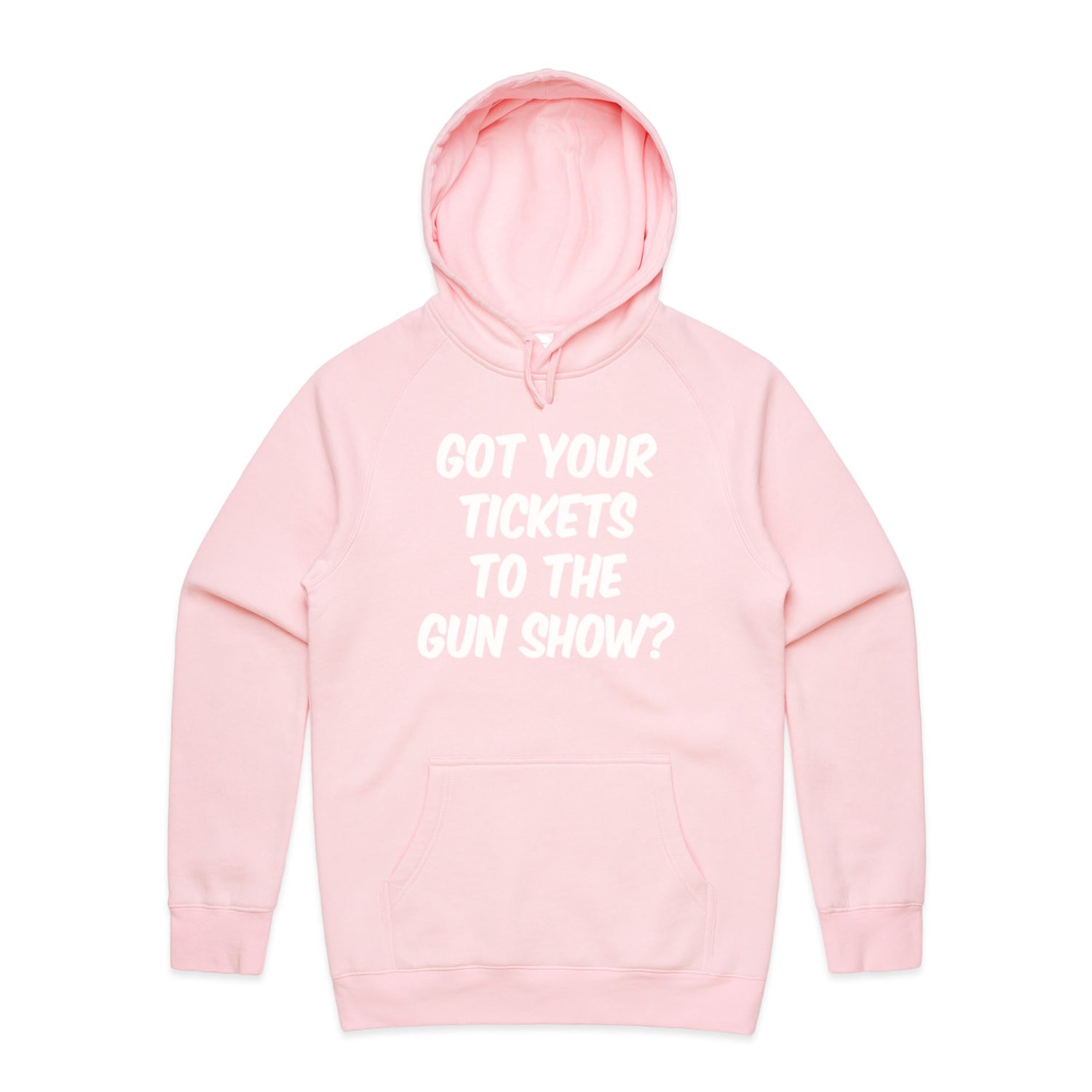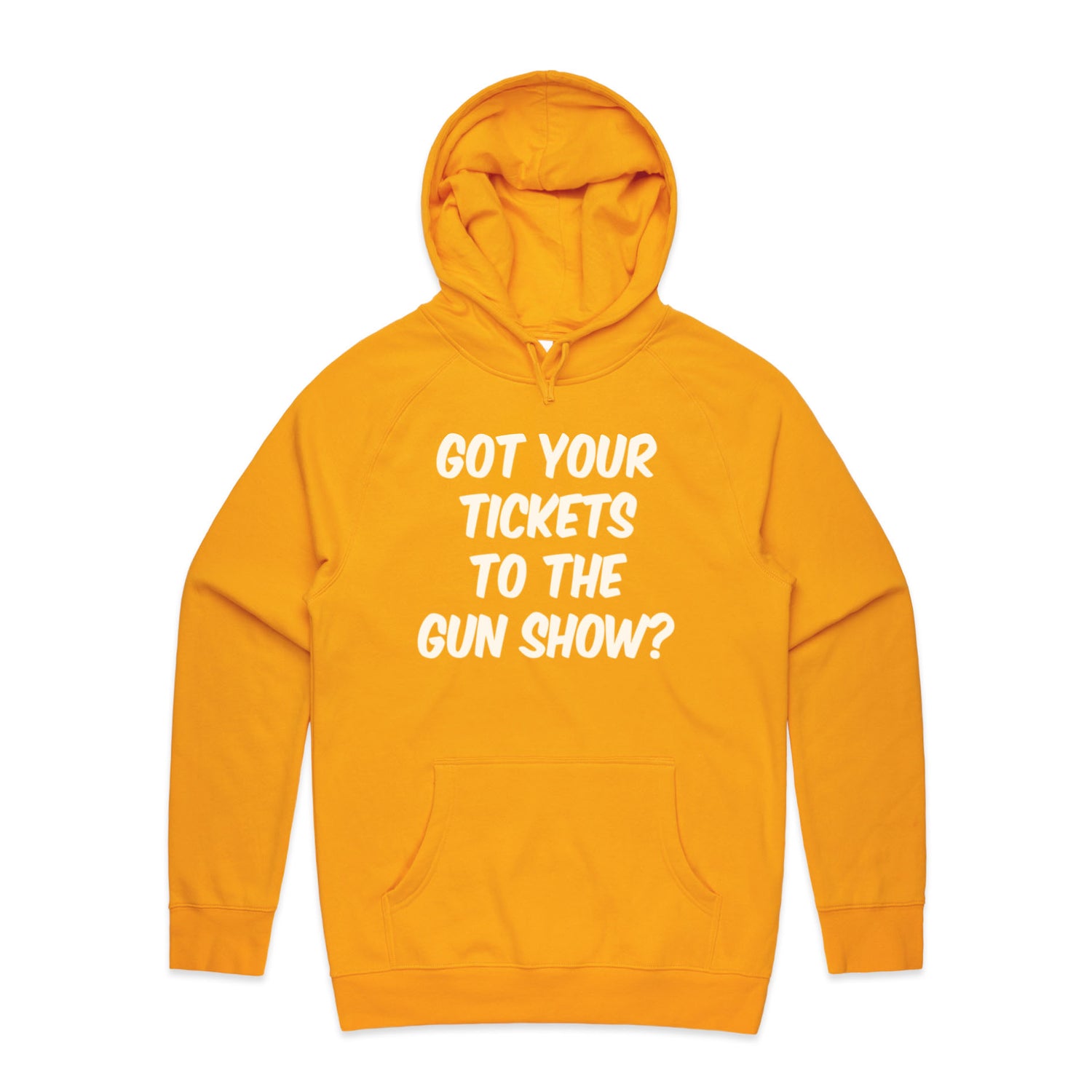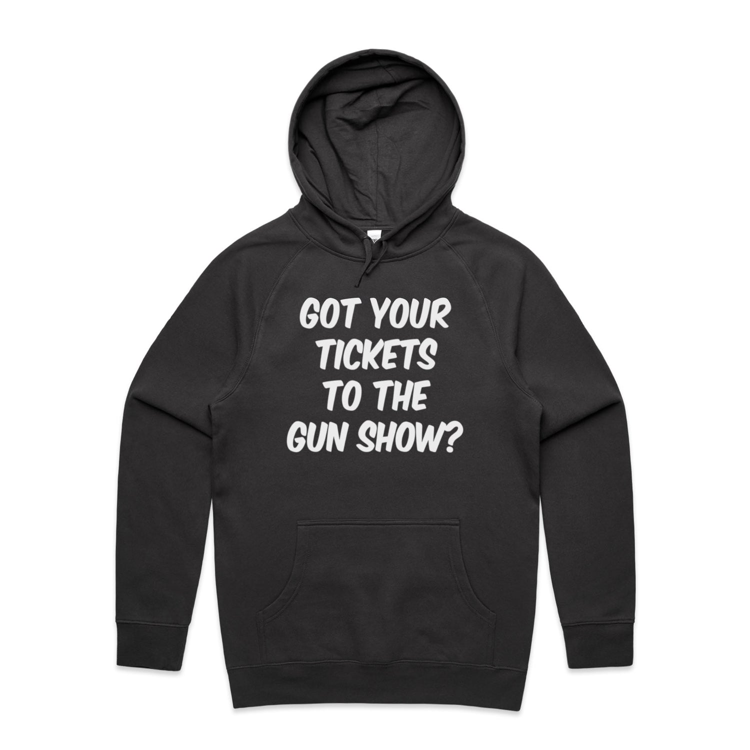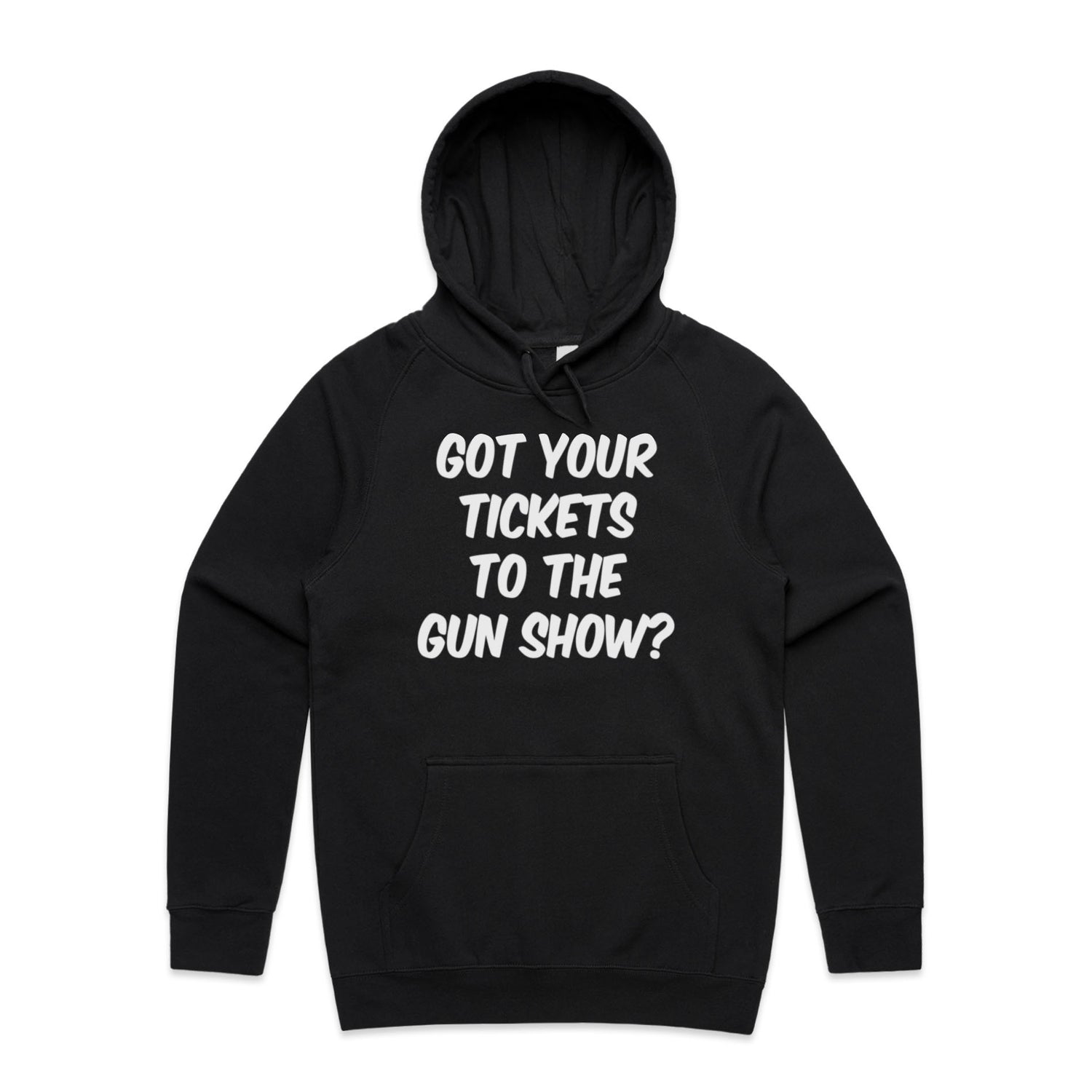 The Hoodies Got Your Tickets to the Gun Show – Men's Hooded Sweatshirt is a high-quality men's hooded sweatshirt, printed with white ink on the trusted AS Colour Supply Hood 5101. With a regular fit and mid-weight feel, it's crafted from a premium blend of 80% cotton and 20% polyester anti-pill fleece, making it a durable and comfortable staple for any wardrobe. The pullover design features raglan sleeves, a lined hood with tonal drawcord, ribbed sleeve cuffs, and a roomy kangaroo pocket — all designed to keep you warm while looking effortlessly sharp.