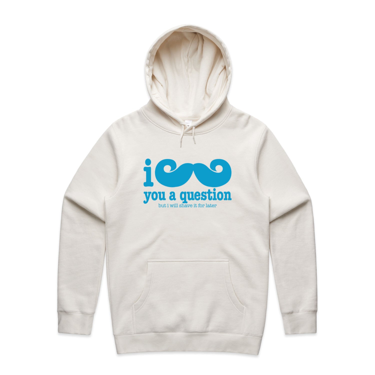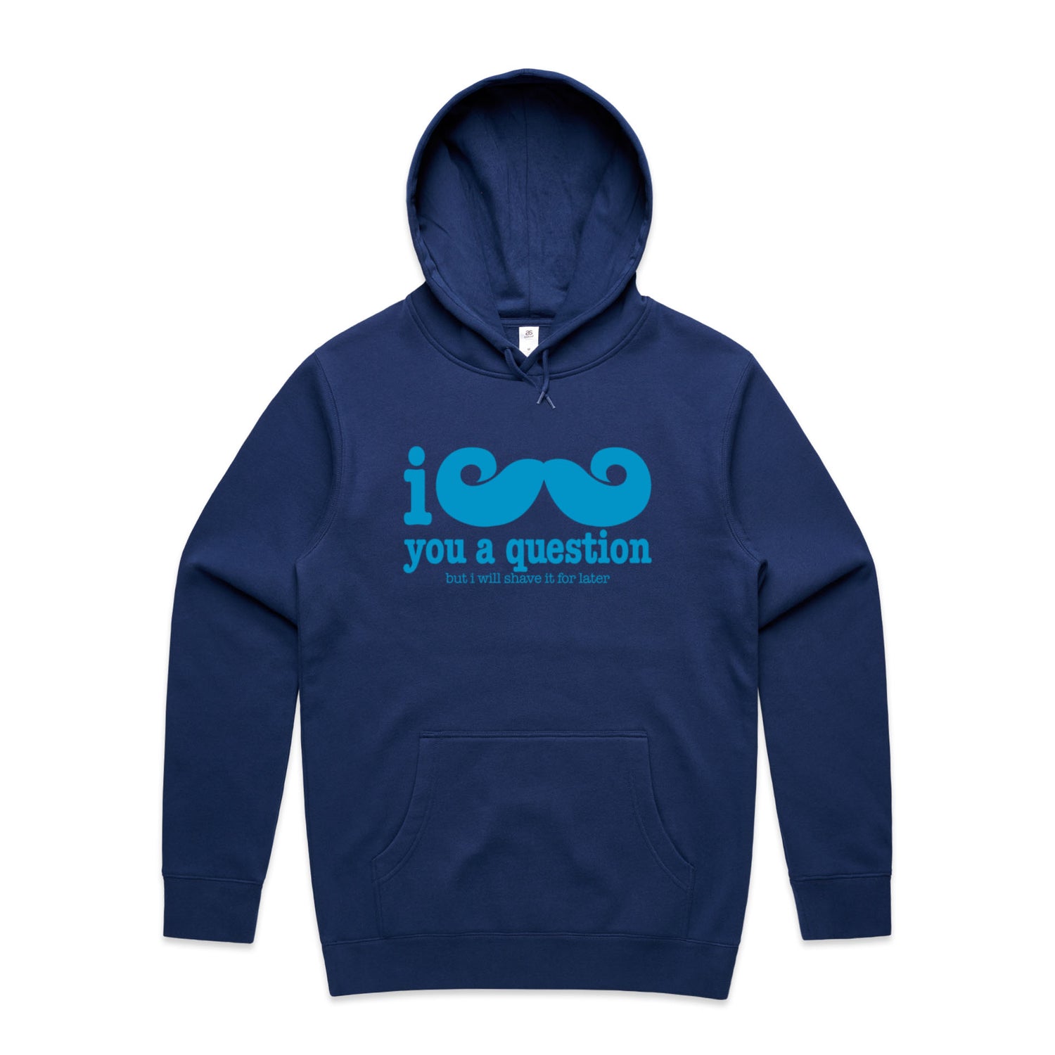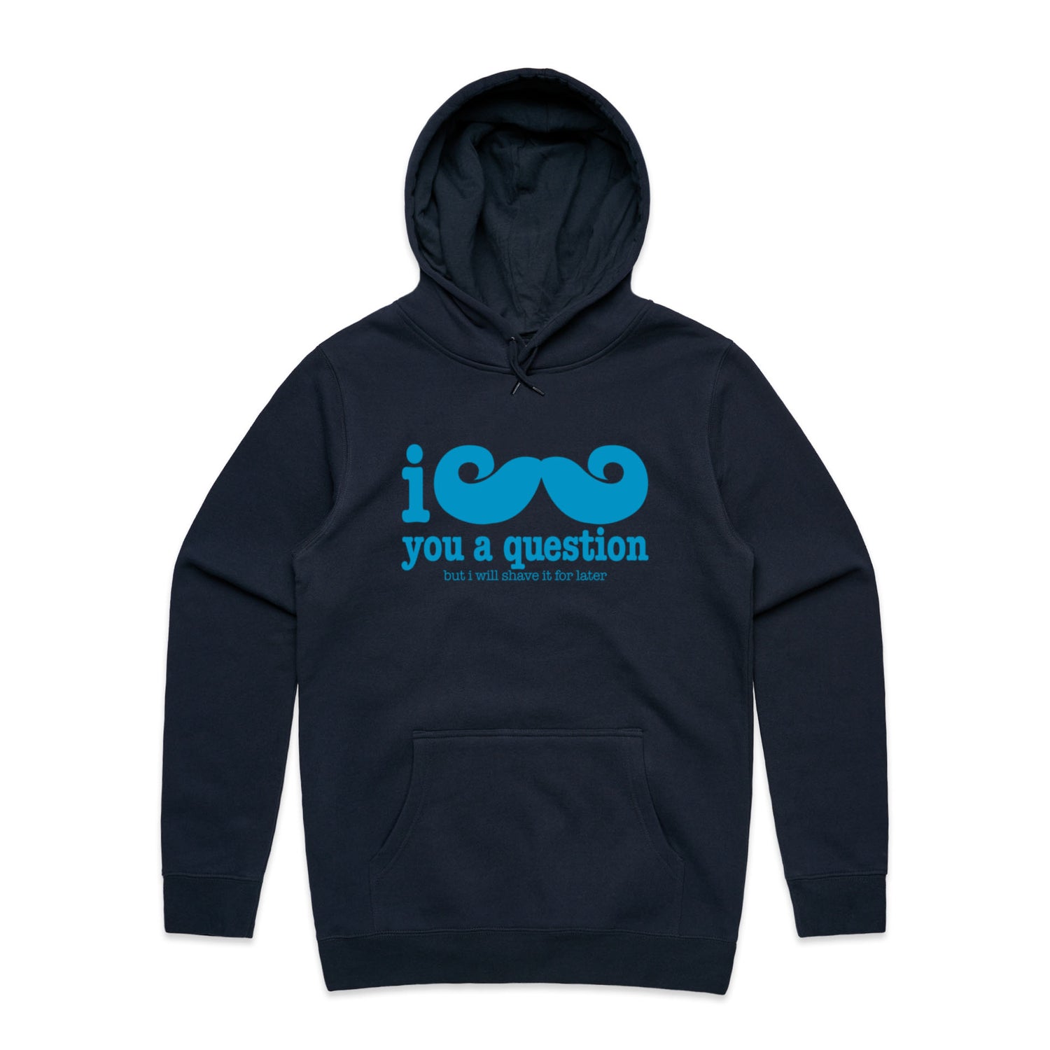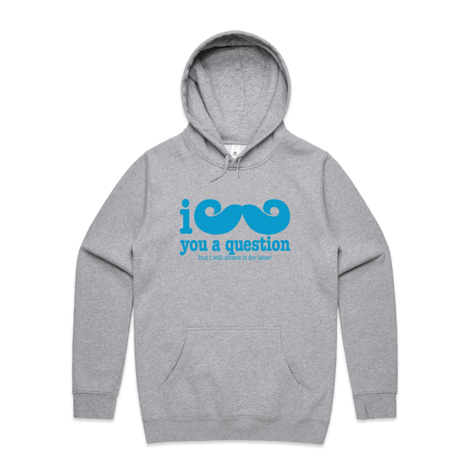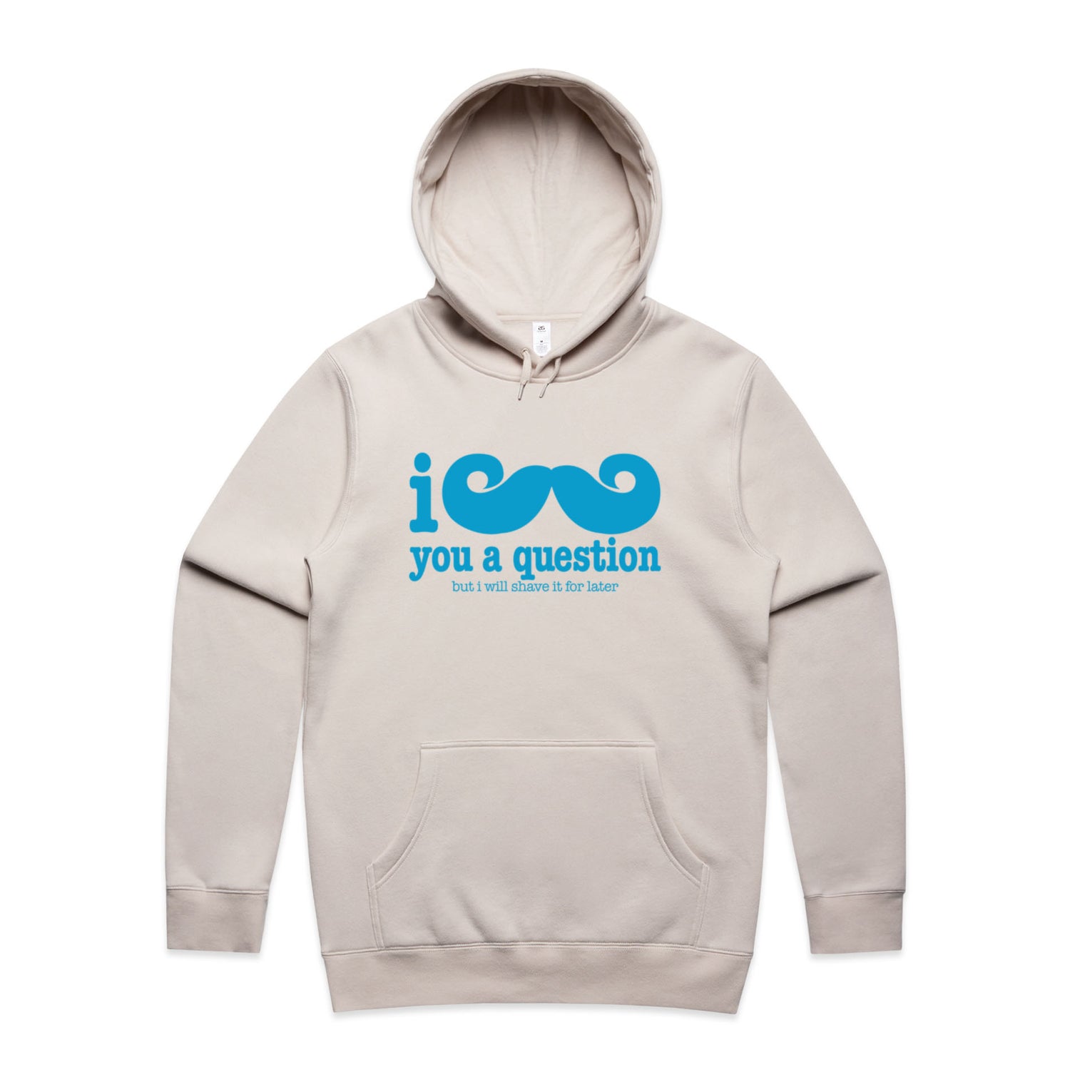 Get ready to tickle your funny bone and your fashion sense with TheHoodie's "I Mustache You a Question" Unisex Hooded Sweatshirt. This isn't just any hoodie – it’s your new go-to for laughs and laid-back style. With its cheeky blue ink print, you'll be cutting a dash everywhere you go, whether you're grabbing a flat white or chilling with your mates.