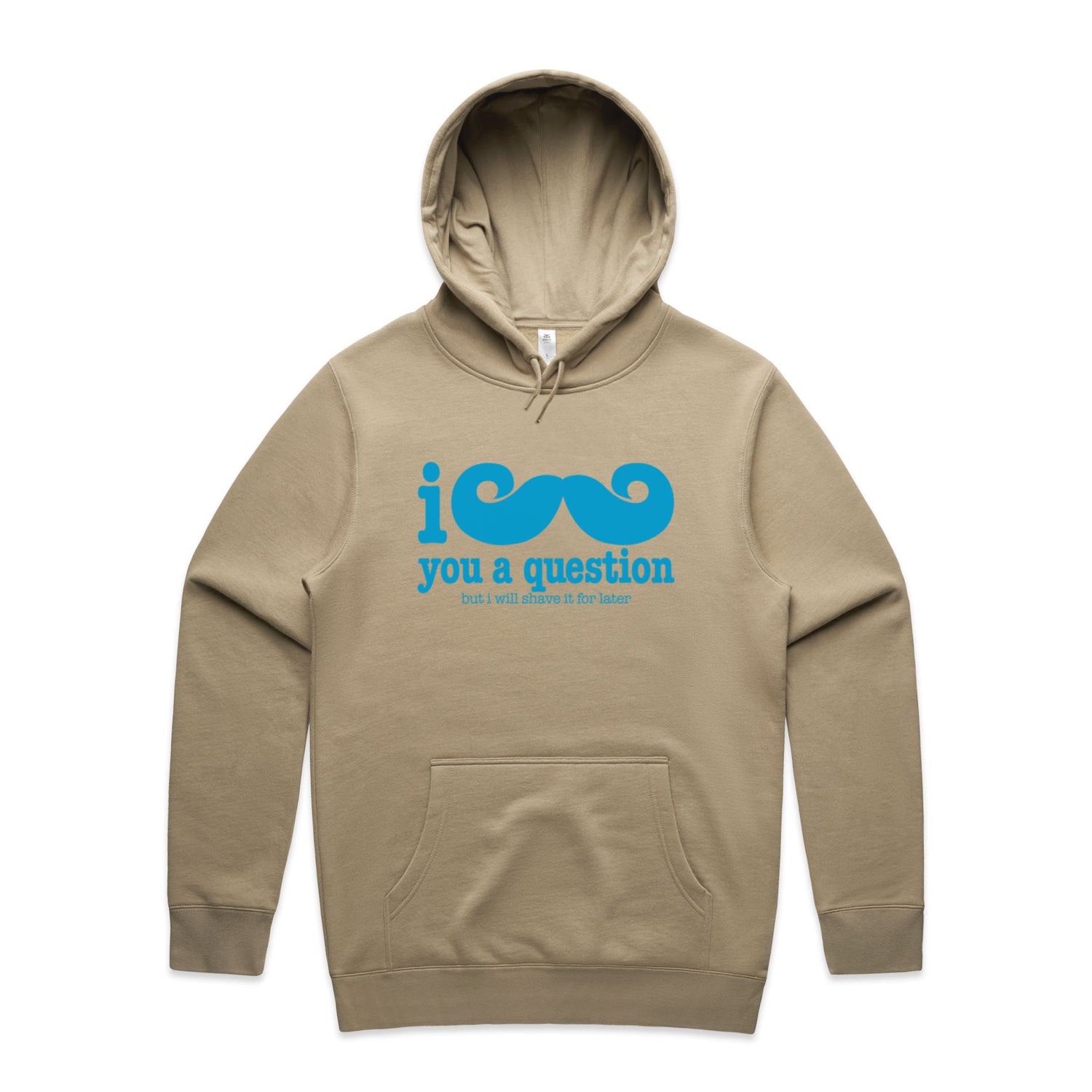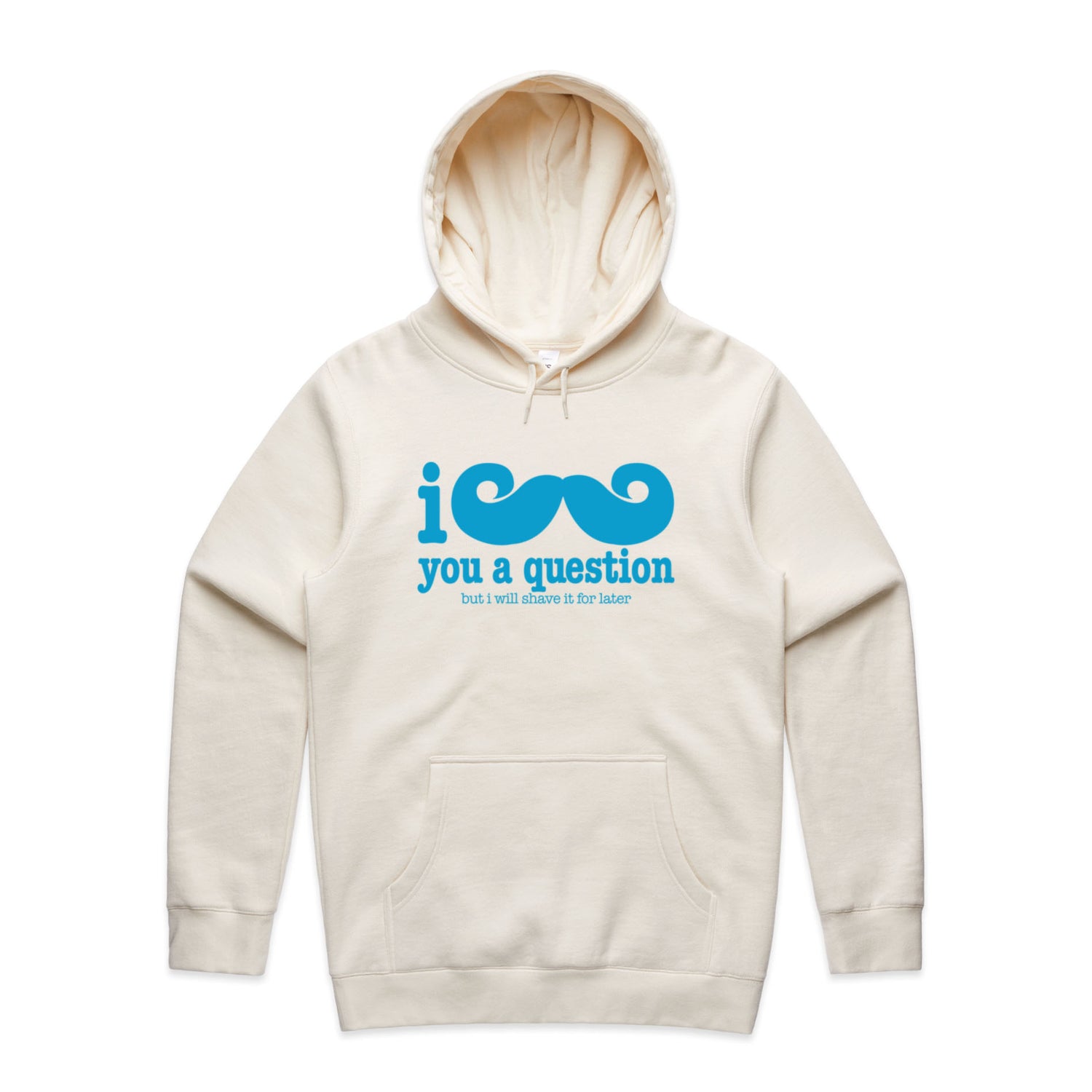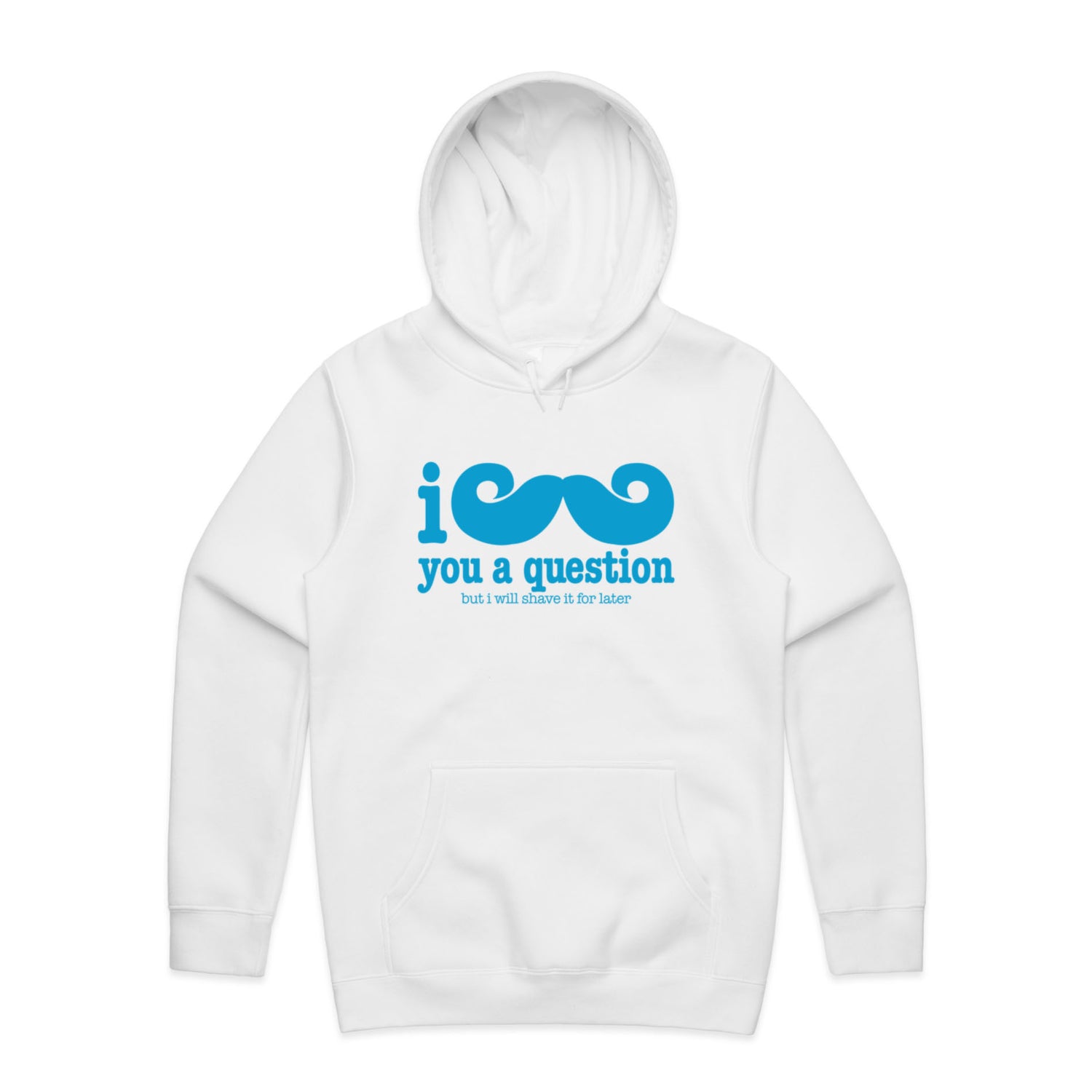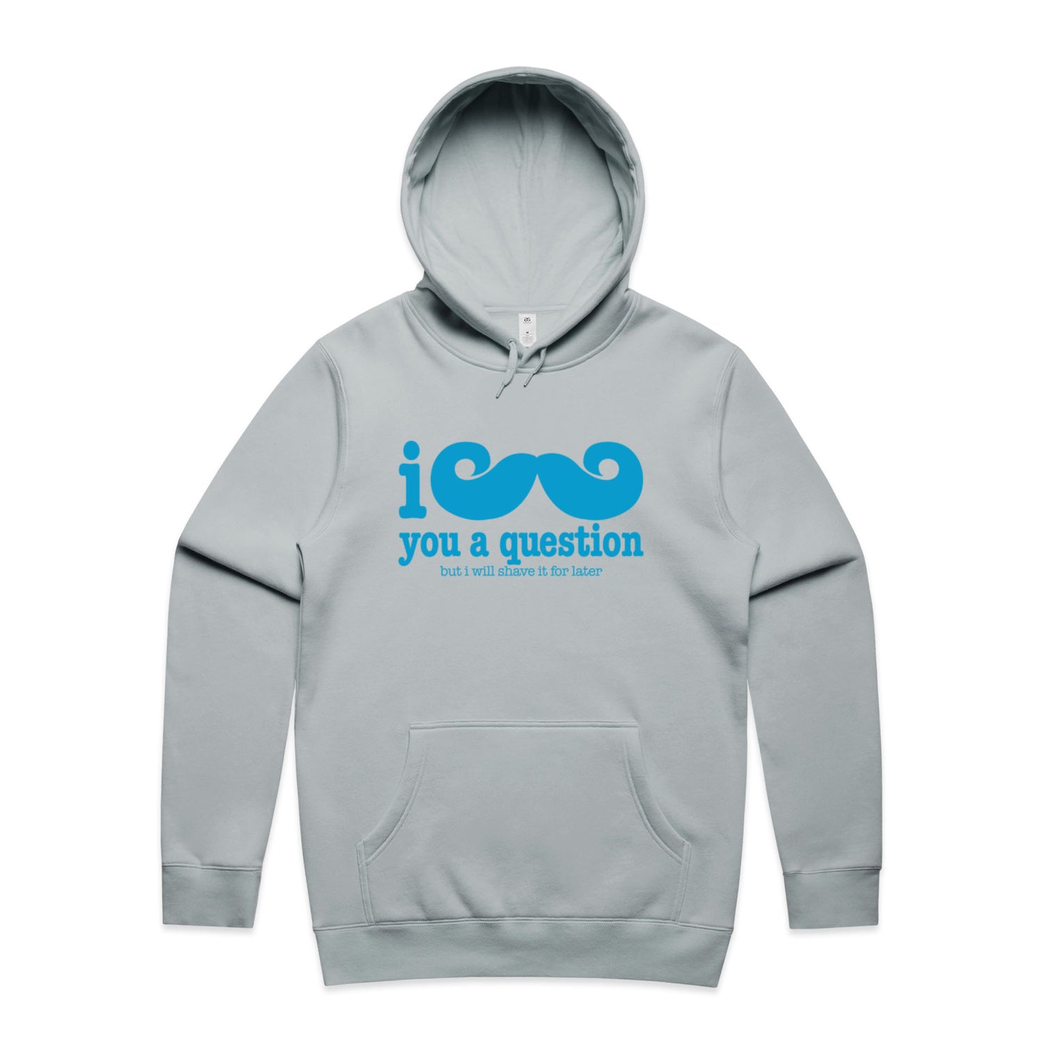 Get ready to tickle your funny bone and your fashion sense with TheHoodie's "I Mustache You a Question" Unisex Hooded Sweatshirt. This isn't just any hoodie – it’s your new go-to for laughs and laid-back style. With its cheeky blue ink print, you'll be cutting a dash everywhere you go, whether you're grabbing a flat white or chilling with your mates.