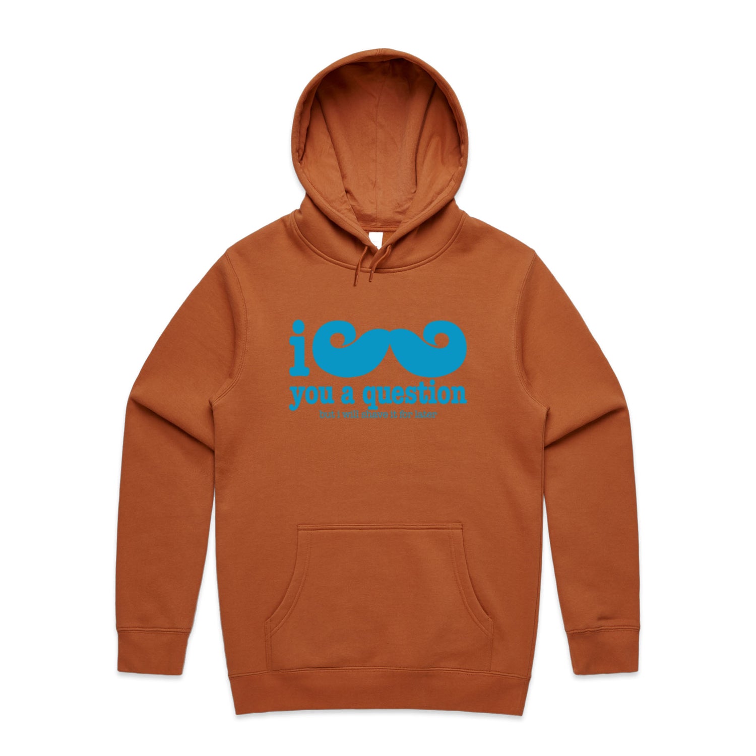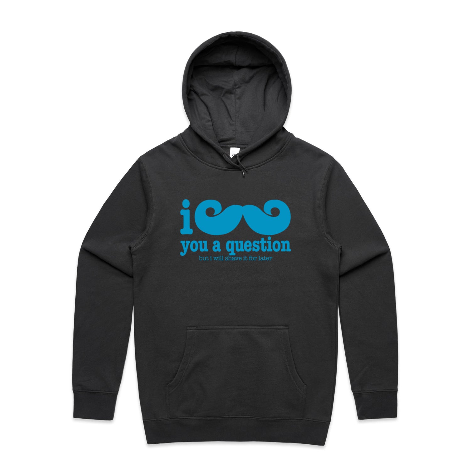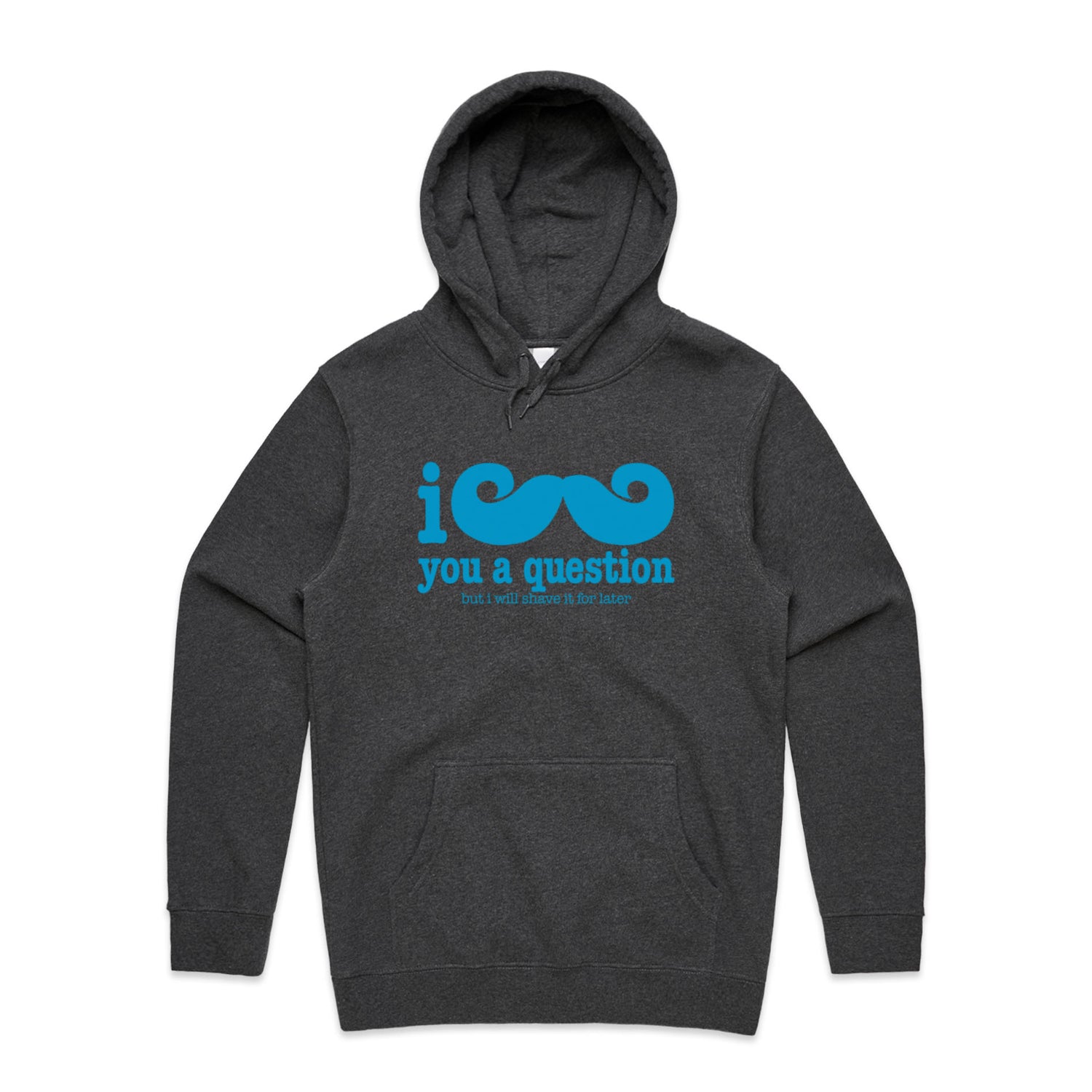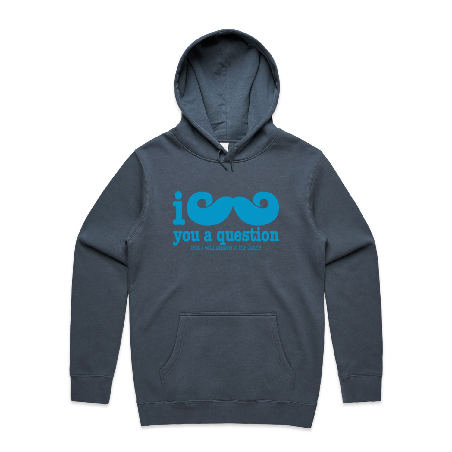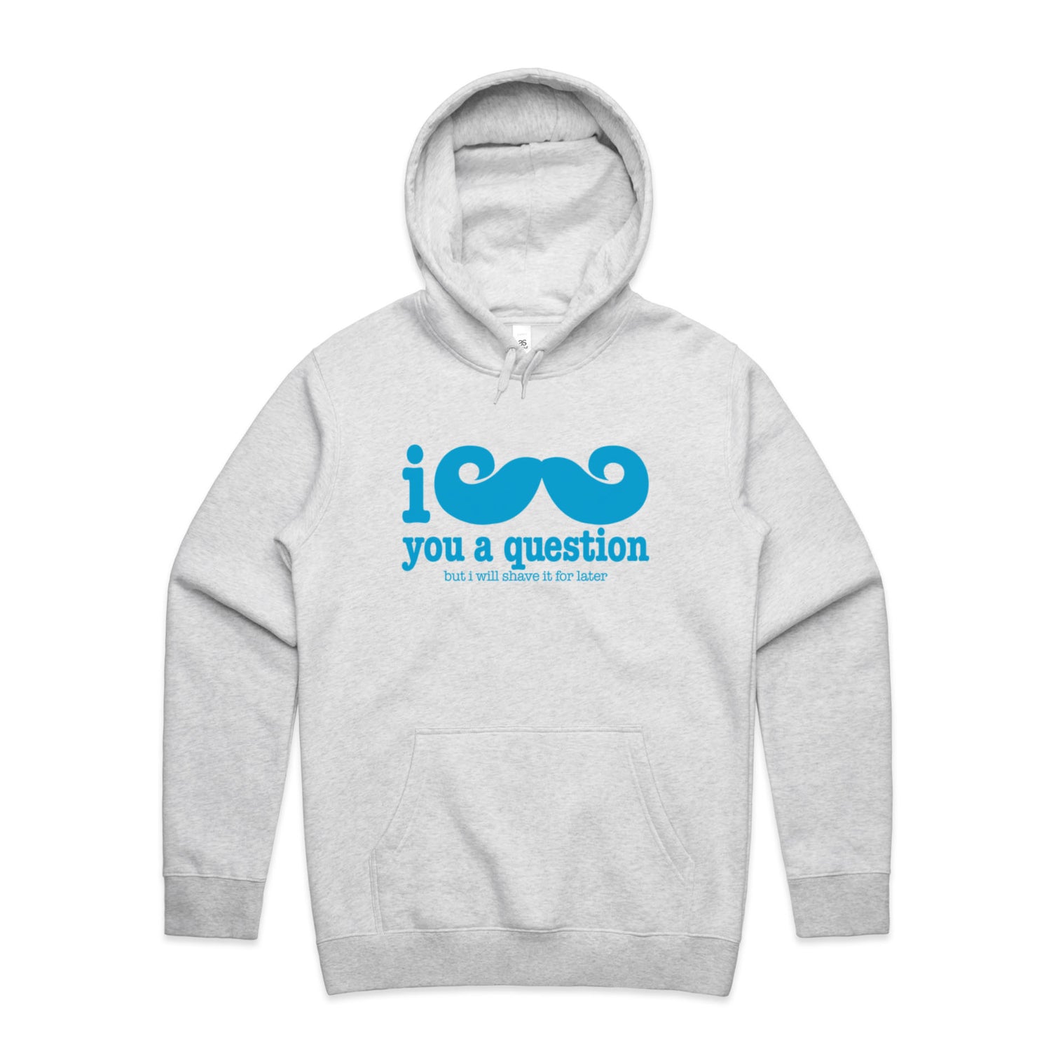 Get ready to tickle your funny bone and your fashion sense with TheHoodie's "I Mustache You a Question" Unisex Hooded Sweatshirt. This isn't just any hoodie – it’s your new go-to for laughs and laid-back style. With its cheeky blue ink print, you'll be cutting a dash everywhere you go, whether you're grabbing a flat white or chilling with your mates.