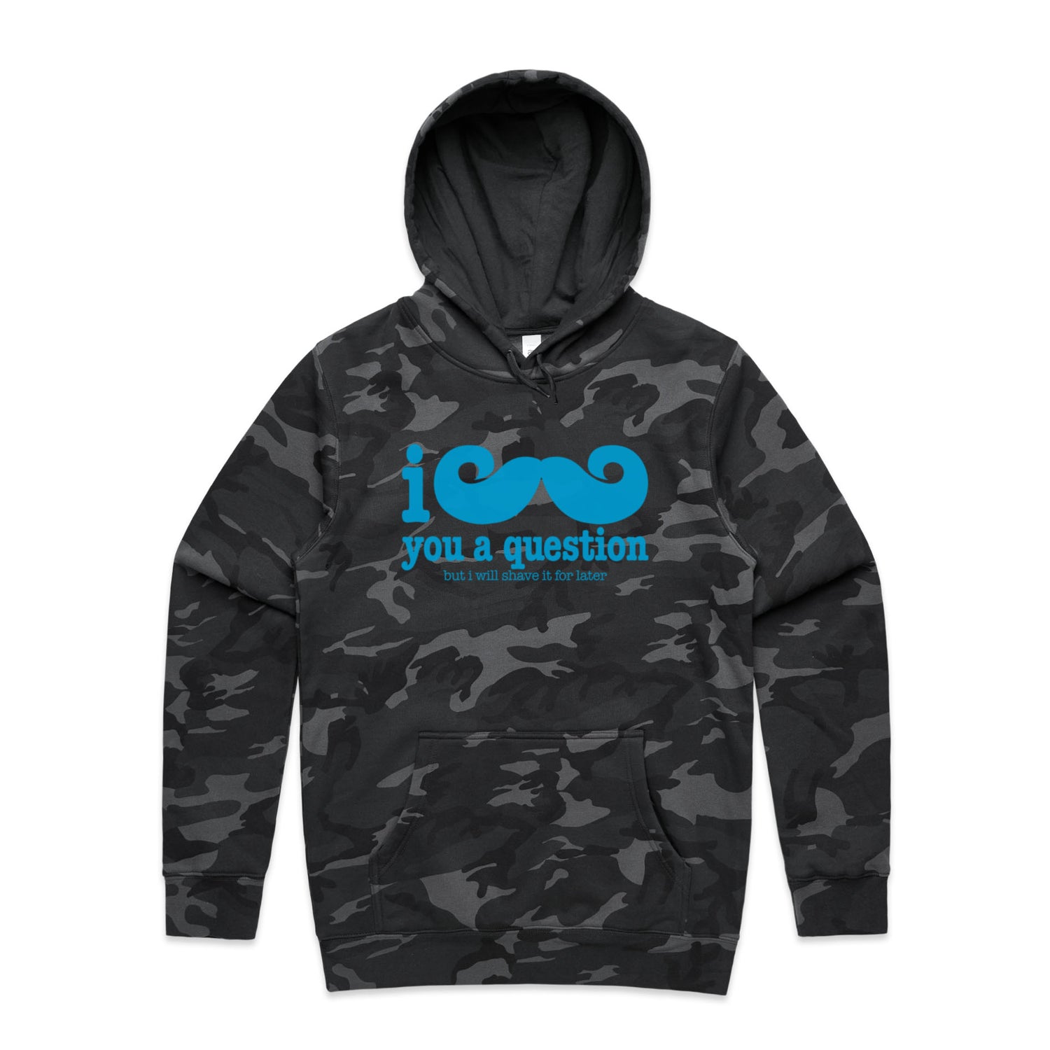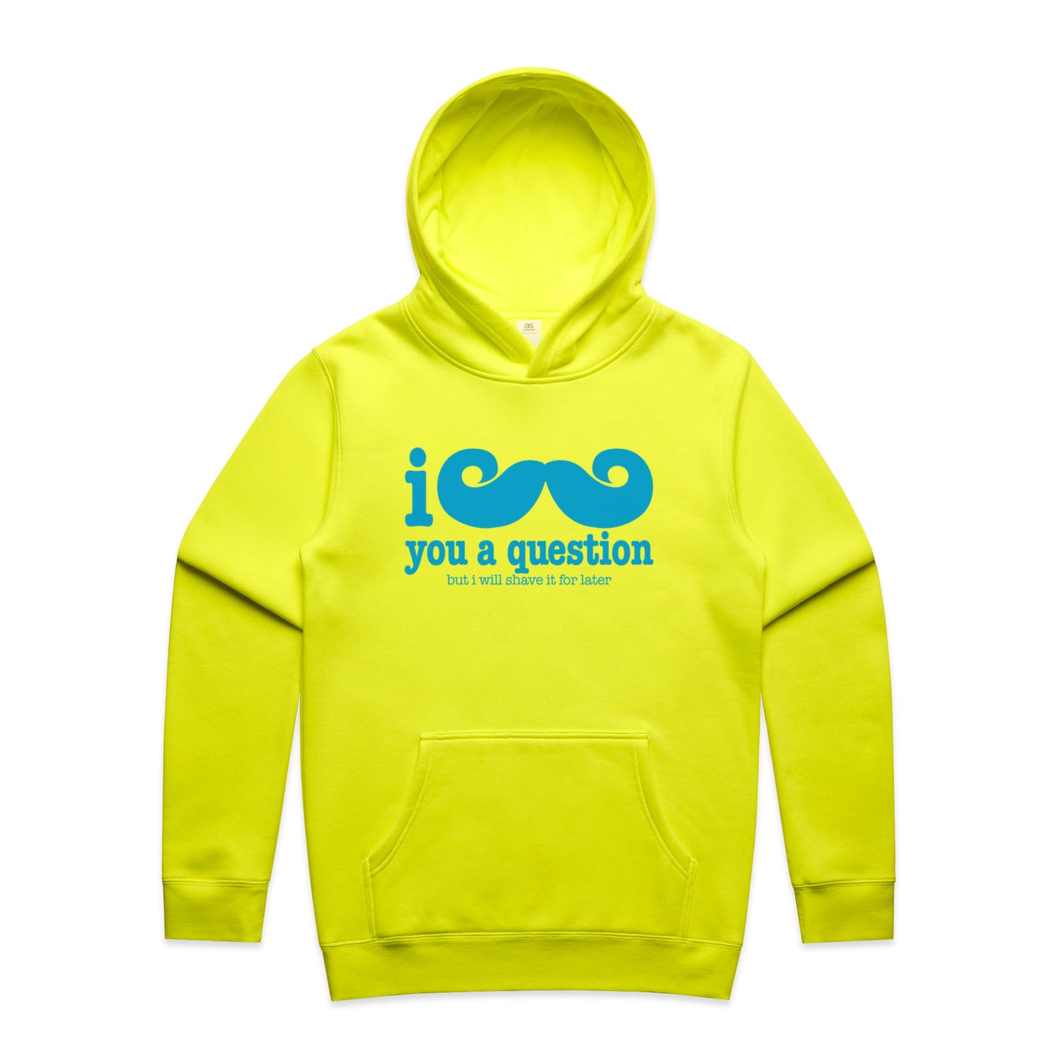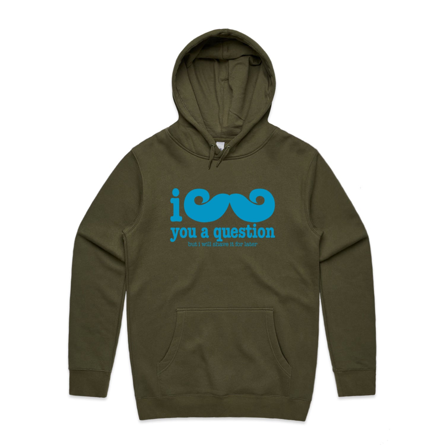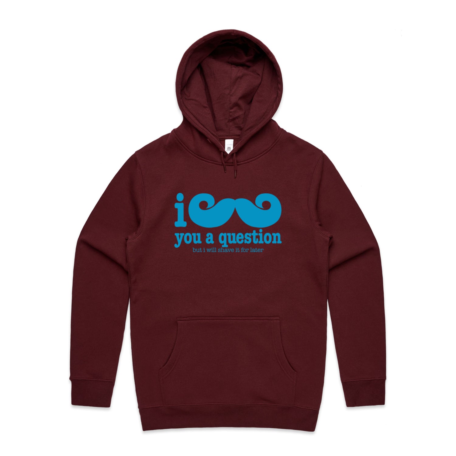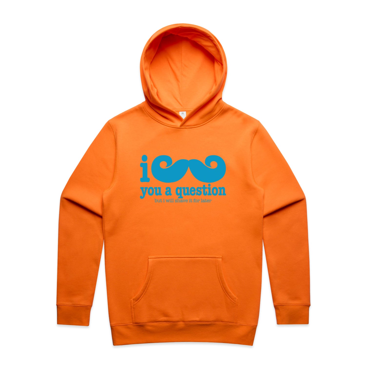 Get ready to tickle your funny bone and your fashion sense with TheHoodie's "I Mustache You a Question" Unisex Hooded Sweatshirt. This isn't just any hoodie – it’s your new go-to for laughs and laid-back style. With its cheeky blue ink print, you'll be cutting a dash everywhere you go, whether you're grabbing a flat white or chilling with your mates.