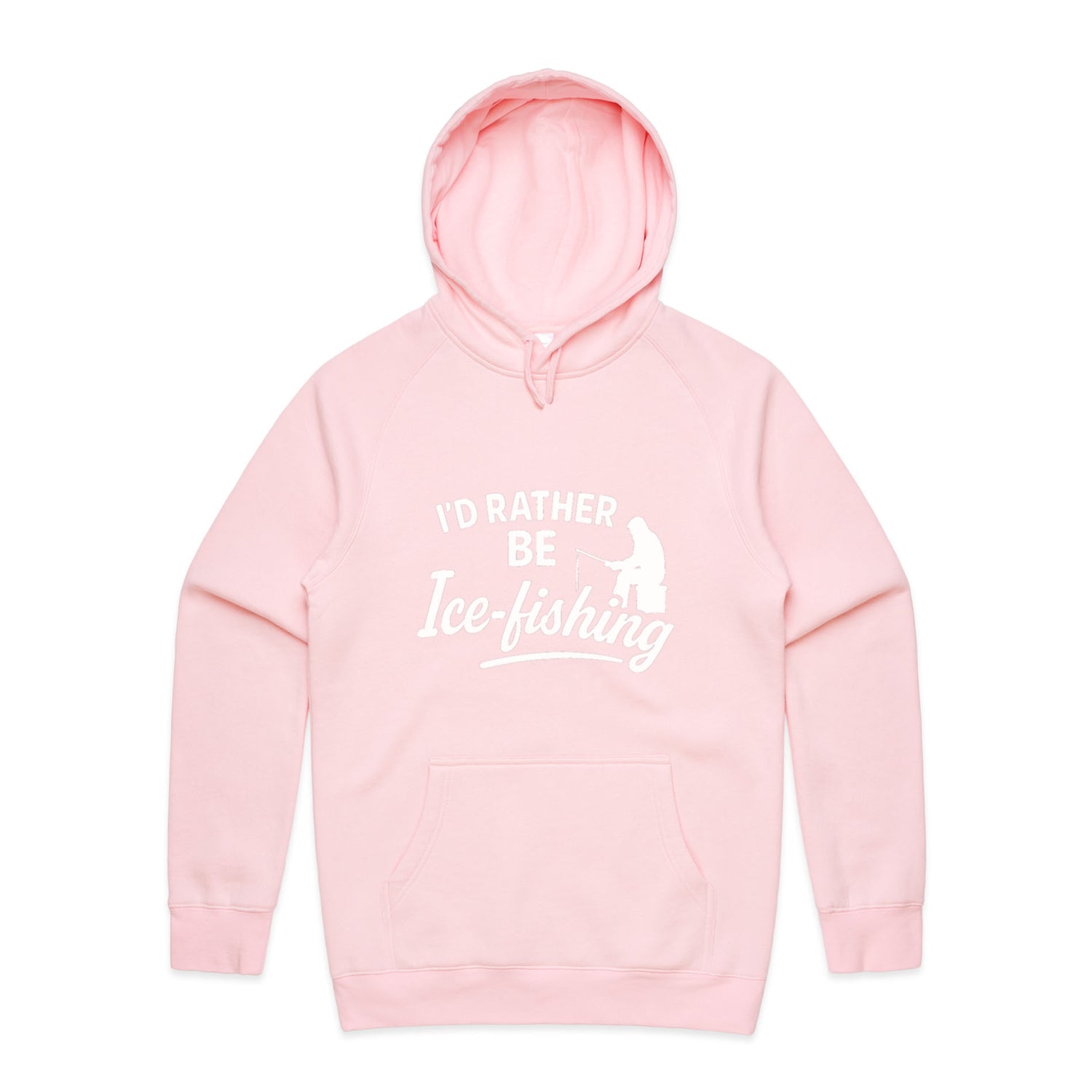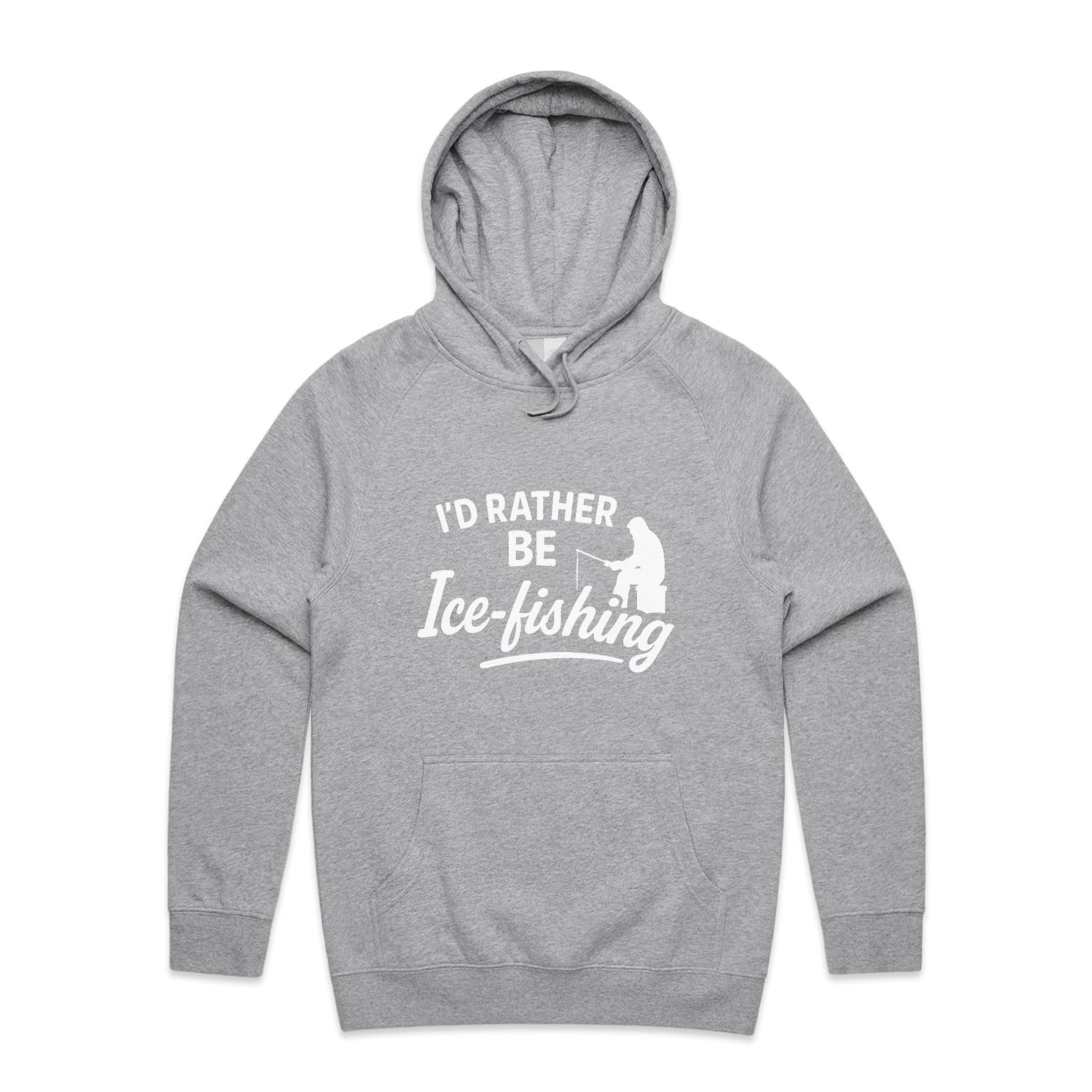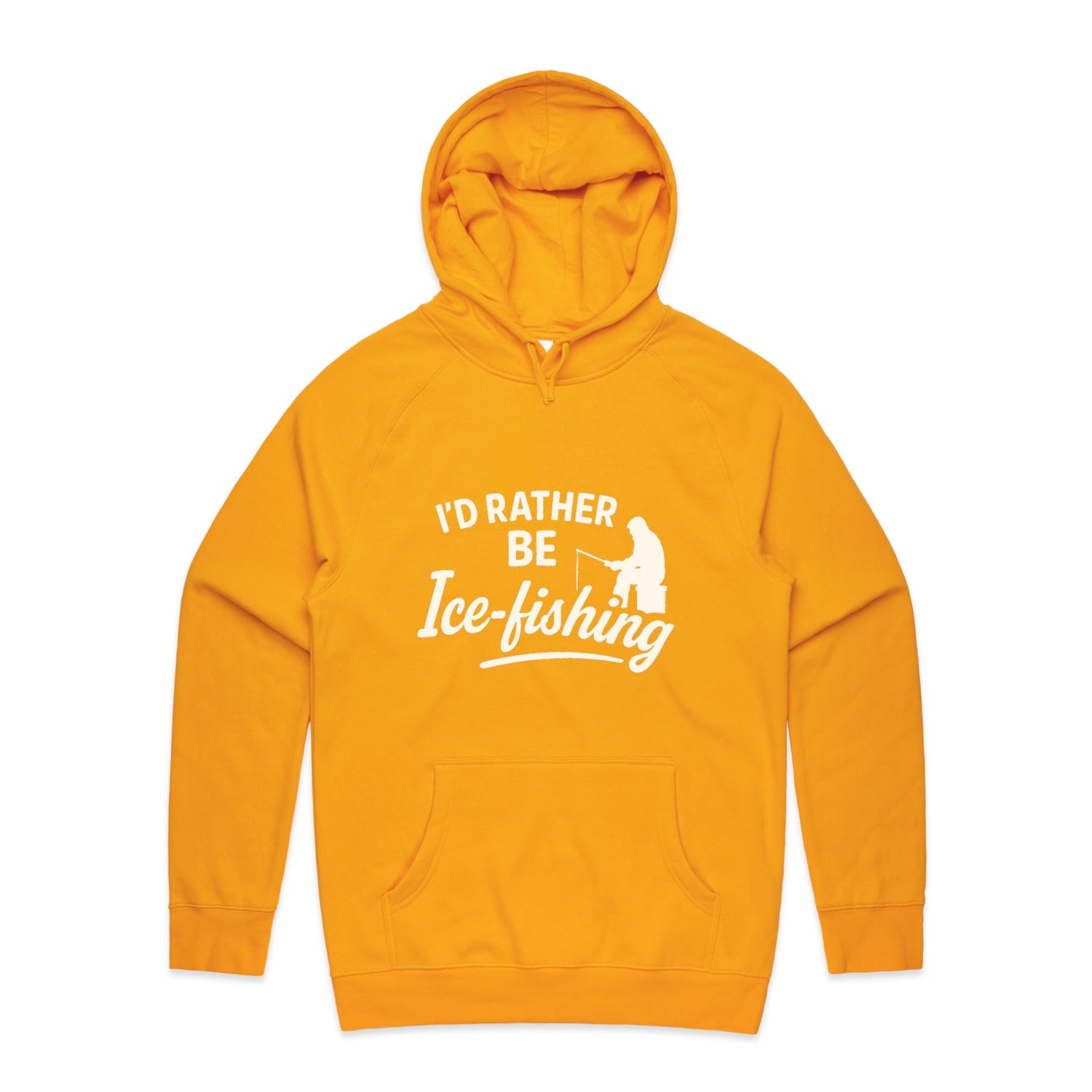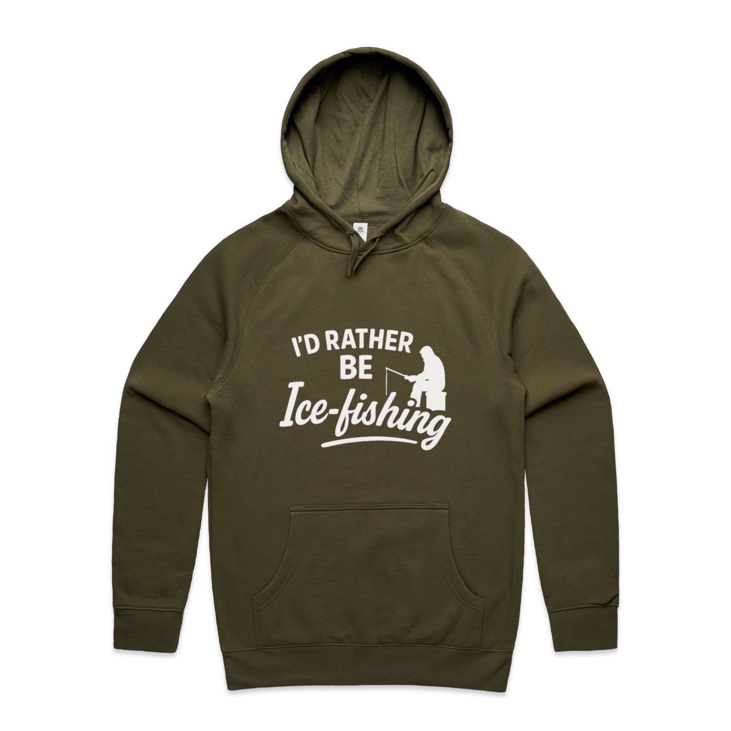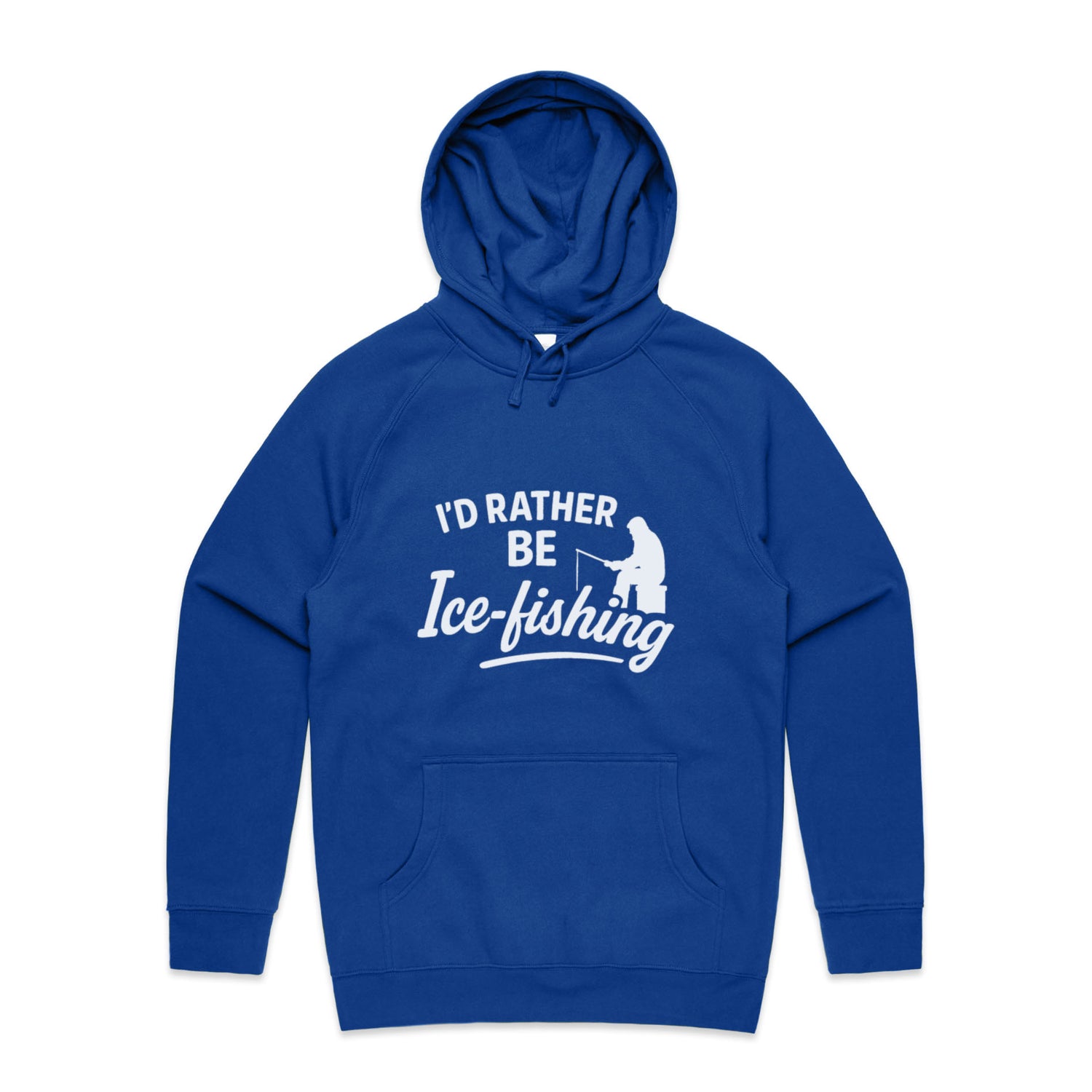 The Hoodies I'd Rather Be Ice-fishing – Men's Hooded Sweatshirt is a high-quality men's hooded sweatshirt, printed with white ink on the trusted AS Colour Supply Hood 5101. With a regular fit and mid-weight feel, it's crafted from a premium blend of 80% cotton and 20% polyester anti-pill fleece, making it a durable and comfortable staple for any wardrobe. The pullover design features raglan sleeves, a lined hood with tonal drawcord, ribbed sleeve cuffs, and a roomy kangaroo pocket — all designed to keep you warm while looking effortlessly sharp.
