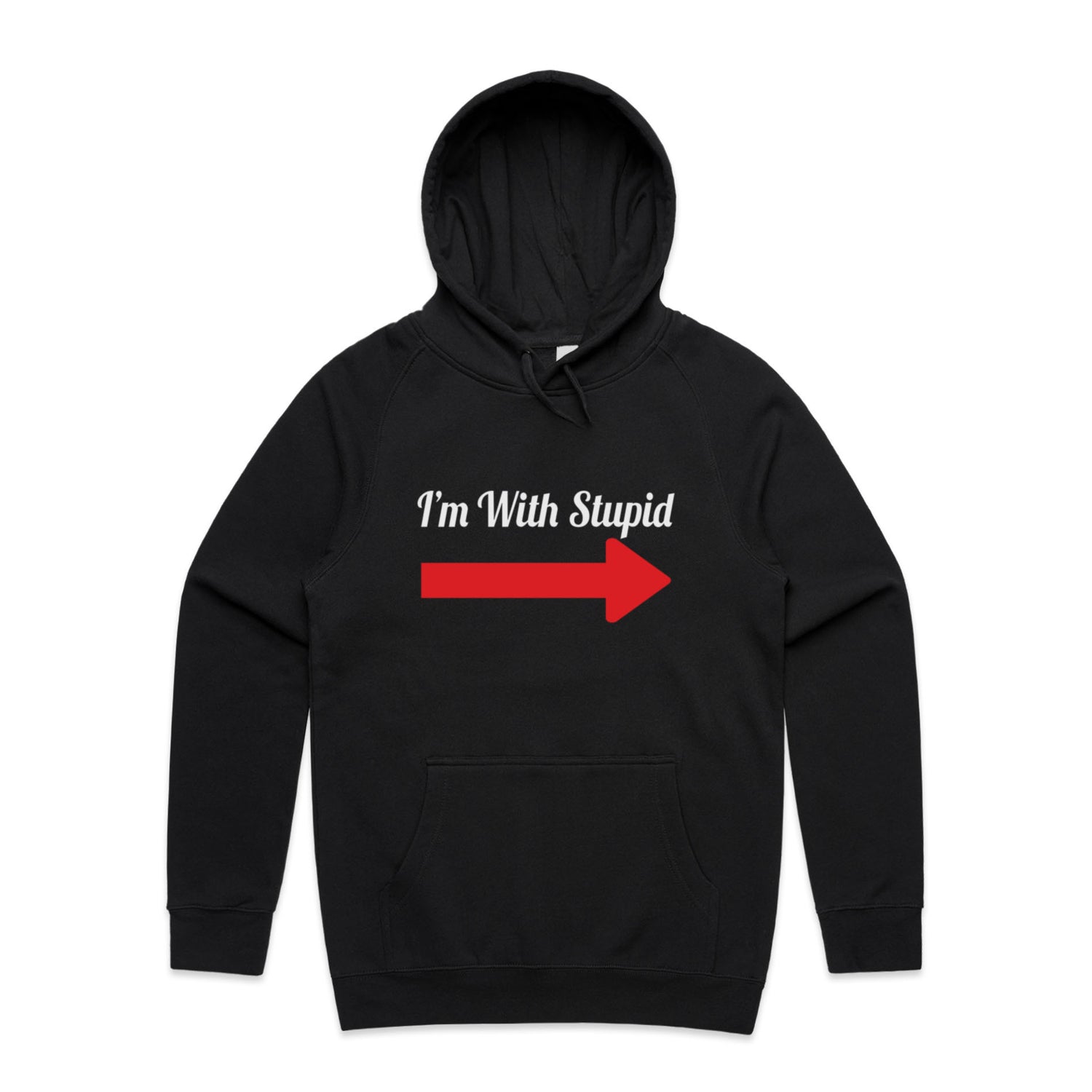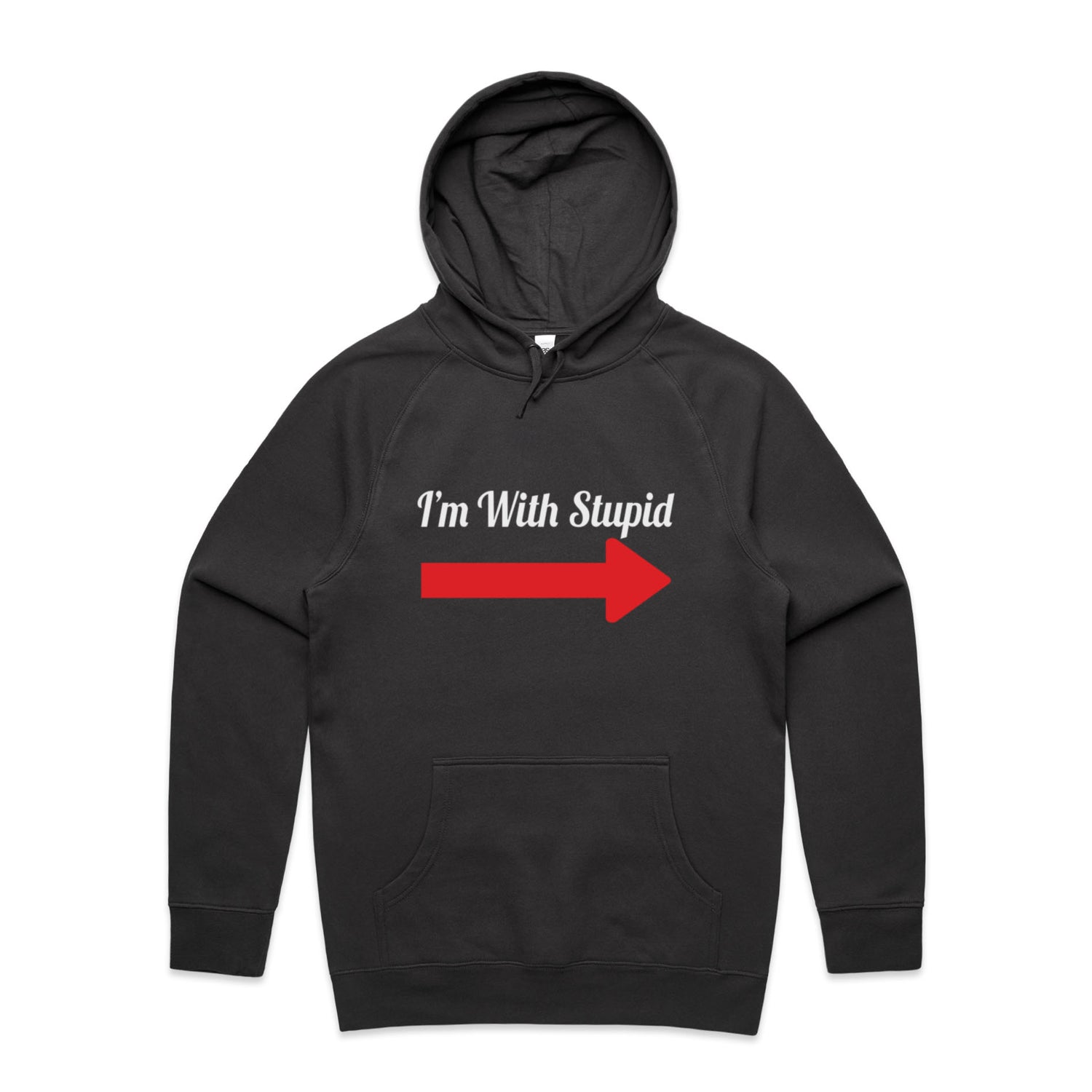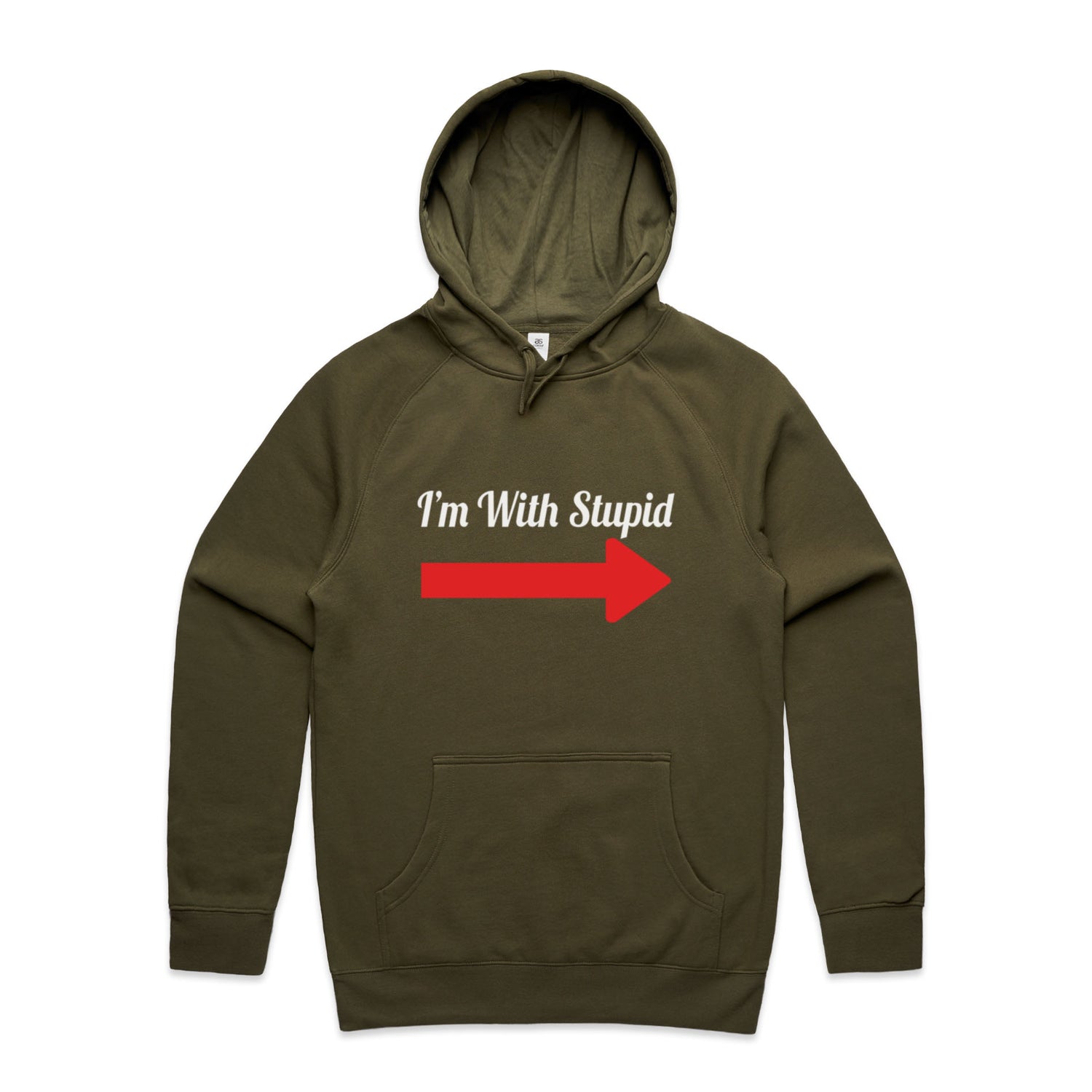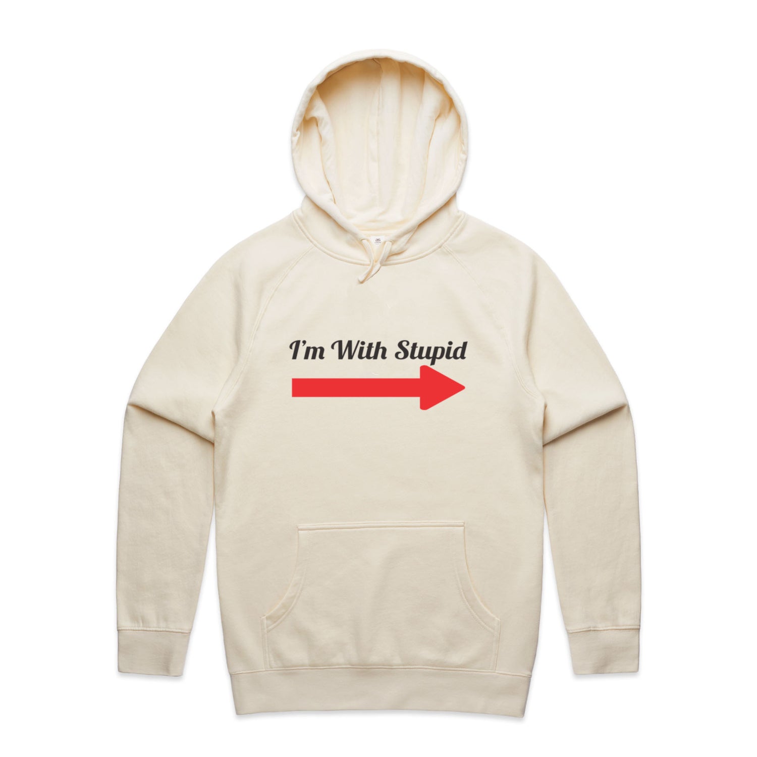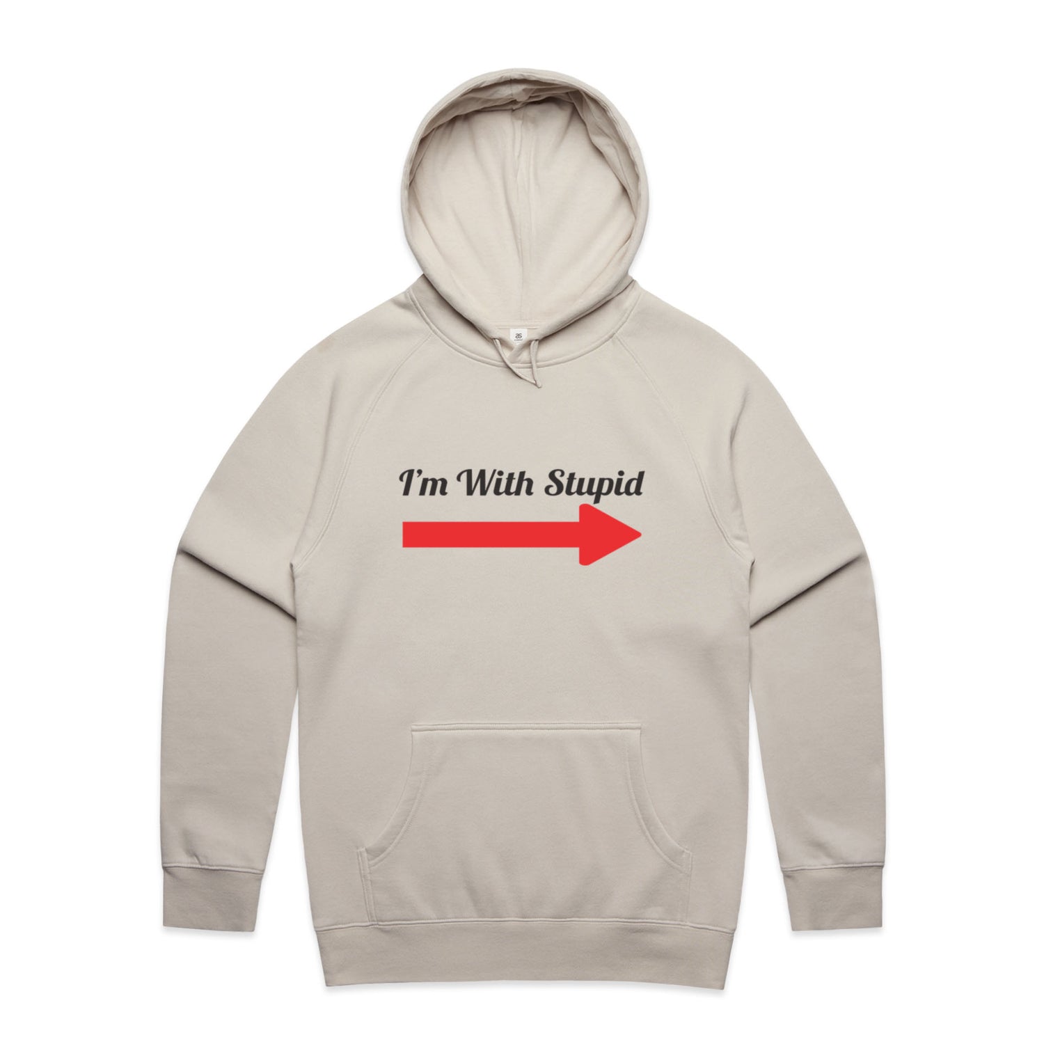 The Hoodies Im Wtith Stupid – Men's Hooded Sweatshirt is a high-quality men's hooded sweatshirt, printed with black ink on the trusted AS Colour Supply Hood 5101. With a regular fit and mid-weight feel, it's crafted from a premium blend of 80% cotton and 20% polyester anti-pill fleece, making it a durable and comfortable staple for any wardrobe. The pullover design features raglan sleeves, a lined hood with tonal drawcord, ribbed sleeve cuffs, and a roomy kangaroo pocket — all designed to keep you warm while looking effortlessly sharp.