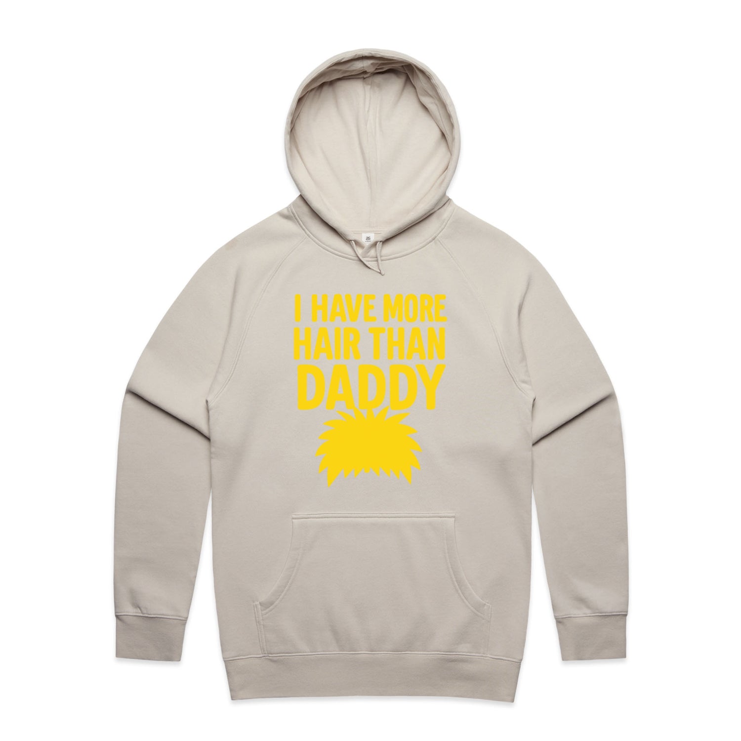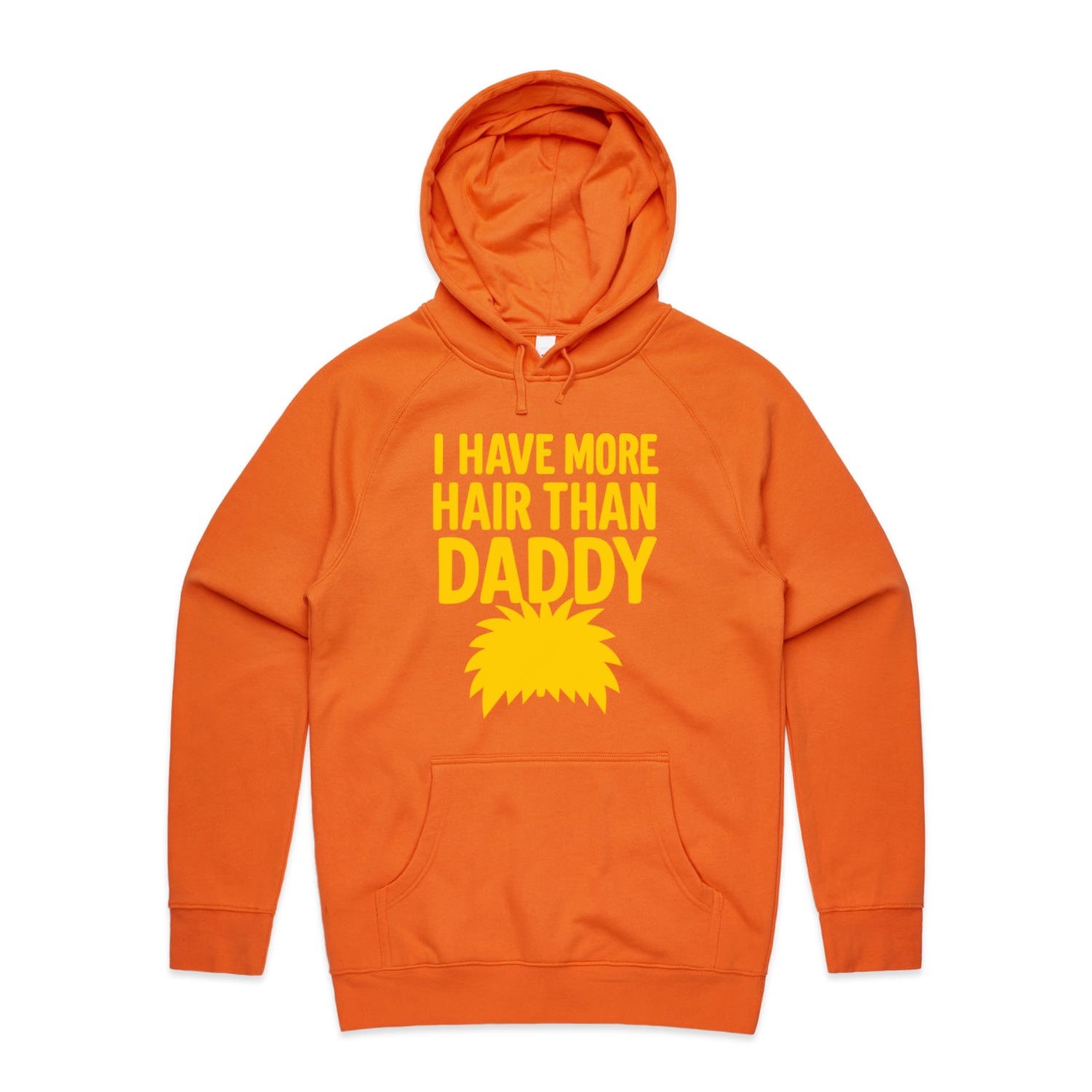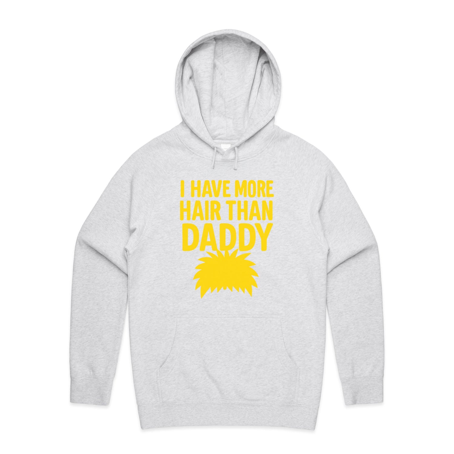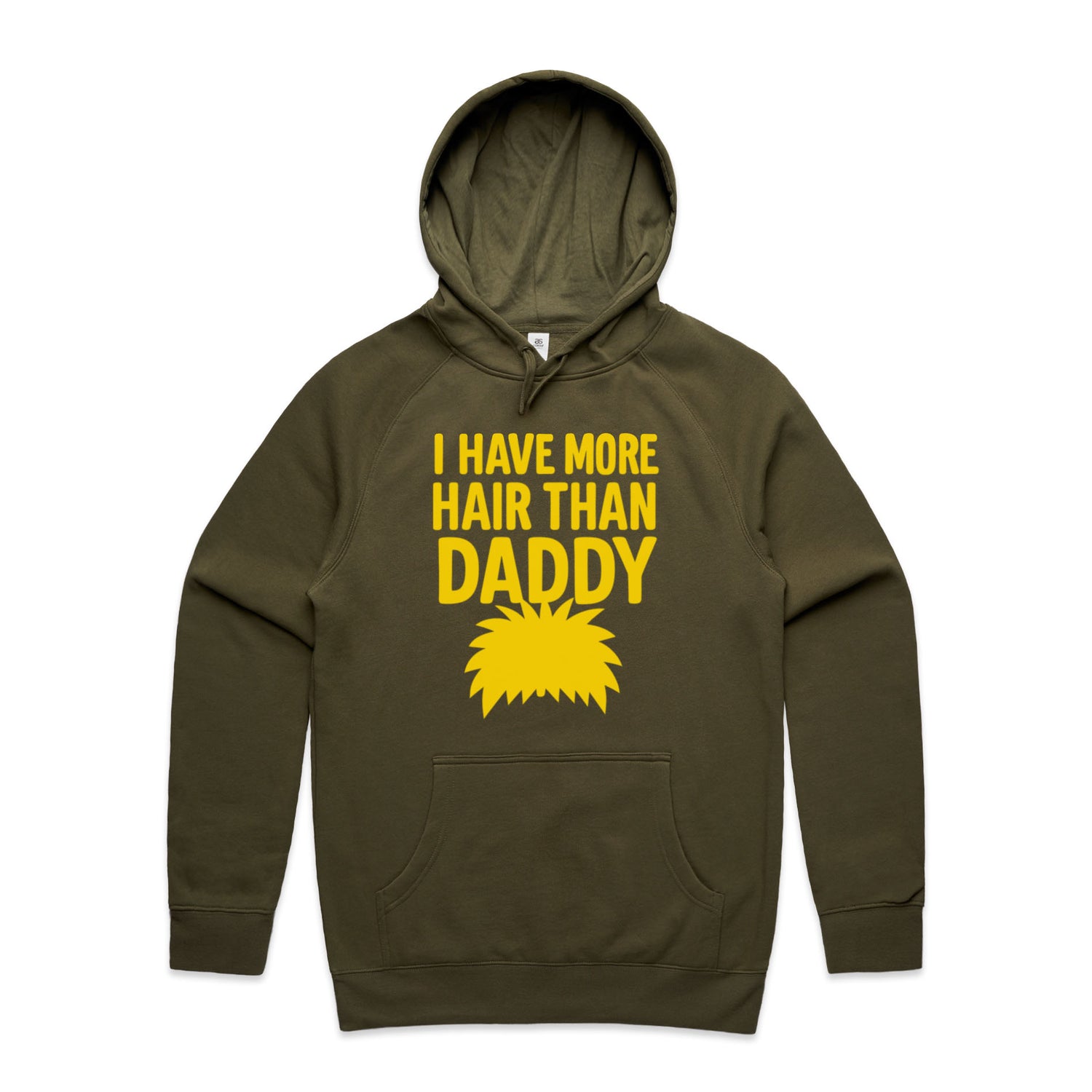 The Hoodies More Hair Than Daddy! – Men's Hooded Sweatshirt is a high-quality men's hooded sweatshirt, printed with yellow ink on the trusted AS Colour Supply Hood 5101. With a regular fit and mid-weight feel, it's crafted from a premium blend of 80% cotton and 20% polyester anti-pill fleece, making it a durable and comfortable staple for any wardrobe. The pullover design features raglan sleeves, a lined hood with tonal drawcord, ribbed sleeve cuffs, and a roomy kangaroo pocket — all designed to keep you warm while looking effortlessly sharp.
