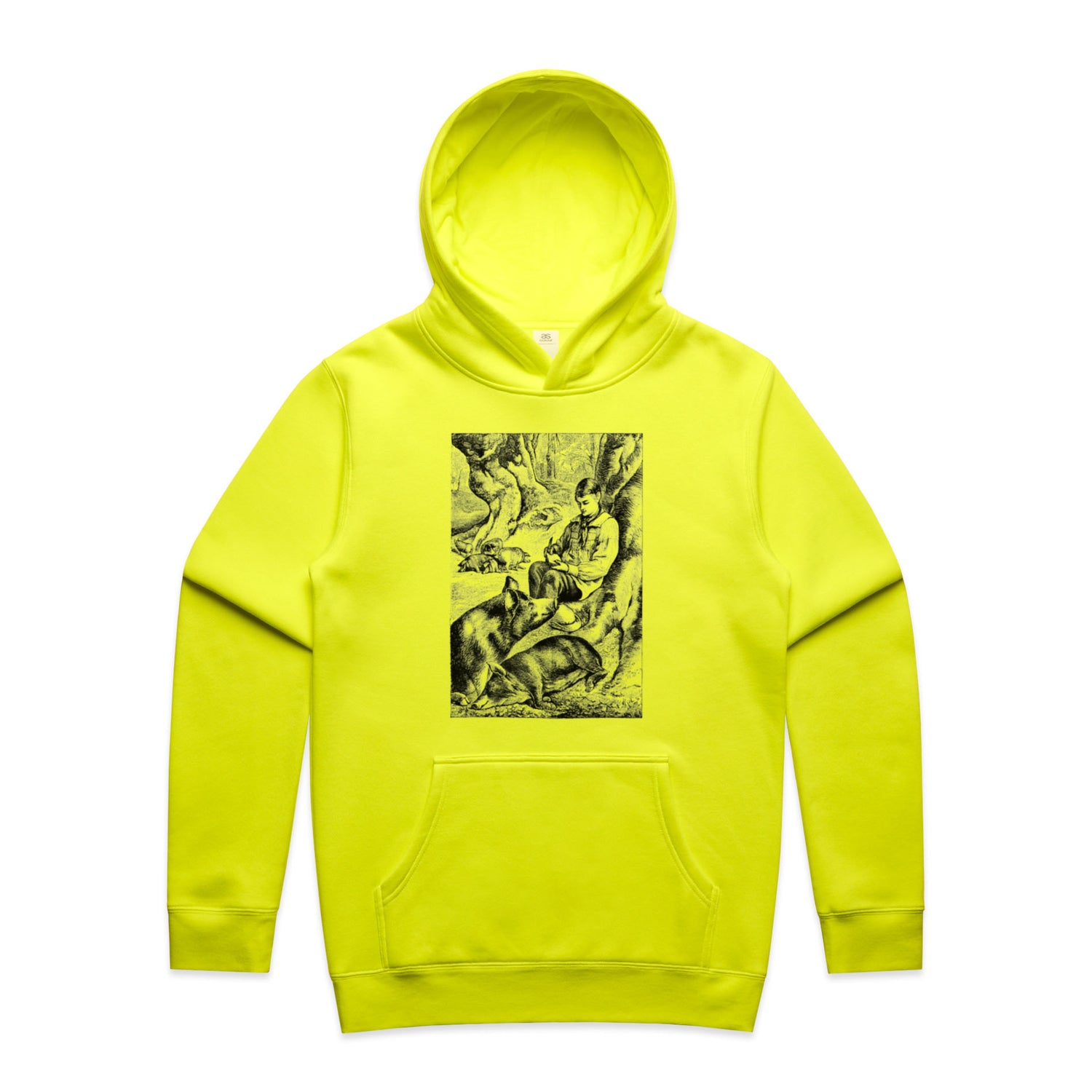 Printed in jet black ink, these playful piggies are frolicking amongst ferns and trees, adding a cheeky touch to your attire. With its regular fit and mid-heavy weight, you'll feel like you're wrapped in a hug from a herd of friendly swine. Whether you're on campus, at the beach, or just kicking back with your mates, the Pigs in the Forest hoodie is your new best mate for fun adventures and chill sessions alike.