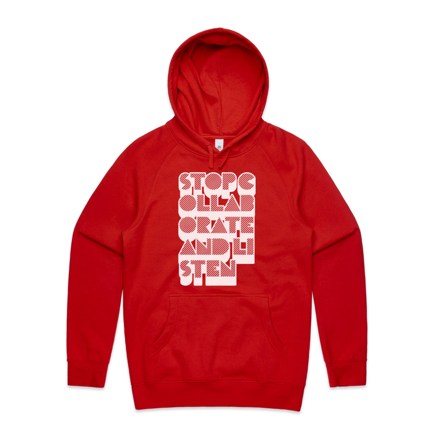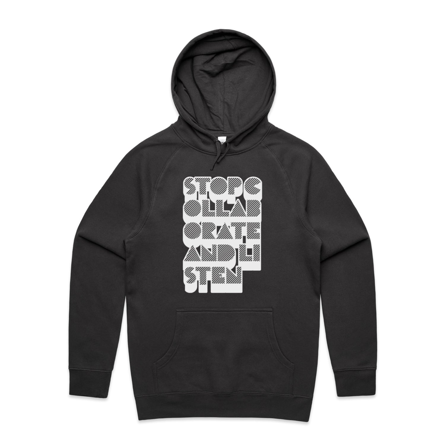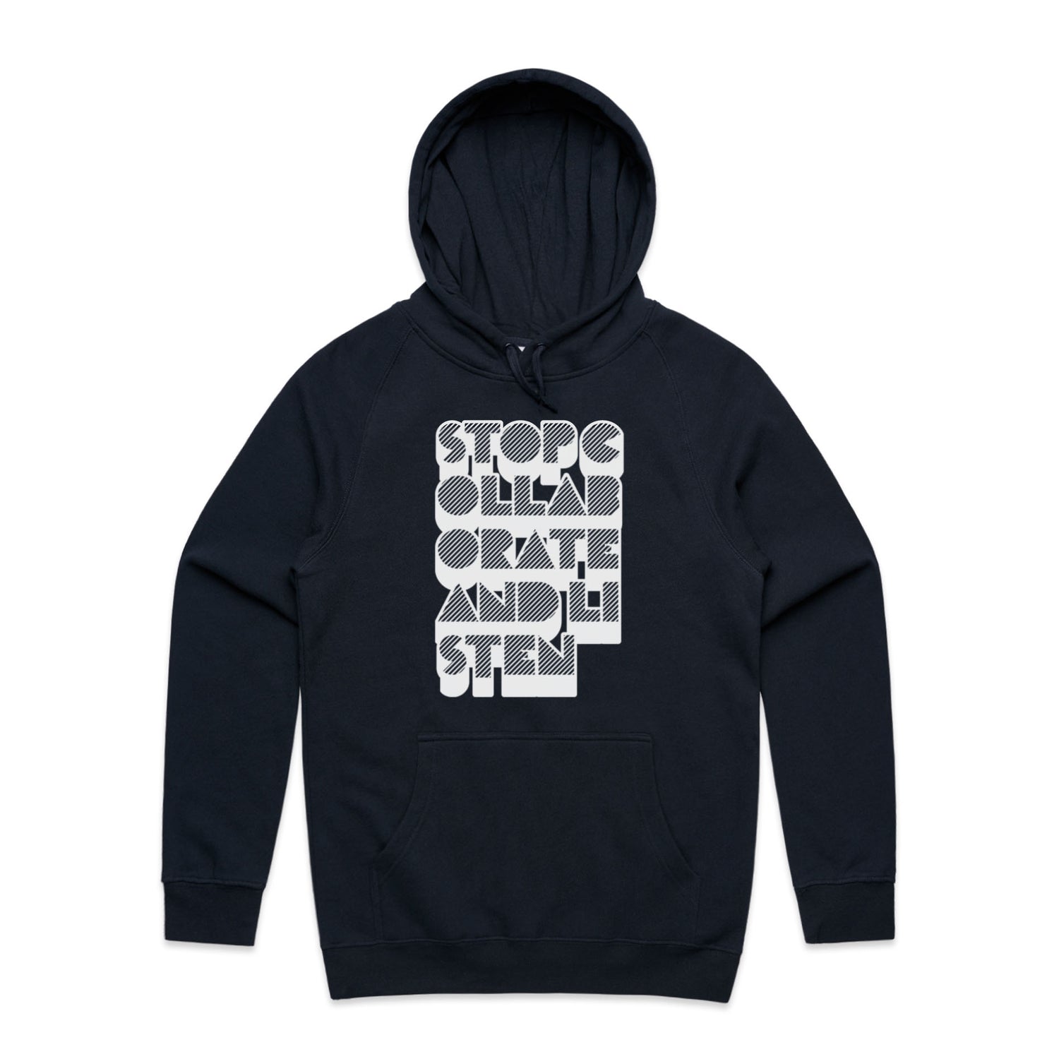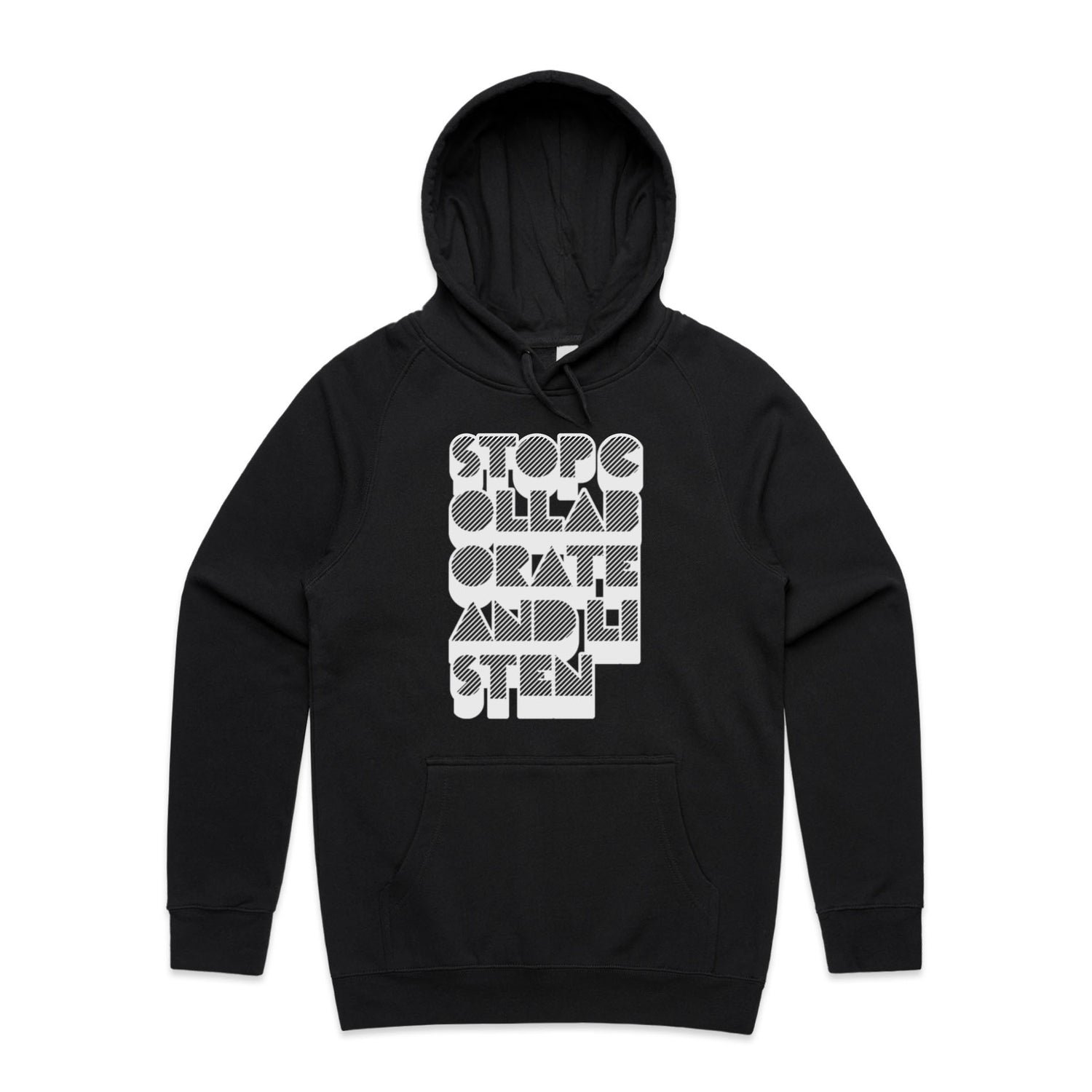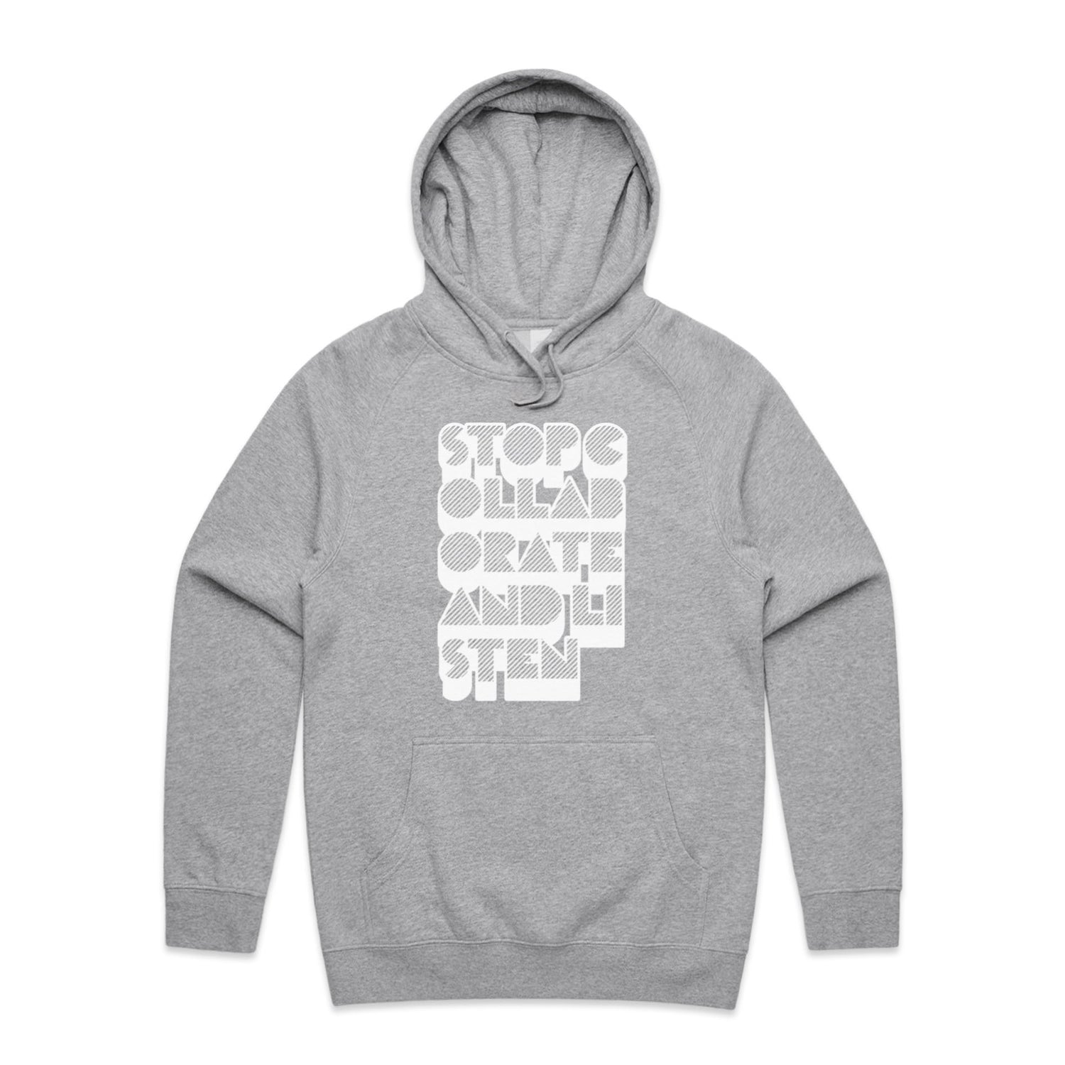 The Hoodies Stop Collaborate Listen – Men's Hooded Sweatshirt is a high-quality men's hooded sweatshirt, printed with white ink on the trusted AS Colour Supply Hood 5101. With a regular fit and mid-weight feel, it's crafted from a premium blend of 80% cotton and 20% polyester anti-pill fleece, making it a durable and comfortable staple for any wardrobe. The pullover design features raglan sleeves, a lined hood with tonal drawcord, ribbed sleeve cuffs, and a roomy kangaroo pocket — all designed to keep you warm while looking effortlessly sharp.
