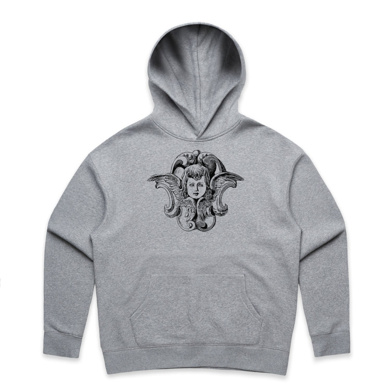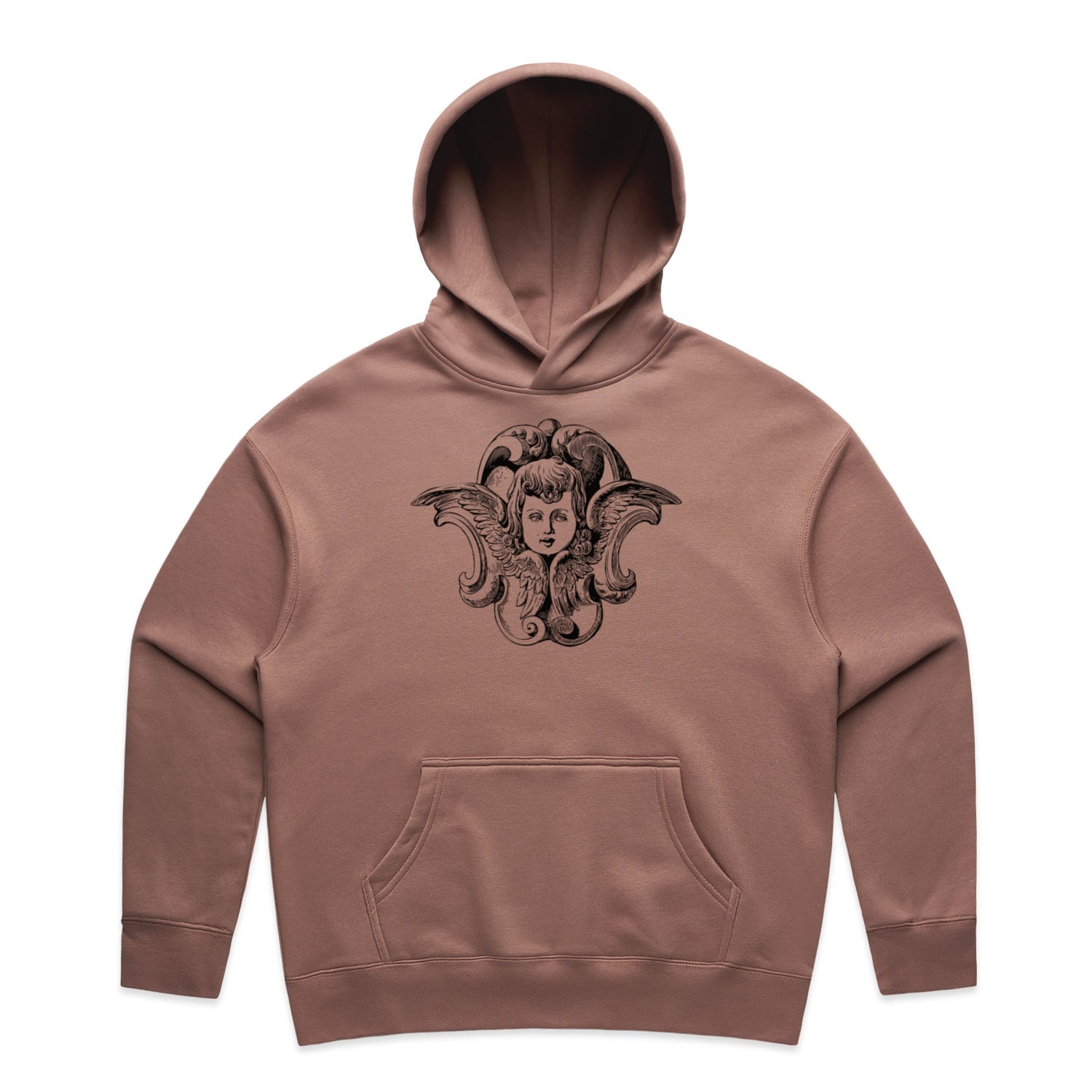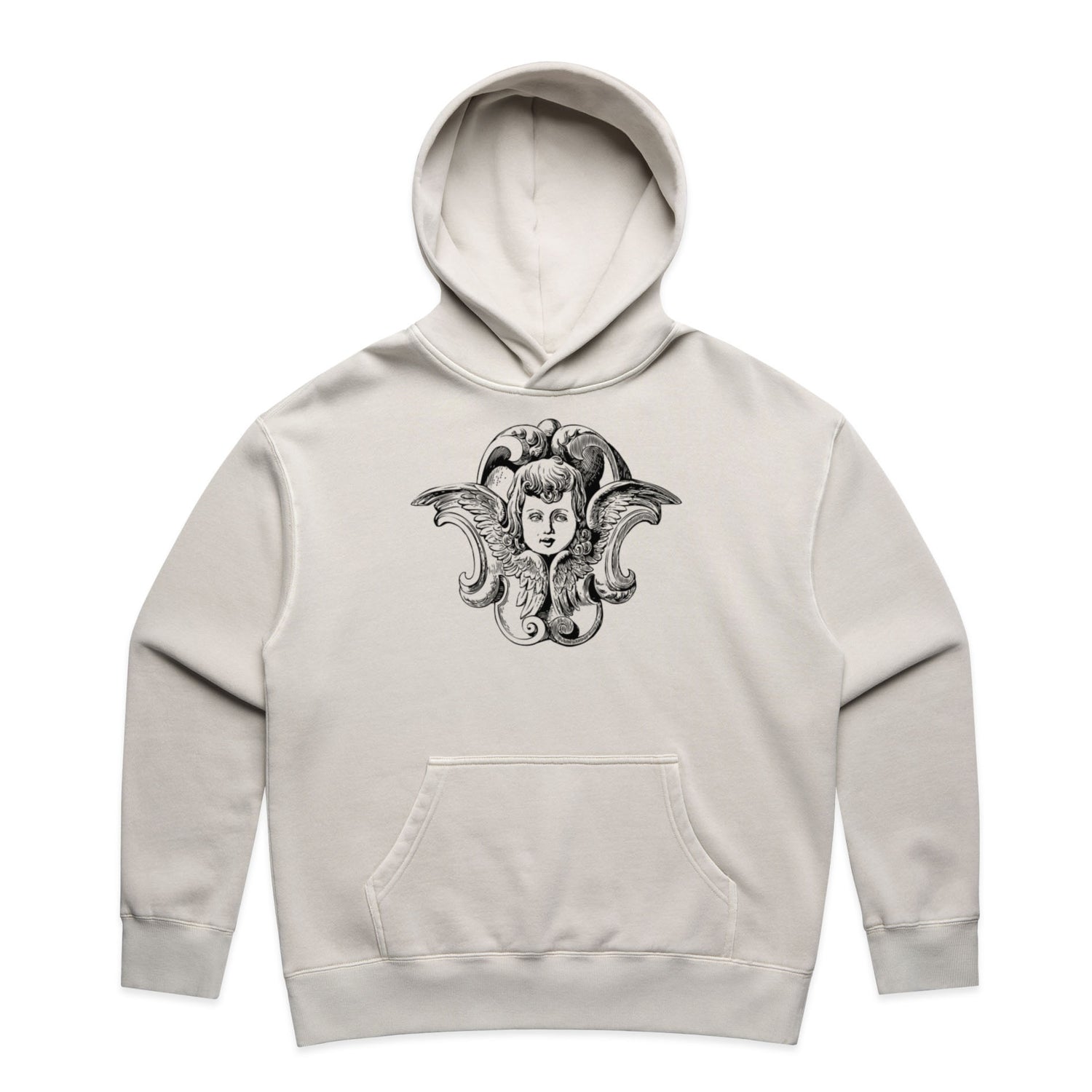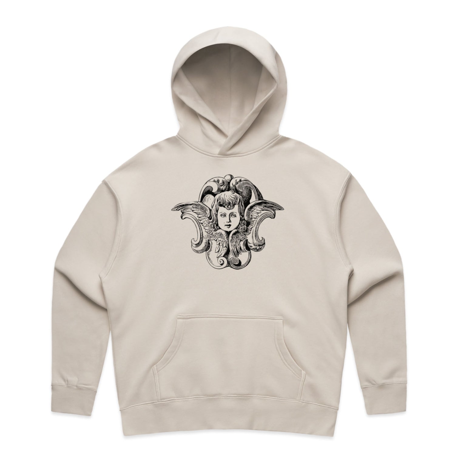 It’s got a roomy pullover hood, your perfect kangaroo pocket buddy, and those cool drop shoulders that scream casual chic. Plus, we're giving a nod to Mother Earth by saving about 7.2 plastic bottles from landfill with every piece—how good is that? The print, a cheeky Cupid carving, comes in a slick black ink, adding that perfect pop of personality on top of a classic or faded vintage colour of your choice.