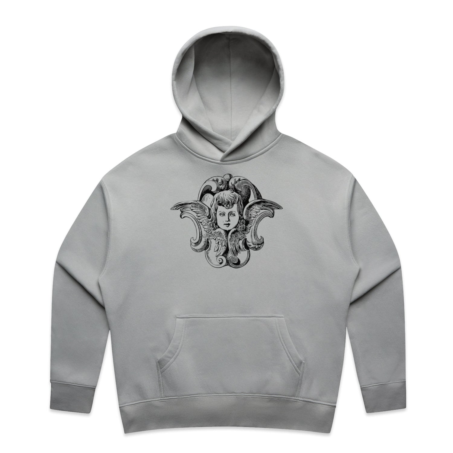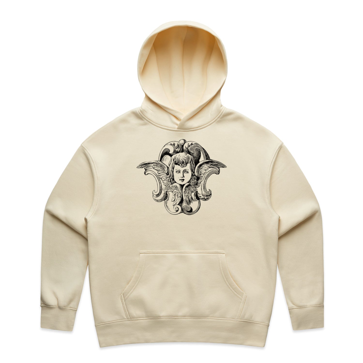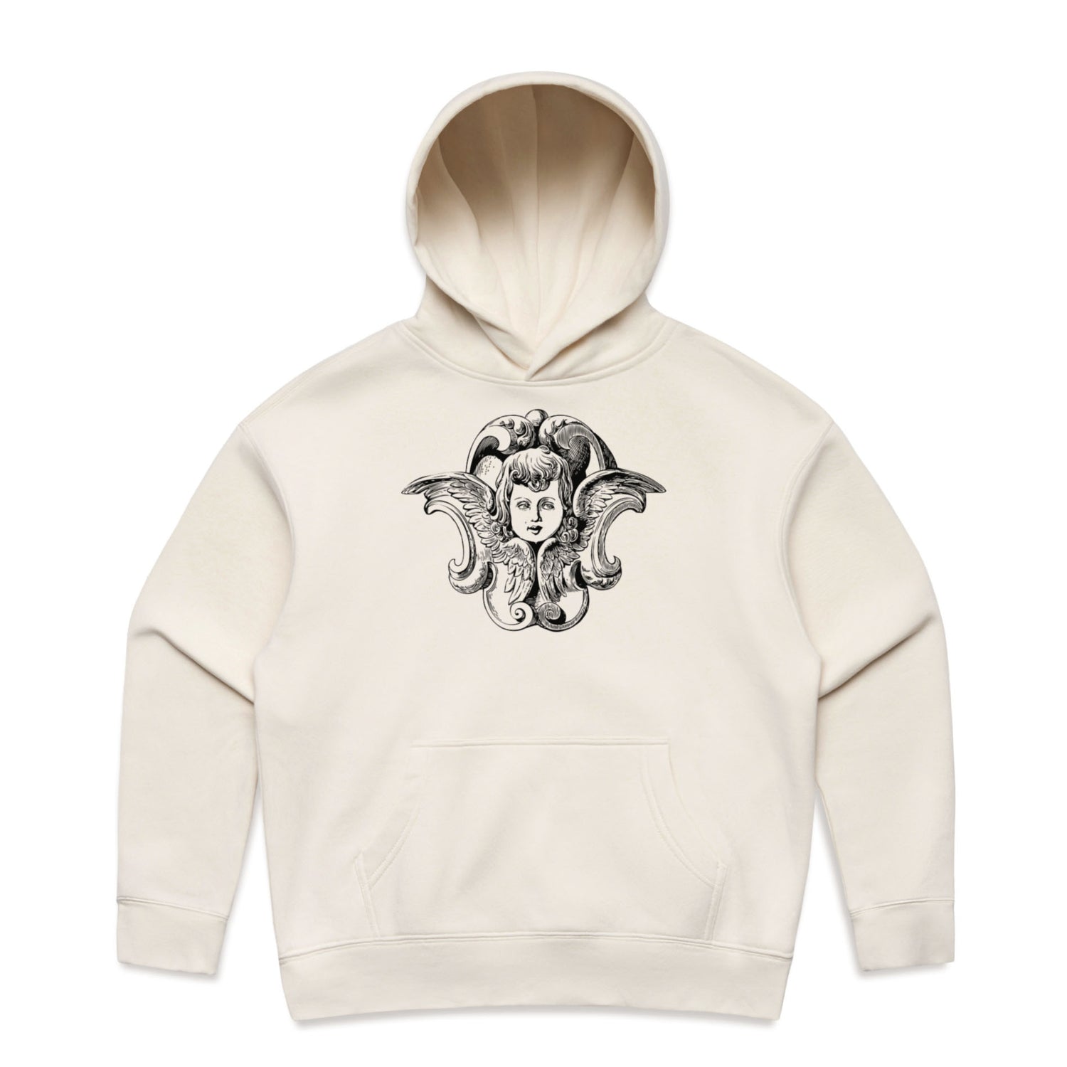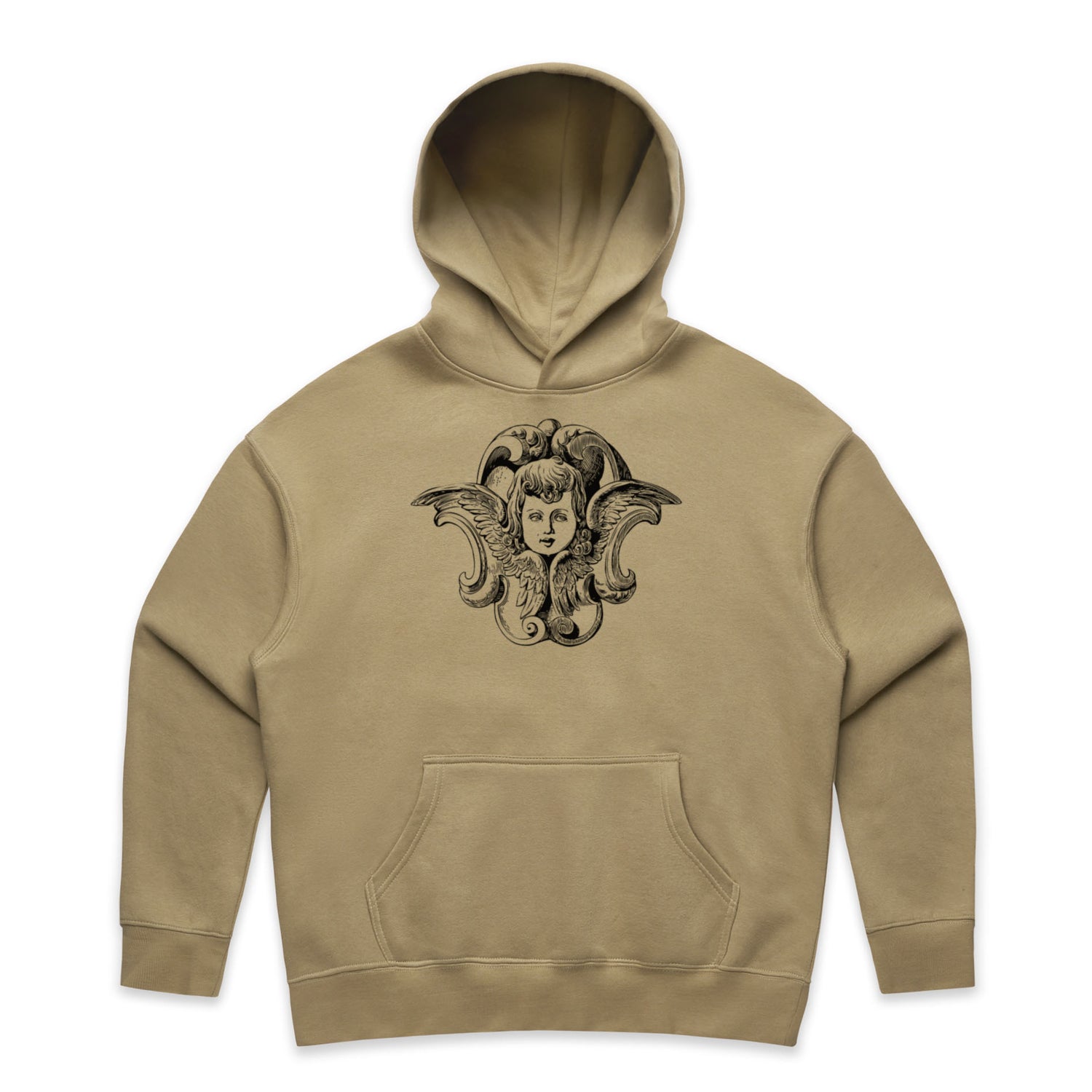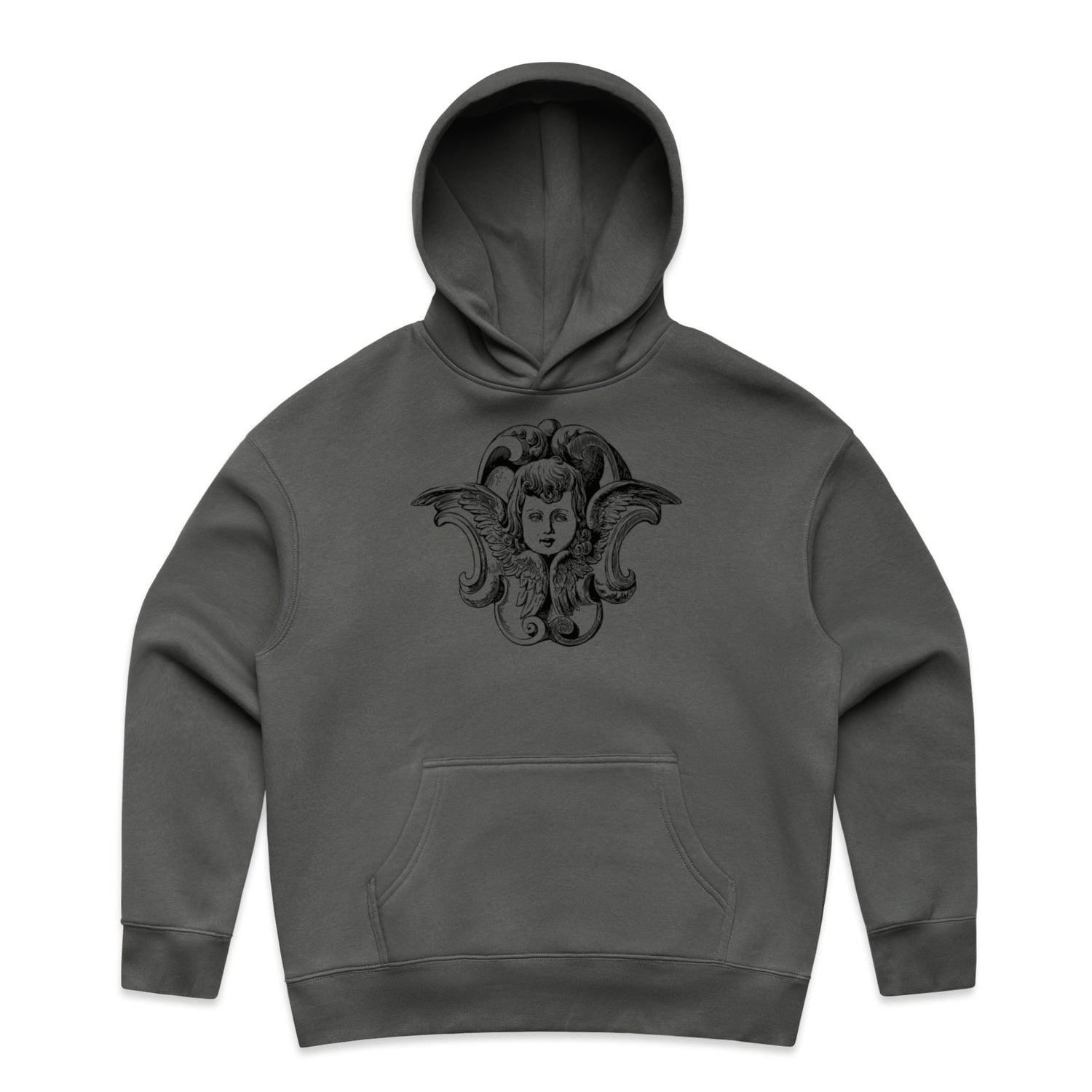 It’s got a roomy pullover hood, your perfect kangaroo pocket buddy, and those cool drop shoulders that scream casual chic. Plus, we're giving a nod to Mother Earth by saving about 7.2 plastic bottles from landfill with every piece—how good is that? The print, a cheeky Cupid carving, comes in a slick black ink, adding that perfect pop of personality on top of a classic or faded vintage colour of your choice.