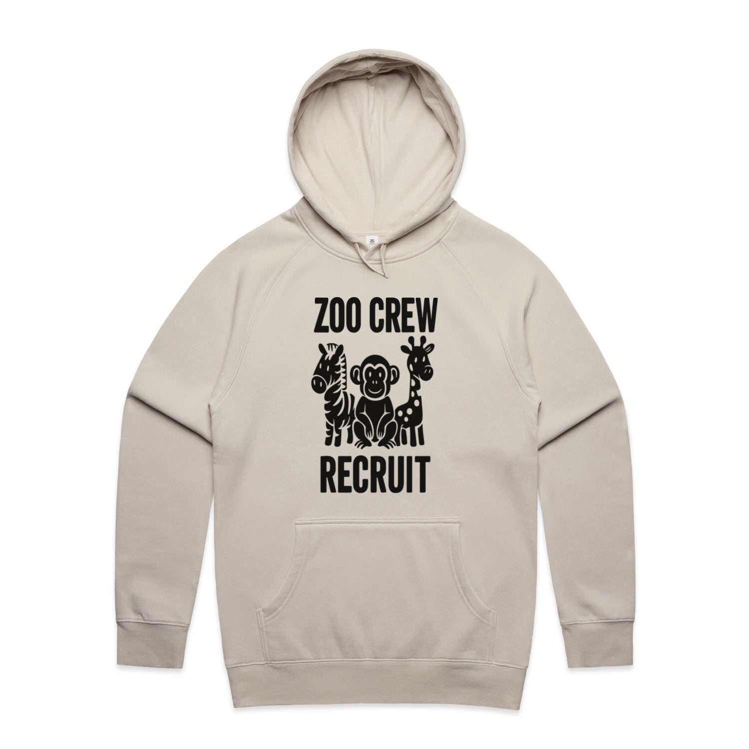 The Hoodies Zoo Crew Recruitment – Men's Hooded Sweatshirt is a high-quality men's hooded sweatshirt, printed with black ink on the trusted AS Colour Supply Hood 5101. With a regular fit and mid-weight feel, it's crafted from a premium blend of 80% cotton and 20% polyester anti-pill fleece, making it a durable and comfortable staple for any wardrobe. The pullover design features raglan sleeves, a lined hood with tonal drawcord, ribbed sleeve cuffs, and a roomy kangaroo pocket — all designed to keep you warm while looking effortlessly sharp.